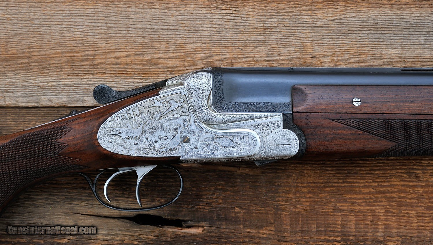 Description: AyA - Sidelock - 12 ga - Item Number: AYA411873 Shotgun type: O&U Action: Sidelock Ejectors: Yes Trigger: Double Grip: Prince of Wales grip Forend: Checkered Lop: 14 3/4 " Pad thickness: " Type of butt: Checkered Wood Drop comb: 1 1/2 " Drop heel: 2 3/8 " Cast amount: 3/16 " Cast: Off Weight: 7 lbs, 12 oz Manufactured in: Spain Finish: Coin Overall condition: Very Good Stock condition: Very Good Metal condition: Very Good Stock: Original finish Metal: Original finish Type of Case: none Extra barrels: 0 Barrel info: Gauge: 12 ga Chamber: 2 3/4 " Length: 28 " Chokes: M/XF Rib type: Ventilated Comments : Solid gun with some light handling marks. SG-91 SOLD |
