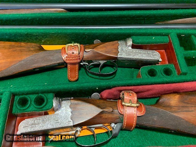 Description: AyA SxS Pair 12g 25" PRICE DROP 09-03-2020. NOW $5995 FROM $6500. MAKE AN OFFER! Very good SN- 562993 and 562994 6 1/2 lbs Comb 1 1/2" Heel 2 3/8" LOP 14 1/2" to leather pad Cast 1/4" off 25" bbls 562993 is choked SKT1 and MOD 562994 is choked SKT1 and SKT2 A portion of the rib-end solder is missing at the muzzle of 562993 Double triggers Ejectors Automatic safeties This is a delightful pair of heavily engraved Spanish Boxlockses with AyA hard case. Some nicks and splits on the wood and nicks on the bbls, but nothing unsightly or structural. Plenty of field use left here. Please call or email for additional photos and information. SOLD |