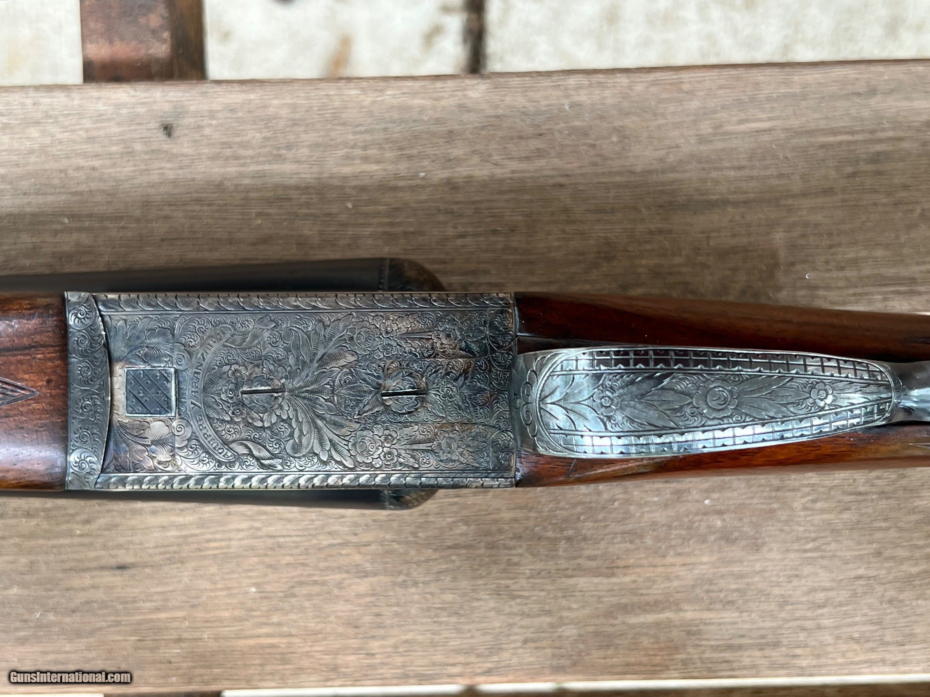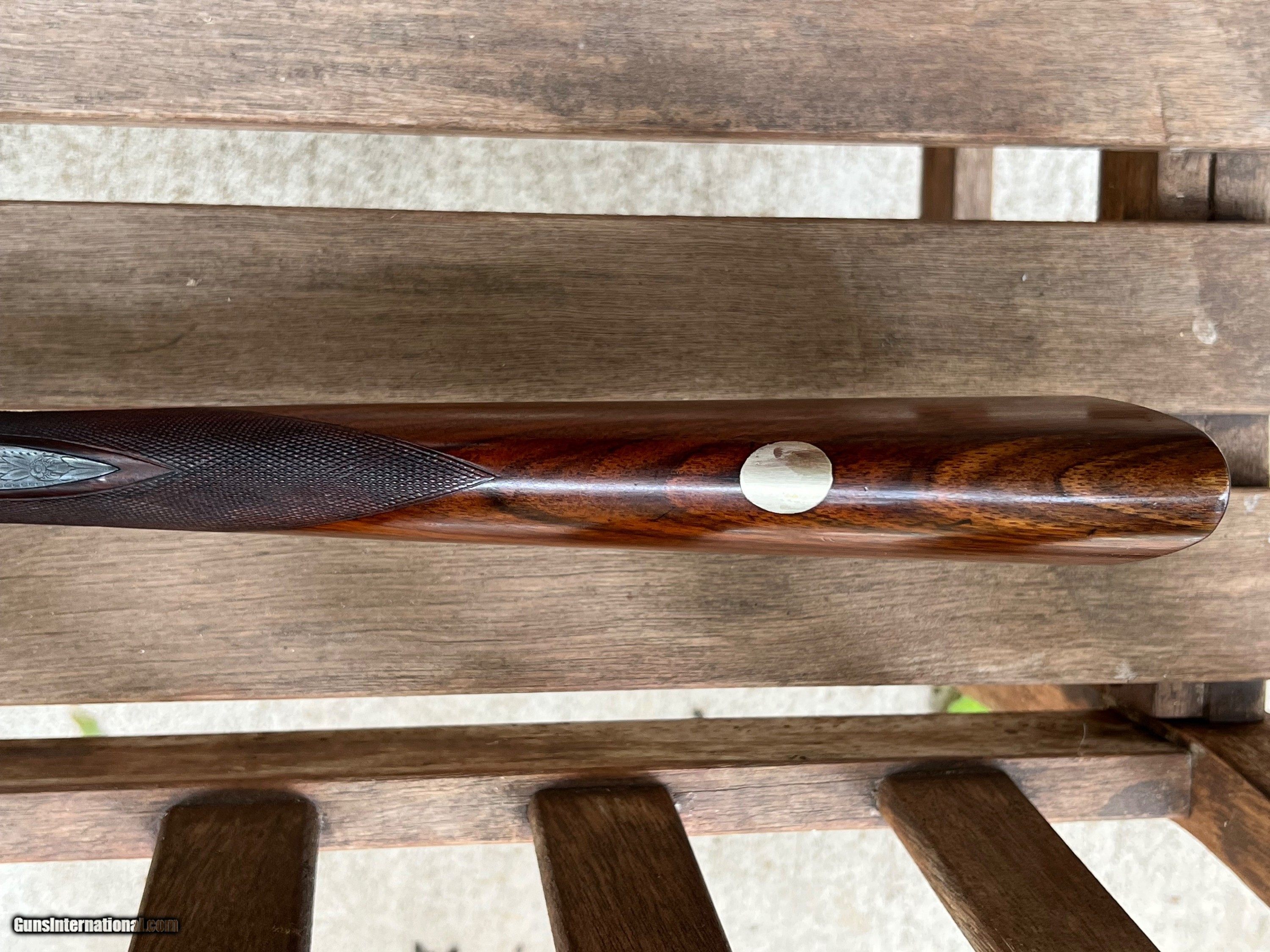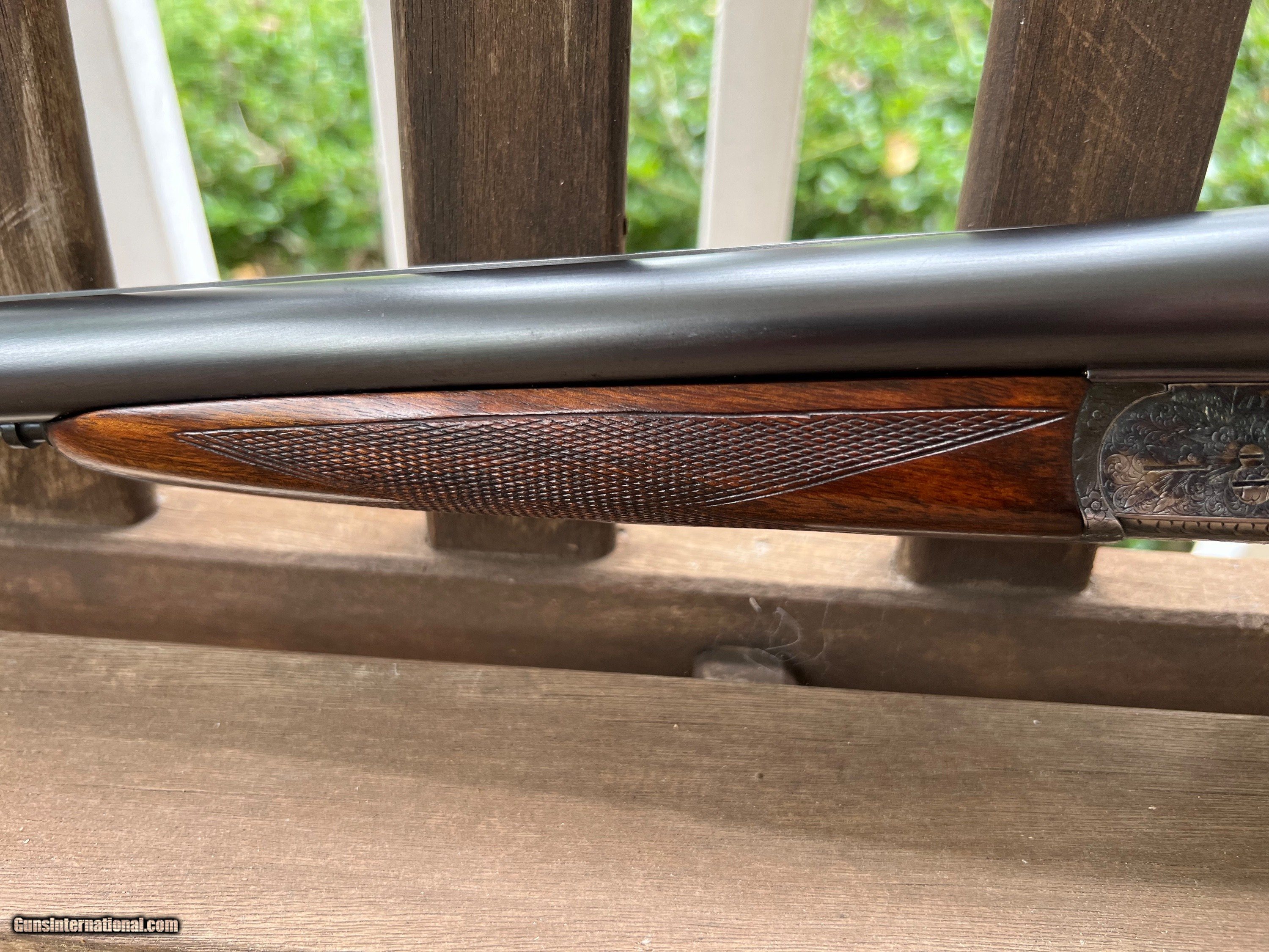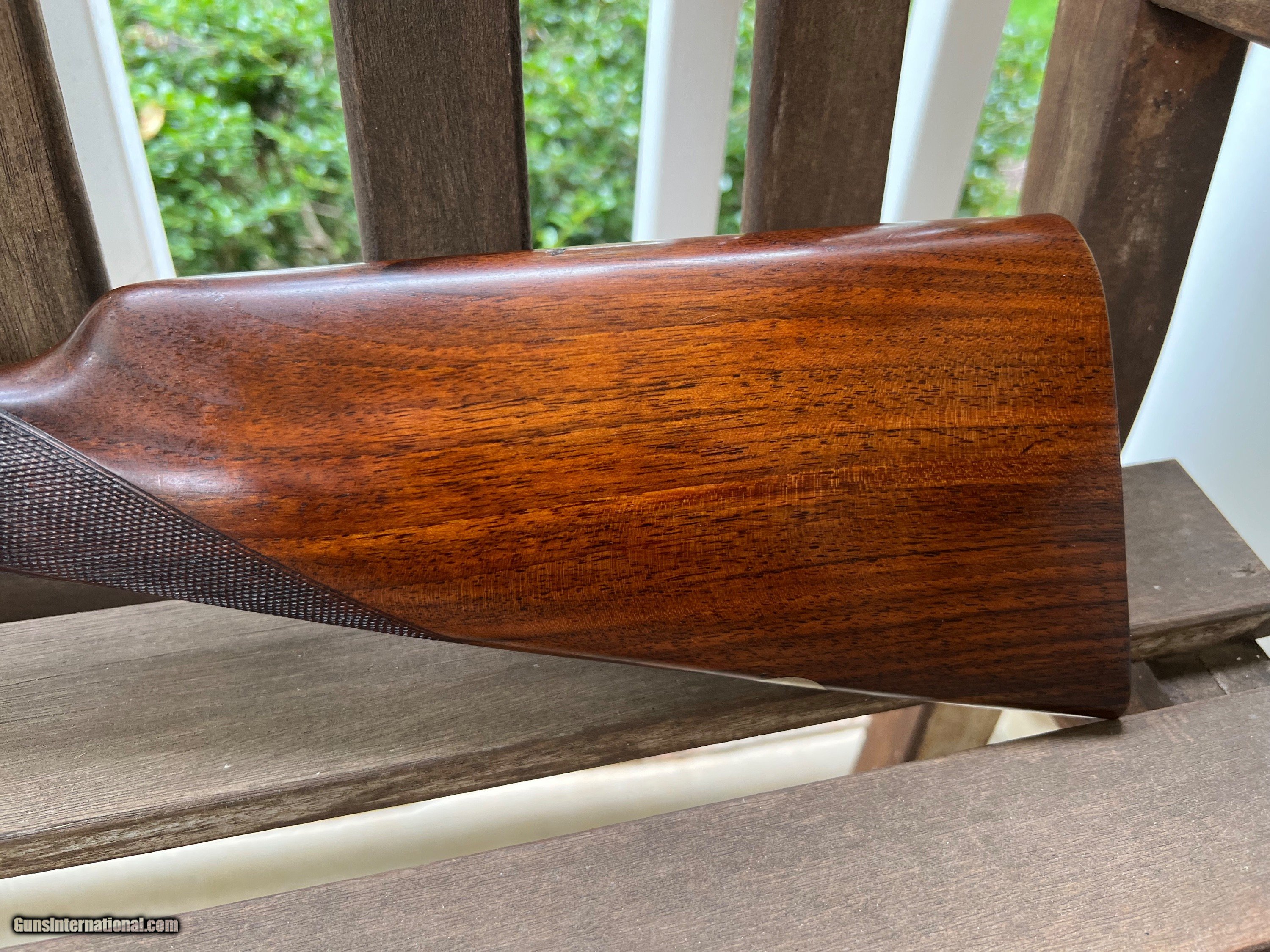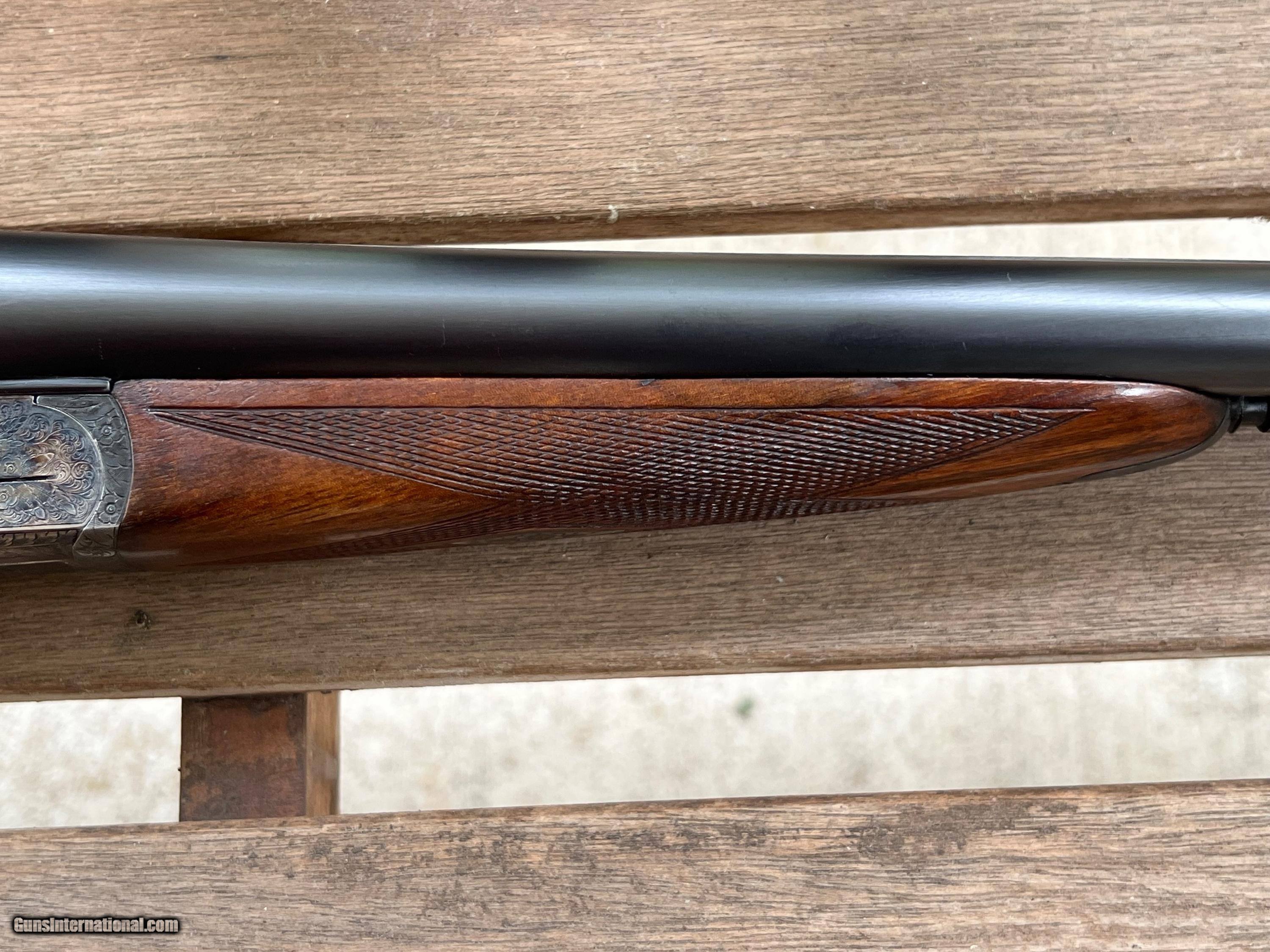 Description: Very high condition AYA XXV in excellent condition with only minor handling marks. The E. J. Churchill XXV was a 25 inch barreled gun developed by the English shooting instructor Robert Churchill and was one of the most famous English guns of the early 20 th century. Excellent mechanical condition, locks up tight and on face, all numbers matching, 100 percent hand cut engraving, chopper lump barrels, strong well timed ejectors, raised hand filed rib and checkered butt. Its 25-inch barrel and great dimensions make this a fast handling bird gun. Barrel is 25 inches choked Modified/Improved Cylinder. Dimensions are 14 1/4 LOP, 1 1/2 DAC and 2 1/4 DAH and the gun weighs in at only six pounds one ounce so it's a pleasure to carry all day. This is a fantastic gun for grouse or woodcock and a joy to hunt with or bust clays. Shipping is $50 and payment is personal check, certified check or postal money order. Three day inspection period. Shipping is $50 and no sales to California. Please see my other listings. SOLD Shotgun Gauge: 12 Gauge Manufacturer: AYA Model: XXV Barrel Length: 25 inch Chambers: 2 3/4 Ejectors: Yes Condition: Excellent Metal Condition: Excellent Wood Condition: Excellent Bore Condition: Excellent Triggers: Two Stock Comb: 1 1/2 Stock Heel: 2 1/4 LOP: 14 1/4 Choke Left: Modified Choke Right: Improved Cylinder Engraving: Hand Cut |