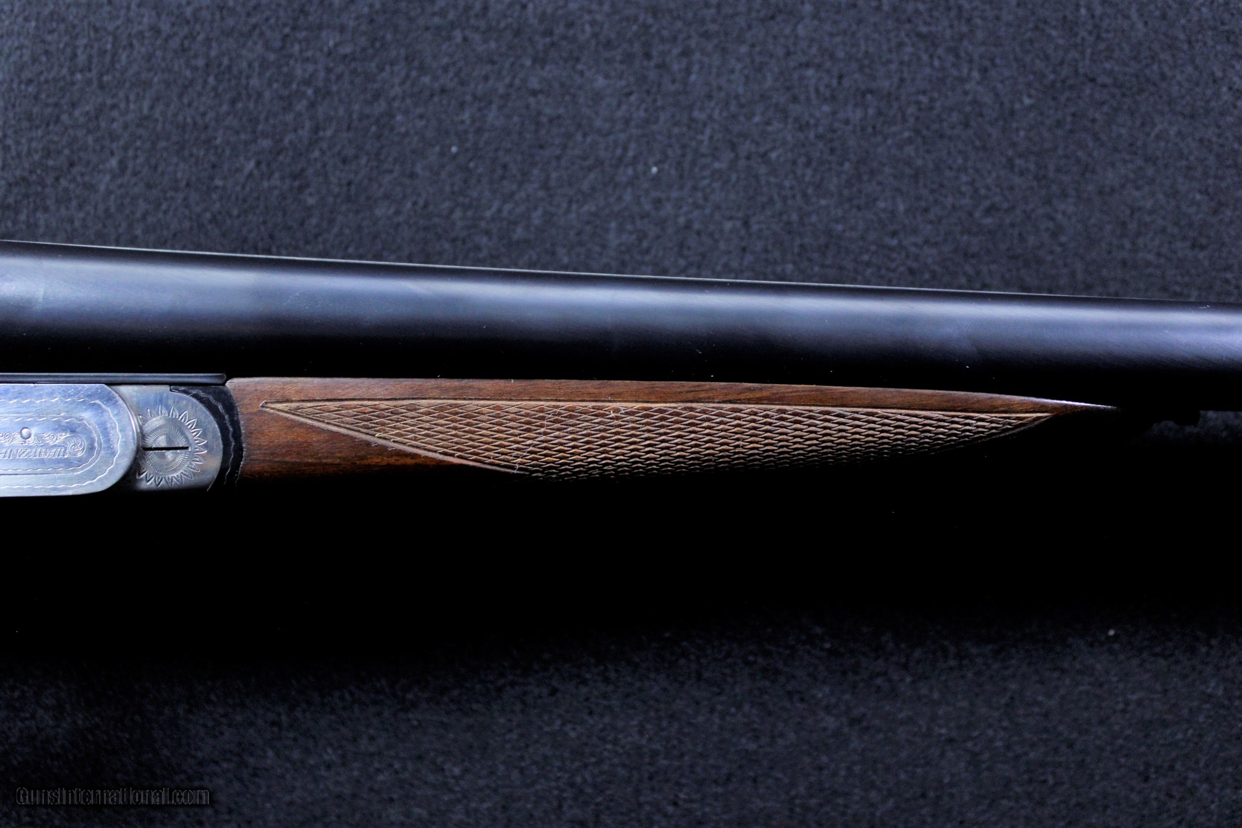 Description: Factory Engraved Aguirre y Aranzabal No. 2 Double Barrel Side Lock Shotgun, 12GA, 28-inch solid rib bbl., blue/casehardened finish, walnut stock on the smooth concave rib, standard barrel markings, Spanish proofs on the flats, 2 3/4 inch chambers, and modified/full chokes. Floral scroll engraved receiver and lock plates with hand removable locks, cocking indicators, Spanish proofs on the water table, dual triggers, and automatic safety. CHeckered splinter forearm with engraved fittings and straight grip stock with teardrop flats and a checkered bare butt. Barrel and stock measurements are: bore diameter at 9 inches from breech .725/.725 inch; minimum wall thickness ..037/.037 inch; drop at comb 1 5/8 inches; drop at heel 2 1/2 inches; length of pull 14 1/4 inches. CONDITION: Very good 95% plus original blue finish remains on the barrels with some light dings and handling marks. The receiver and lock plates have an overall bright silvered patina with some light spotting and freckling. The wood is excellent and some small scattered dings. Mencanacially excellent. On Sale! Was $6495 Now $5199.95 SOLD |