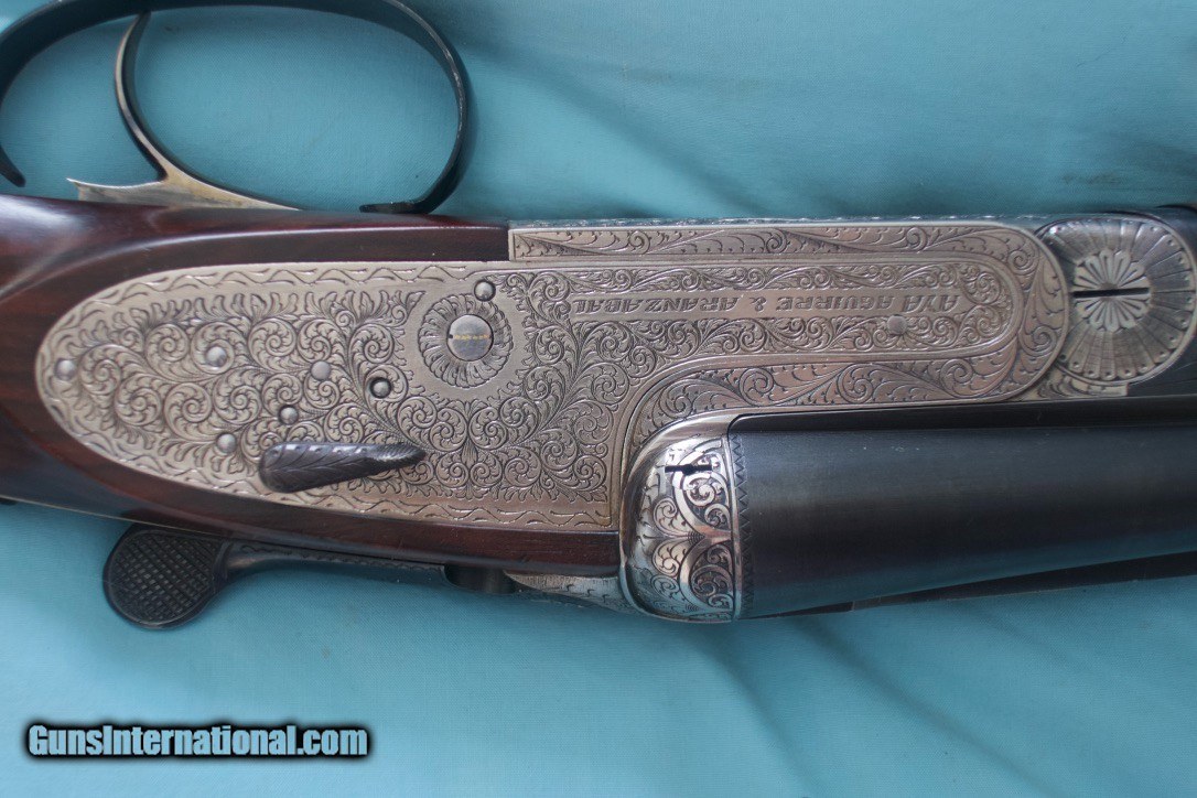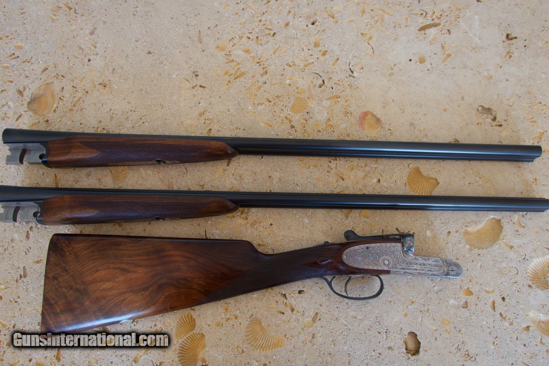 Description: Beautiful AYA two barrel set; 28 gauge & 410 bore. NO 2 sidelock, with coin finished receiver, full scroll engraving, single trigger, ejectors, straight grip, 14" LOP to checkered butt. Barrels are 27", choked IC & MOD. Both barrels have their own beavertail forends. Serial # 580759. Gun has had very little use. Gold oval in stock. Americase Aluminum case for receiver and both barrel sets. Very clean and desirable bird gun. About 5 1/2 lbs. Great stock color and figure . SOLD Shotgun Gauge: 28 Gauge, .410 Gauge Bore: 28 & 410 Ejectors: yes Condition: excellent Metal Condition: excellent 95% Barrels: 27 Triggers: single |