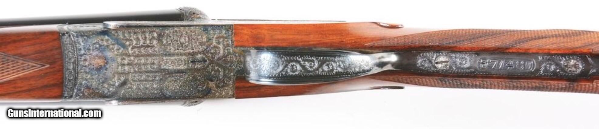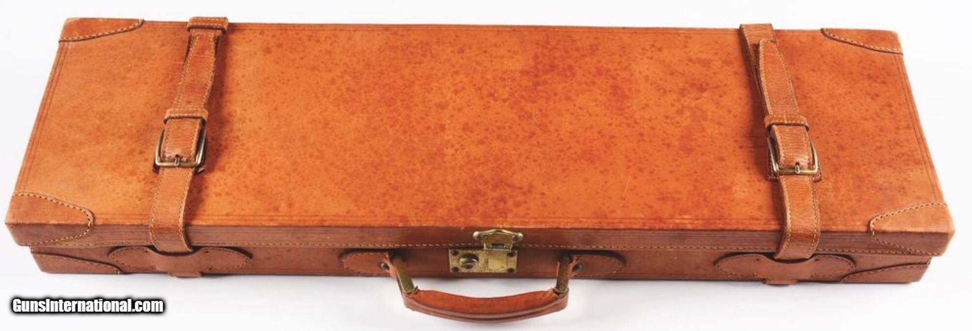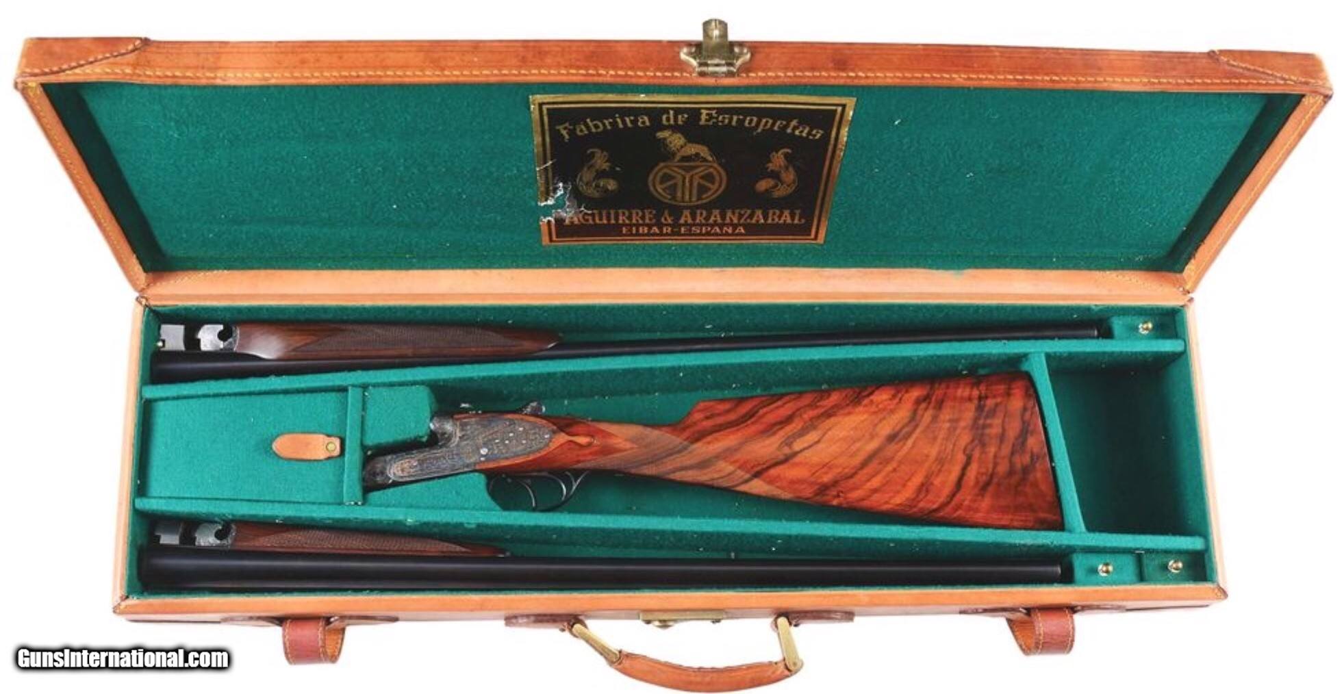 Description: Aguirre y Aranzabal AYA Model 56-E 20ga. Shotgun 2 Bbl set. . SN 371xxx. This gun is one of AYA's highest grade guns, and is exceptionally well fitted and finished. 26" barrels with 2 - 3/4" chambers and 28" barrels with 3" chambers. Both are of chopper lump construction, and have raised, matted, solid ribs. Each barrel set has its own dedicated forend; 26" barrels have splinter ejector forend with Anson release, and 28" barrels have a beavertail ejector forend with Deeley release. Barrel Wall Thickness: 26: L .042 R .041 28": L .039 R .039 Chamber:26" 2 - 3/4" and 28" are 3" Choke: 26" L. .011 (lt mod) R.003 (IC) 28" L. .028 (full) R .016 (mod) Rear portions of ribs are gold inlaid "1" and "2". AYA name and "MADE IN SPAIN" are rolled on tops of right barrels. Case hardened Holland & Holland design sidelock action, features automatic safety, hidden third fastener, side clips, bushed strikers, Purdey type vented breeches, engraved line tumbler end cocking indicators, and double triggers (front articulated). Action and lockplates are engraved with near full coverage very well executed multi-sized scroll surrounding rose bouquets. Bottom of action is engraved with makers name and "EIBAR". Blued top lever and single beaded trigger guard are also scroll engraved. Serial number is on trigger guard tang. Striking, nicely fiddle figured and dark marbled carmel toned European walnut straight grip buttstock measures 15-1/16" over checkered wood butt, and features classic drop points and borderless point pattern checkering at grip. DAC 1 - 1/2" DAH: 2 - 11/16" 3/8"Cast-off.. Weight: 6 lbs 4oz (w/26”), 6lbs11oz w/ 28” Gun and barrels are properly cased in tan leather trunk case with stitched leather corners, lined in green felt. A gold embossed black paper AYA label is in lid. CONDITION: Excellent with evidence of limited field use. Barrels retain over 95% original blue with some scattered light scratches. Action retains 70 - 80% original case hardening colors, silvered on fences and beads, thinning a bit on bottom. Lockplates retain essentially all of their original color. Stocks retain nearly all of their original hand rubbed oil finish with scant light handling marks. Bores are excellent. Mechanically excellent. Case is very good with slight rubbing to interior label corner. The model 56-E is one of AYA's highest grade guns, and was exceptionally well fitted and finished. The wood and engraving is absolutely spectacular on this gun. Gentlemen, this is truly one of the best AYA game guns we have ever seen! FFL required. Buyer to pay flat $85 S/H/I SOLD Manufacturer: AYA Model: 56-E Gauge Info: 20ga |