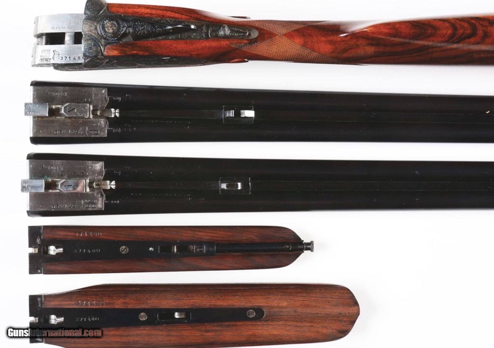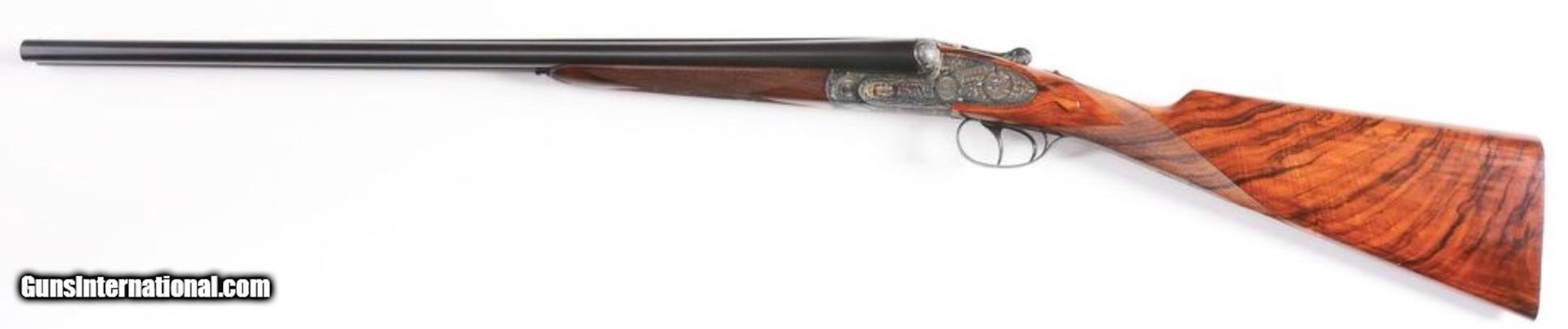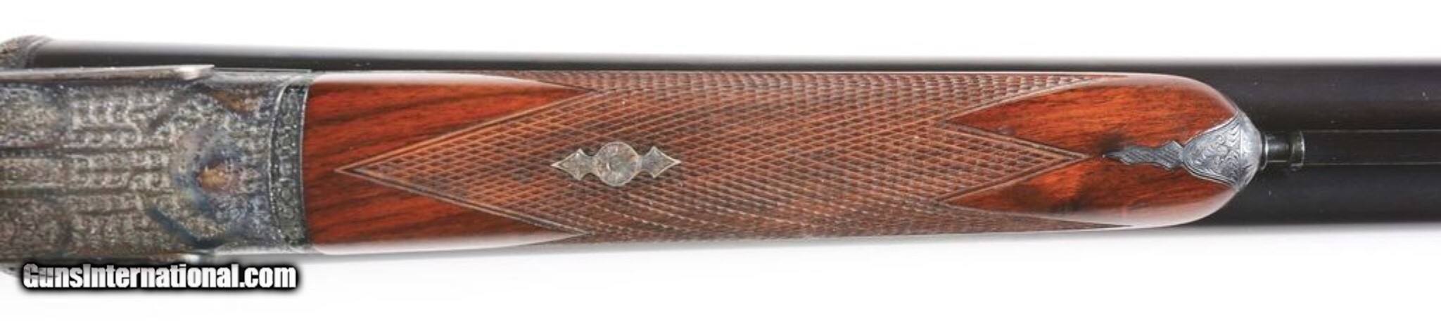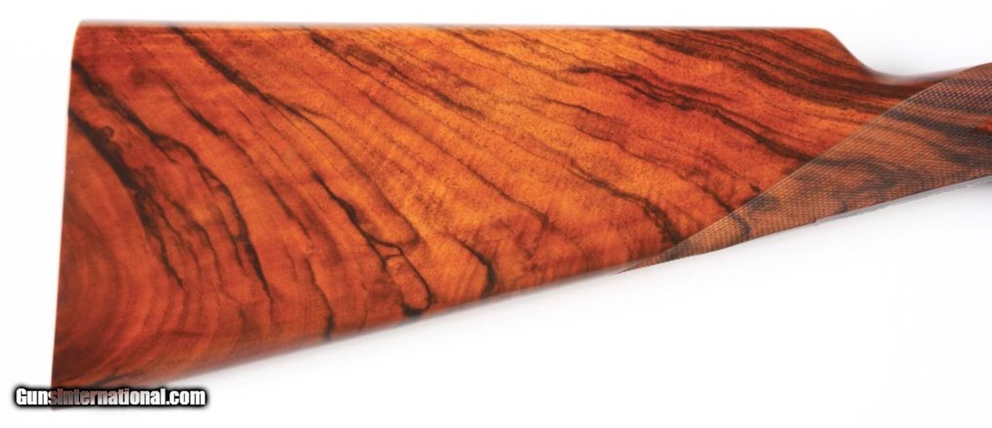 Description: Aguirre y Aranzabal AYA Model 56-E 20ga. Shotgun 2 Bbl set. . SN 371xxx. This gun is one of AYA's highest grade guns, and is exceptionally well fitted and finished. 26" barrels with 2 - 3/4" chambers and 28" barrels with 3" chambers. Both are of chopper lump construction, and have raised, matted, solid ribs. Each barrel set has its own dedicated forend; 26" barrels have splinter ejector forend with Anson release, and 28" barrels have a beavertail ejector forend with Deeley release. Barrel Wall Thickness: 26: L .042 R .041 28": L .039 R .039 Chamber:26" 2 - 3/4" and 28" are 3" Choke: 26" L. .011 (lt mod) R.003 (IC) 28" L. .028 (full) R .016 (mod) Rear portions of ribs are gold inlaid "1" and "2". AYA name and "MADE IN SPAIN" are rolled on tops of right barrels. Case hardened Holland & Holland design sidelock action, features automatic safety, hidden third fastener, side clips, bushed strikers, Purdey type vented breeches, engraved line tumbler end cocking indicators, and double triggers (front articulated). Action and lockplates are engraved with near full coverage very well executed multi-sized scroll surrounding rose bouquets. Bottom of action is engraved with makers name and "EIBAR". Blued top lever and single beaded trigger guard are also scroll engraved. Serial number is on trigger guard tang. Striking, nicely fiddle figured and dark marbled carmel toned European walnut straight grip buttstock measures 15-1/16" over checkered wood butt, and features classic drop points and borderless point pattern checkering at grip. DAC 1 - 1/2" DAH: 2 - 11/16" 3/8"Cast-off.. Weight: 6 lbs 4oz (w/26”), 6lbs11oz w/ 28” Gun and barrels are properly cased in tan leather trunk case with stitched leather corners, lined in green felt. A gold embossed black paper AYA label is in lid. CONDITION: Excellent with evidence of limited field use. Barrels retain over 95% original blue with some scattered light scratches. Action retains 70 - 80% original case hardening colors, silvered on fences and beads, thinning a bit on bottom. Lockplates retain essentially all of their original color. Stocks retain nearly all of their original hand rubbed oil finish with scant light handling marks. Bores are excellent. Mechanically excellent. Case is very good with slight rubbing to interior label corner. The model 56-E is one of AYA's highest grade guns, and was exceptionally well fitted and finished. The wood and engraving is absolutely spectacular on this gun. Gentlemen, this is truly one of the best AYA game guns we have ever seen! FFL required. Buyer to pay flat $85 S/H/I SOLD Manufacturer: AYA Model: 56-E Gauge Info: 20ga |