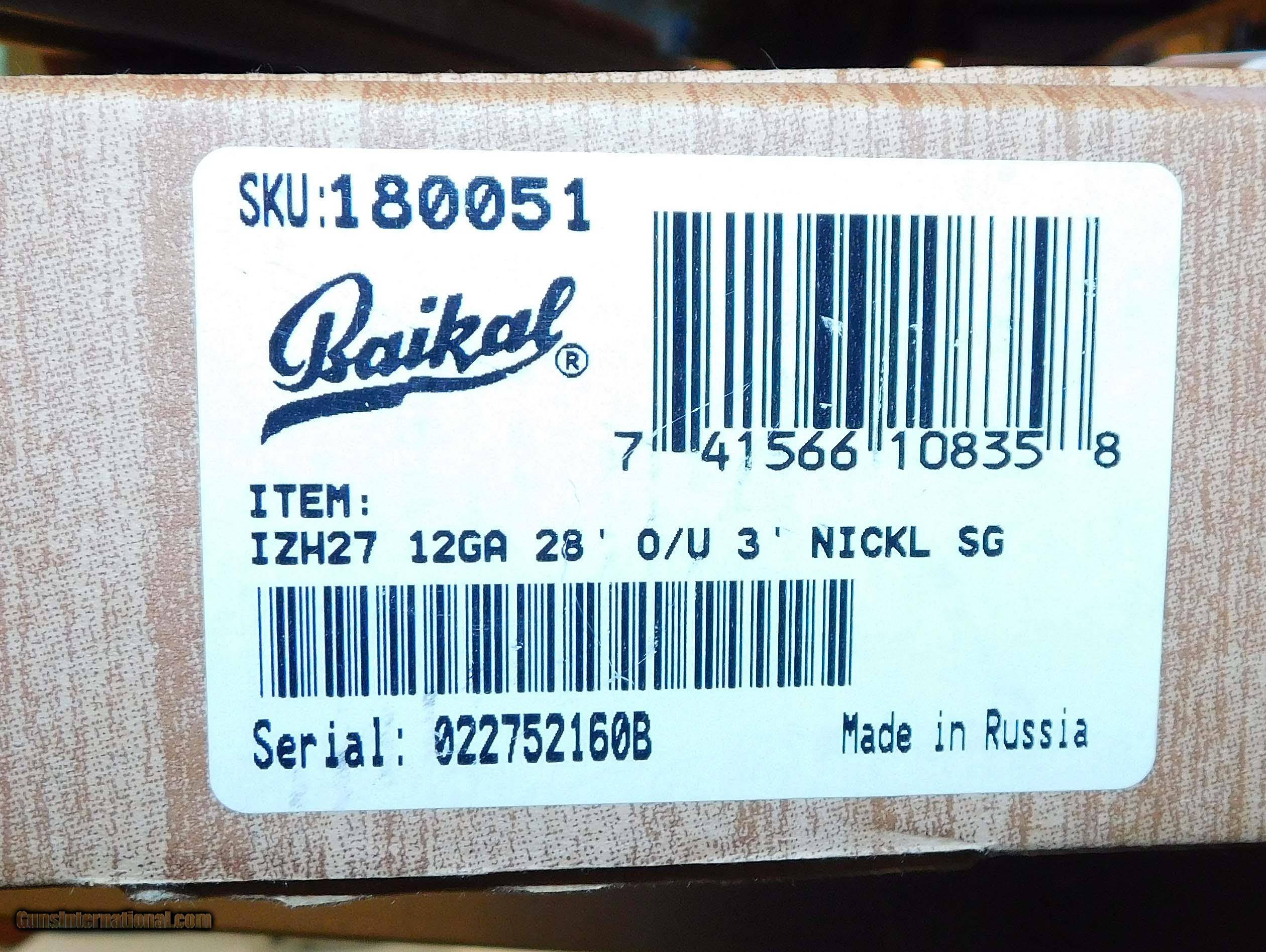 Description: BAIKAL 17H27EM-1C (OVER UNDER) IN 12 GA. CAL., WITH 28" BARREL. COLOR STAINLESS. CONDITION NEW UNFIRED. SERIAL NUMBER 022752160B. BAIKAL MODEL 17H27EM-1C (OVER UNDER), COMES WITH THREE SCREW IN CHOKES, MODIFIED, IMPROVED, AND FULL, WITH BOX AND PAPERS, NEW UNFIRED OVERALL CONDITION, OUR STOCK # D5564 SOLD |