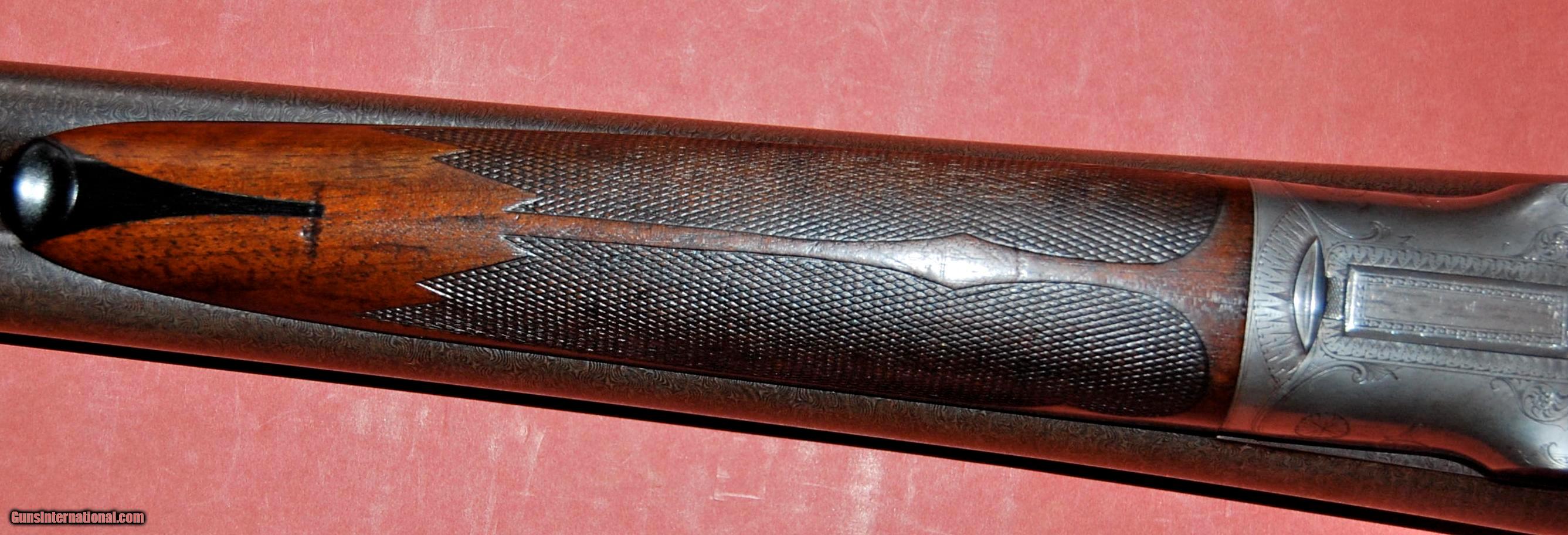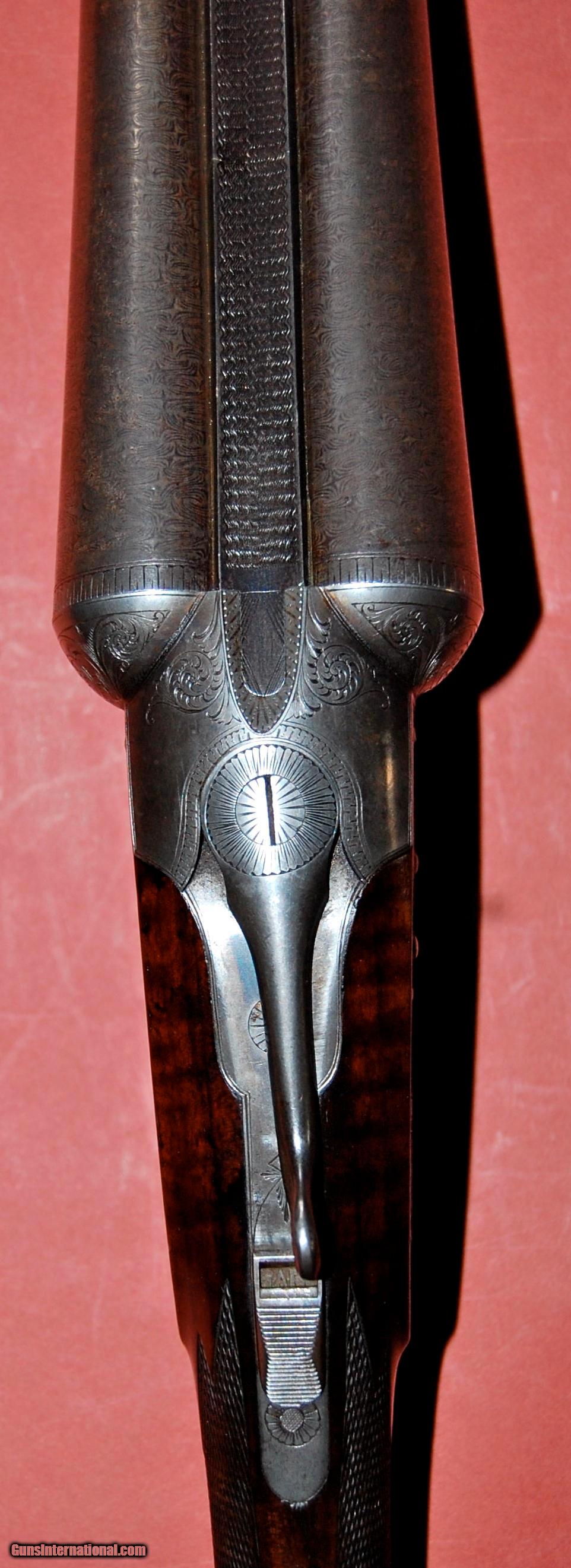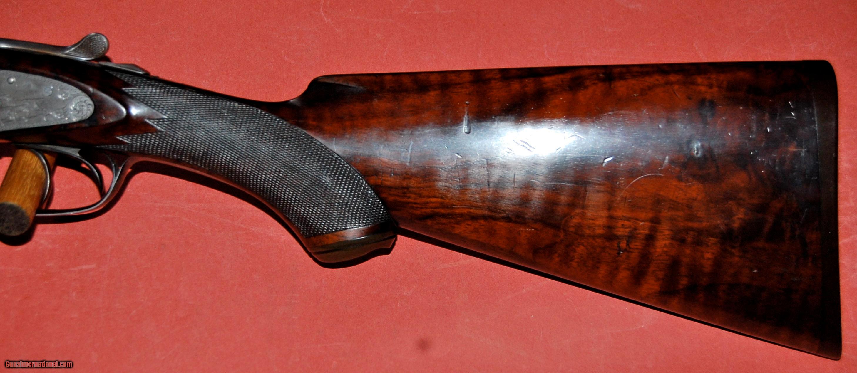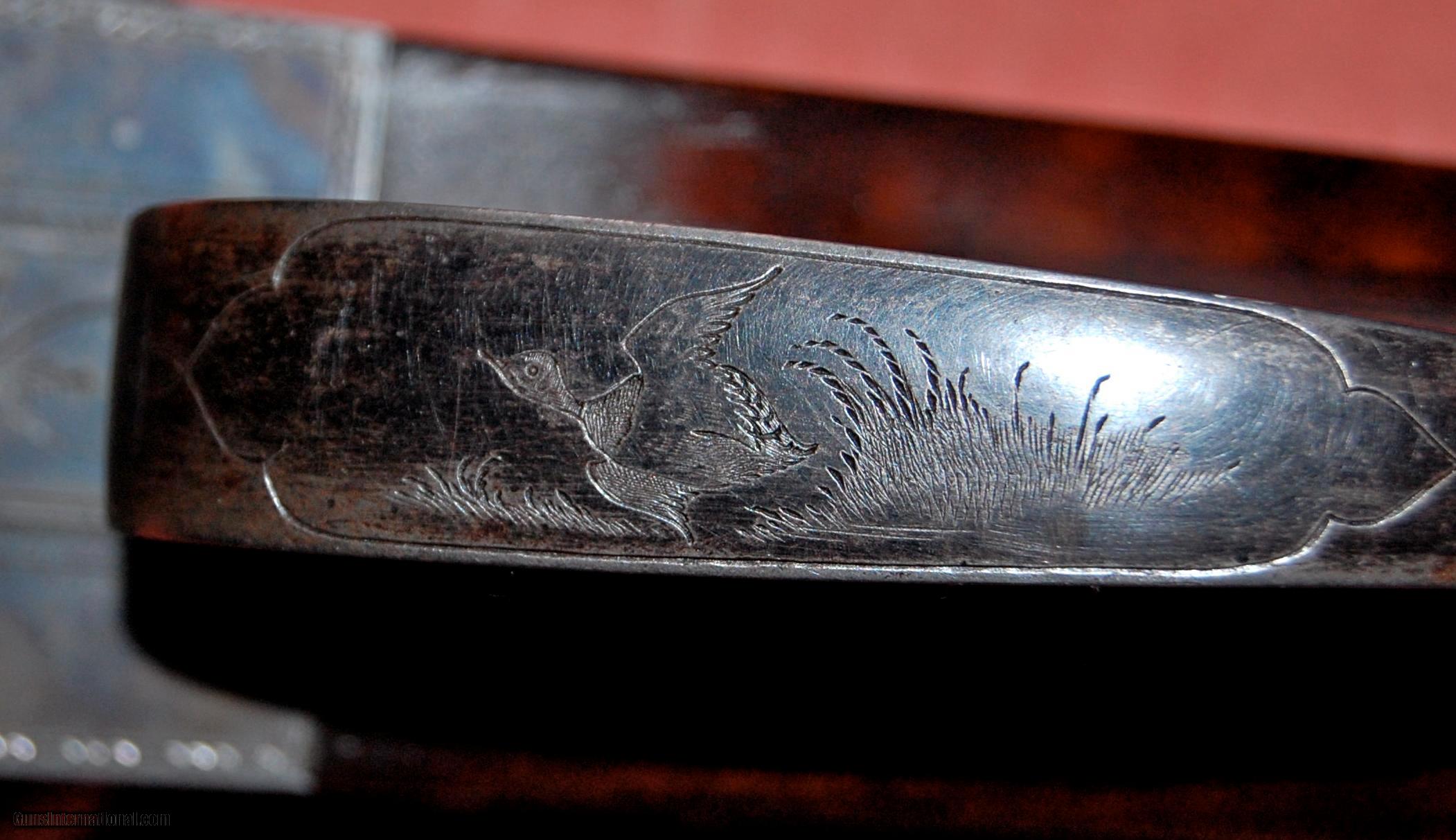 Description: A beautiful all original Baker Paragon grade built in 1896.This gun is in truly outstanding condition,retaining at least 50% of the original case colors,98% of the original damascus finish,and 95% of the original wood finish.The barrels are fine damacus and are 28" long and choked full (,030") and full (.030").The bores are perfect with no rust,dents,or pitting.The bore diemeters are .720" and the chambers are original 23/4".The wall thickness averages over .038" with the thinnest point I could find being .033".I have shot sporting clays with this gun using federal trap loads.The barrels lock up tightly with no play at all.The sidelocks are beautifully engraved featuring pointers on one side and setters on the other.There is a single quail on the bottom of the receiver and a single duck on the trigger guard.The wood is sound and free of any cracks or damage.There were only 1300 Paragons built and each one was special ordered so no two are exactly alike.This one is really in collector condition.Take a look at the photos and call if you have any questions.Classified as an antiquer so it can be shipped direct.I just need proof that you are over 21. SOLD Antique: Yes Manufacturer: Baker Gun Co. Model: Paragon Serial Number: 456 Chambers: 23/4 Ejectors: extractors Metal Condition: excellent Wood Condition: excellent Bore Condition: mint Barrel Type: damascus steel Action: double barrel Triggers: Double Gauge Info: 12ga Stock Dimensions: 141/8"x2"x3 Weight: 7-8 Manufacture Date: 1896 Choke Left: full (.030") Choke Right: full (.030") Engraving: dogs and birds |