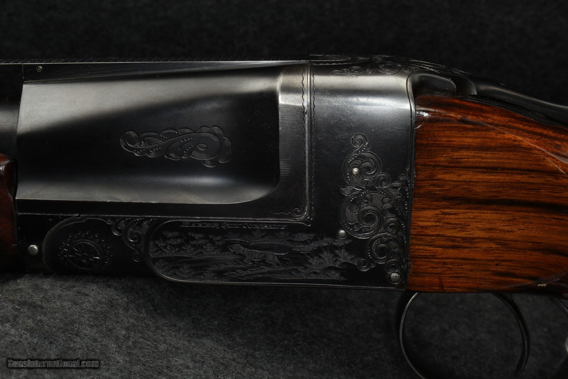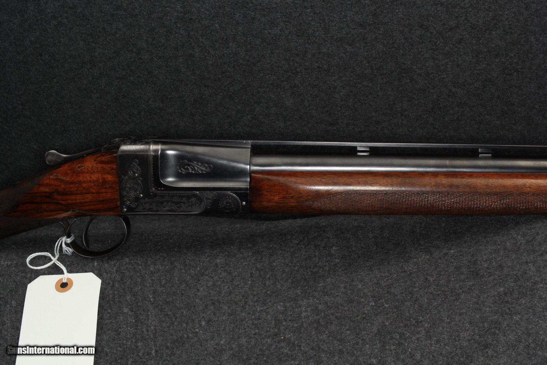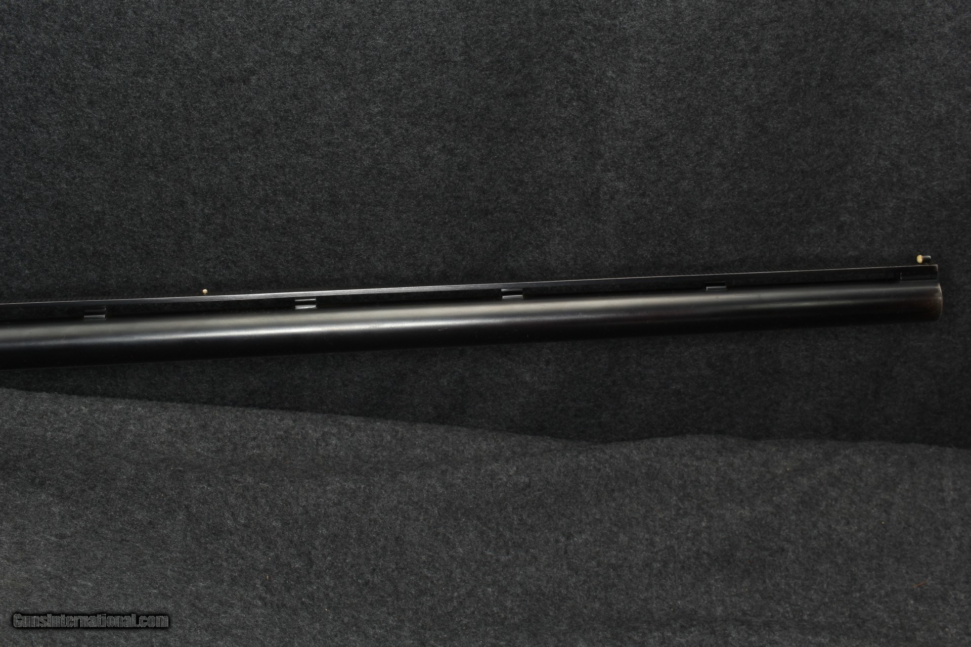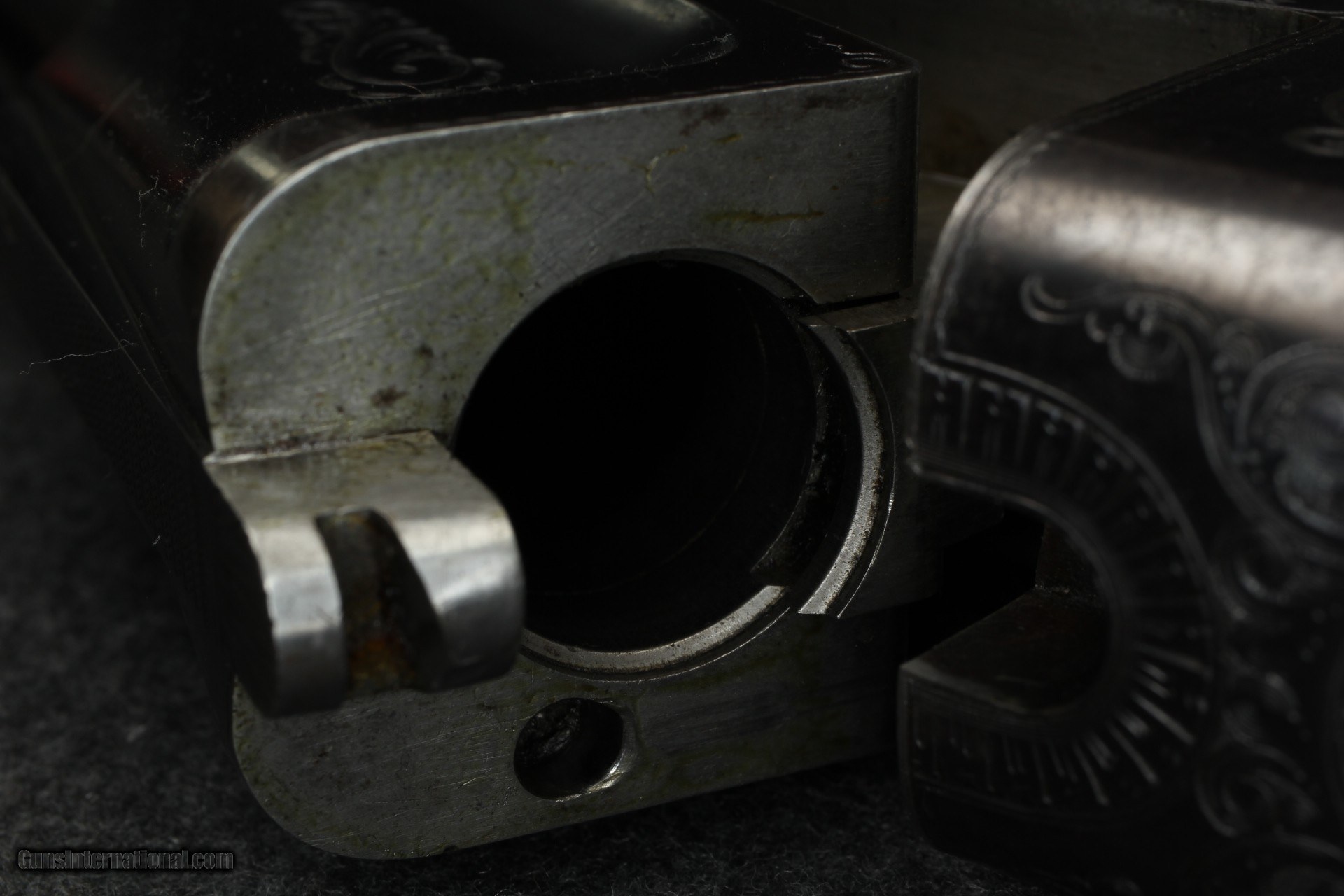 Description: 12ga, serial number 527XX. 2 3/4" chamber, fixed choke full. 30" barrel. LOP 13 1/4" to wood, 14 1/4" to recoil pad with spacer. Receiver shows 70% combination open scroll engraving and hunting dog and rabbit scenes. Retains 80% blue. Barrel retains 75%+ blue with small engraved scene on reinforced breech section. Bore is excellent. Raised rib with ivory beads. Forend shows minor figure and normal wear, no cracks or large marrs. Multi-point checkering pattern with fine checkering. Decent figured buttstock shows marring and poorly installed recoil pad spacer. Overall sound wood. Lower grip tang shows wear, small area of rust. Screwheads show marring. Good lock-up, mechanically sound. More photos on request. Please add $50.00 for shipping and insurance. Will ship direct to C&R holder. SOLD Curio/Relic: Yes Shotgun Gauge: 12 Gauge |