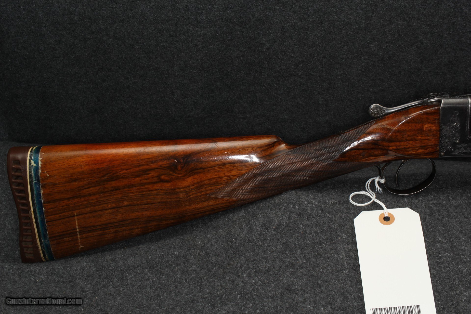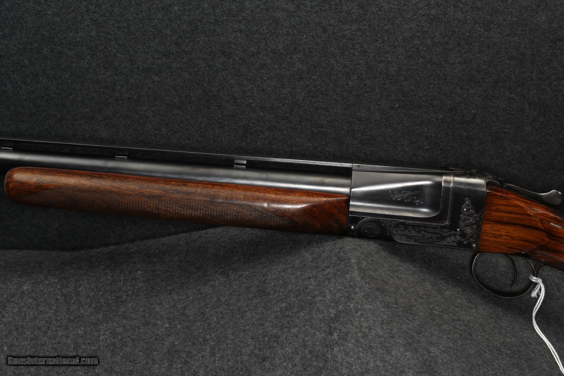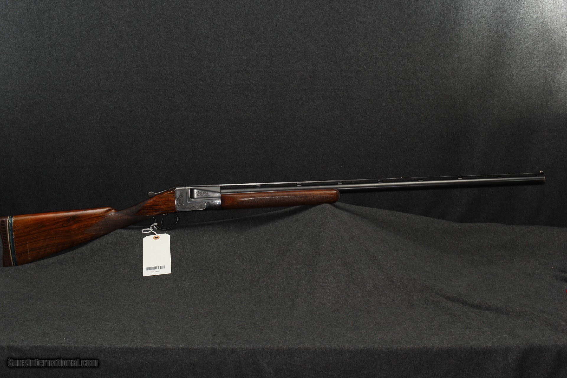 Description: 12ga, serial number 527XX. 2 3/4" chamber, fixed choke full. 30" barrel. LOP 13 1/4" to wood, 14 1/4" to recoil pad with spacer. Receiver shows 70% combination open scroll engraving and hunting dog and rabbit scenes. Retains 80% blue. Barrel retains 75%+ blue with small engraved scene on reinforced breech section. Bore is excellent. Raised rib with ivory beads. Forend shows minor figure and normal wear, no cracks or large marrs. Multi-point checkering pattern with fine checkering. Decent figured buttstock shows marring and poorly installed recoil pad spacer. Overall sound wood. Lower grip tang shows wear, small area of rust. Screwheads show marring. Good lock-up, mechanically sound. More photos on request. Please add $50.00 for shipping and insurance. Will ship direct to C&R holder. SOLD Curio/Relic: Yes Shotgun Gauge: 12 Gauge |