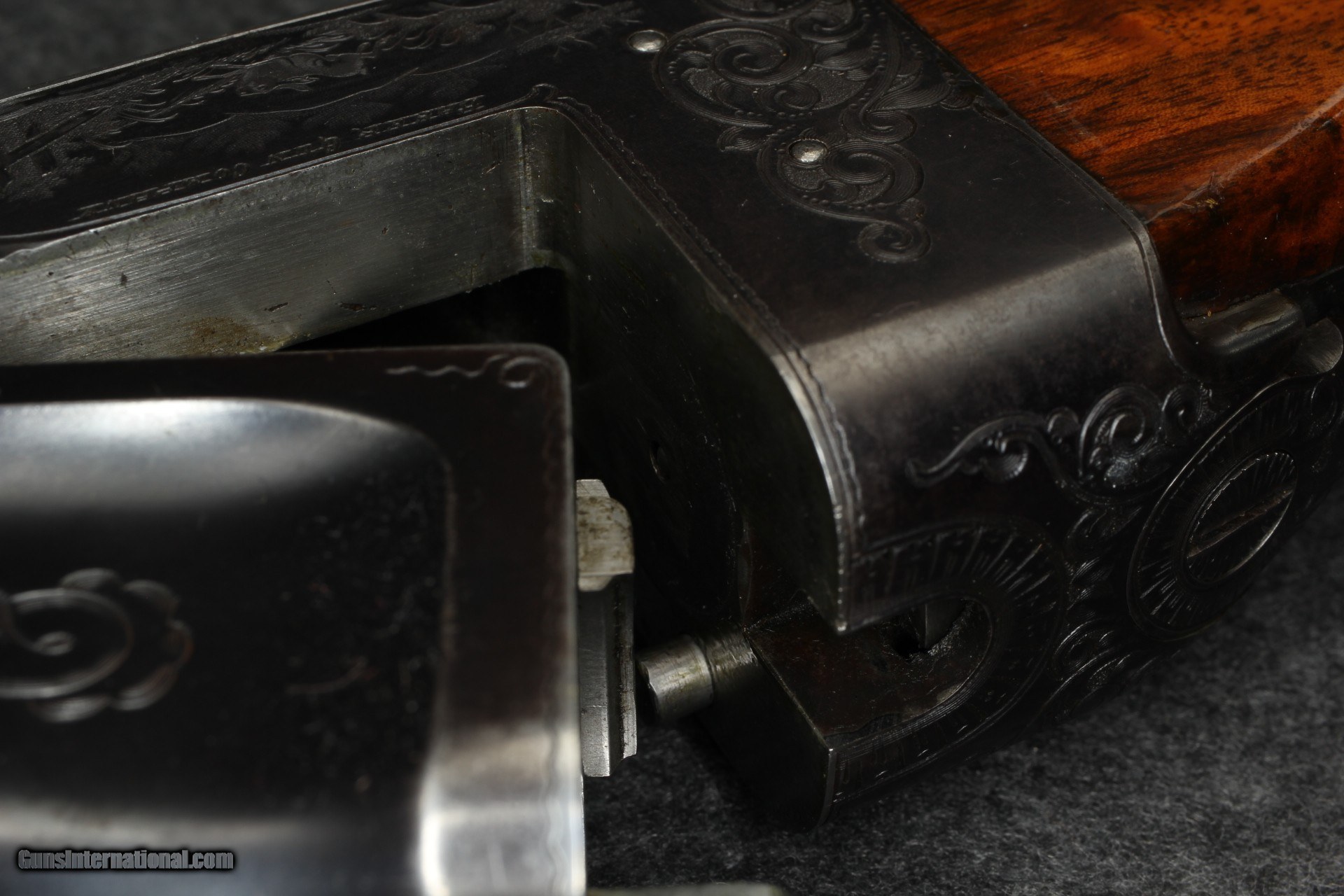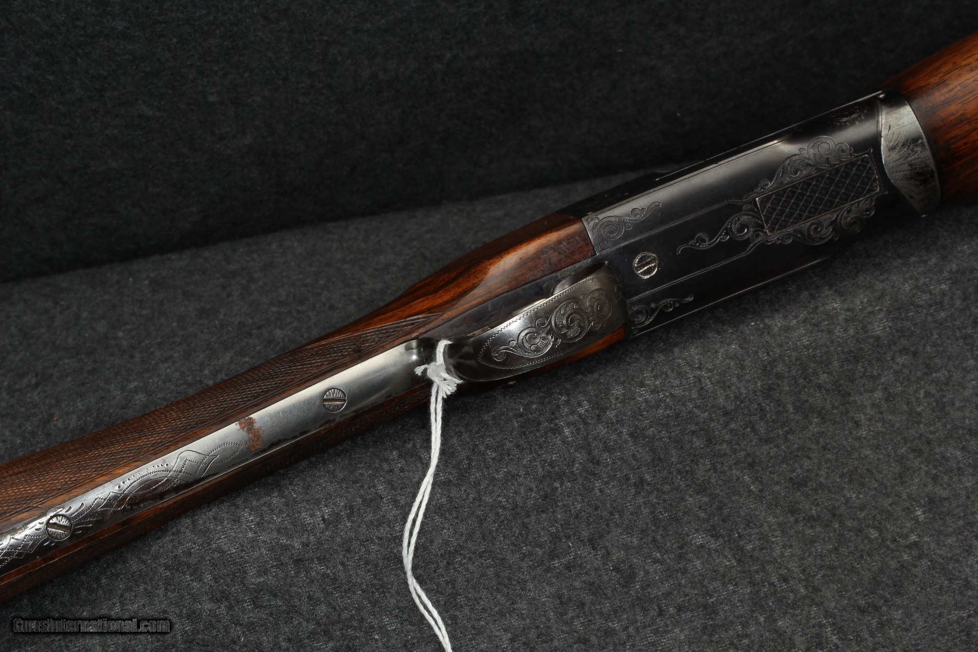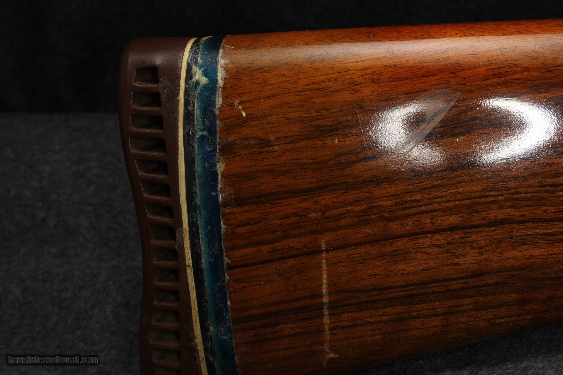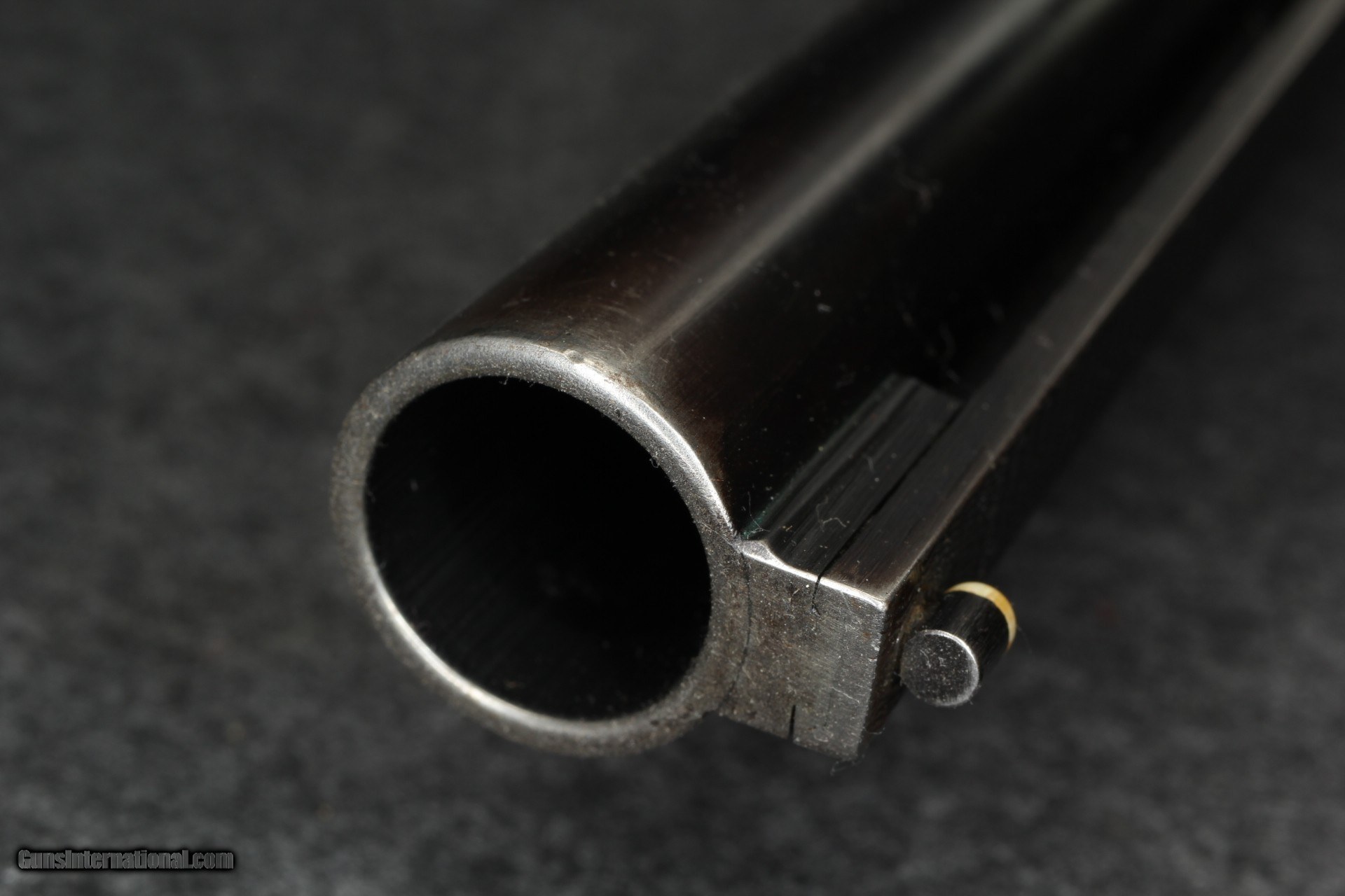 Description: 12ga, serial number 527XX. 2 3/4" chamber, fixed choke full. 30" barrel. LOP 13 1/4" to wood, 14 1/4" to recoil pad with spacer. Receiver shows 70% combination open scroll engraving and hunting dog and rabbit scenes. Retains 80% blue. Barrel retains 75%+ blue with small engraved scene on reinforced breech section. Bore is excellent. Raised rib with ivory beads. Forend shows minor figure and normal wear, no cracks or large marrs. Multi-point checkering pattern with fine checkering. Decent figured buttstock shows marring and poorly installed recoil pad spacer. Overall sound wood. Lower grip tang shows wear, small area of rust. Screwheads show marring. Good lock-up, mechanically sound. More photos on request. Please add $50.00 for shipping and insurance. Will ship direct to C&R holder. SOLD Curio/Relic: Yes Shotgun Gauge: 12 Gauge |