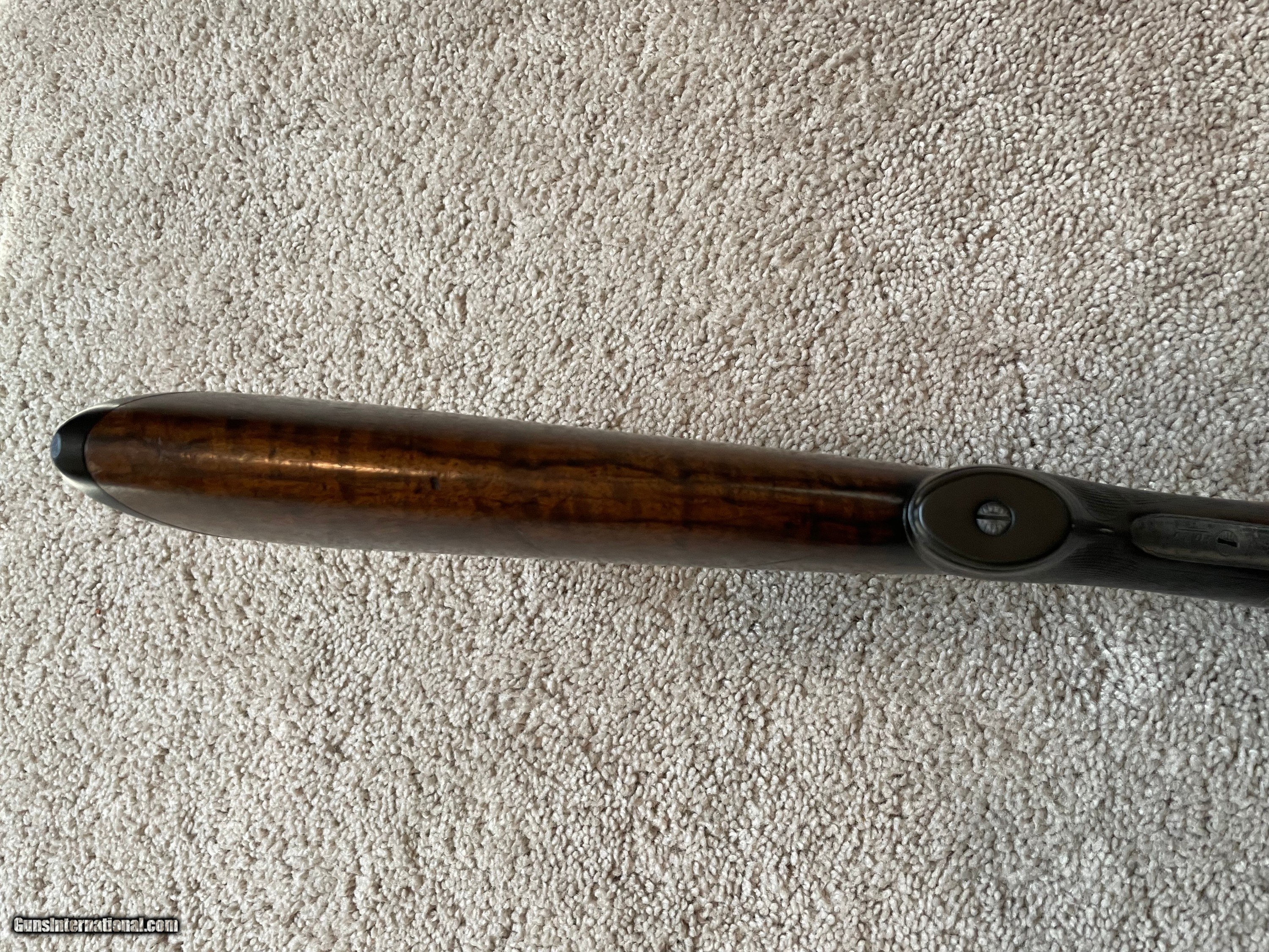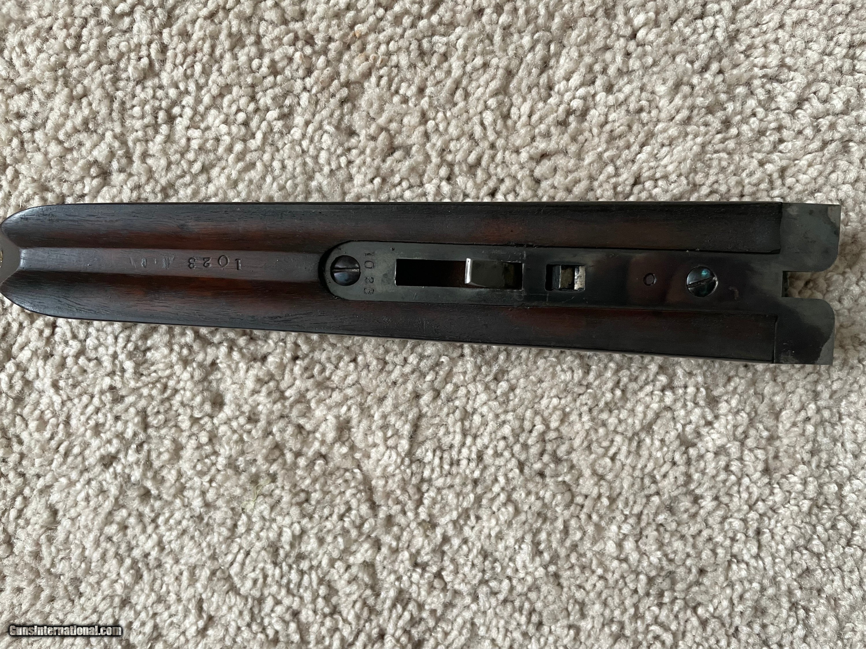 Description: Up for sale is a very original and clean Baker Paragon. 12 gauge,3 pin shotgun from the Baker Gun Co. Serial number indicates date of manufacture between 1892 - 1919, according to data contained in many sources including The Double Gun Journal. Water table and barrel flats are stamped 1023 PD, and all stamped parts have matching serial numbers. Chambers are 2 3/4", high grade 30" damascus barrels are both choked full, with bright shiny bores. Checkering shows typical wear for a gun of this age and there are some scratches on the stock as shown. Drop at heel and comb are typical for the era, and length of pull to front trigger is 14 1/4". Engraving is typical of a Paragon with gun dogs on either side, bird on trigger guard. There is a "Baker" bakelite buttplate. This is a well balanced gun with a weight of just under 8 lbs. UPDATE: Recently shot with low power loads and functioned perfectly. No reasonable offer refused. Payment methods include personal or certified check, money order. Shipping to FFL required, shipping and insurance determined by location. SOLD Curio/Relic: Yes Shotgun Gauge: 12 Gauge Manufacturer: Baker Model: Paragon Serial Number: 1023 Barrel Length: 30 Bore: 12 Gauge Chambers: 2 3/4 Condition: Very Good Metal Condition: Very Good Wood Condition: Very Good Bore Condition: Excellent Barrels: High Grade Damascus Barrel Type: Side X Side Action: Break Open Triggers: Double Stock: Semi-Pistol Grip Stock Heel: 2 3/4 Butt Pad: Baker" bakelite factory pad LOP: 14 1/4" to front trigger Sights: Front steel bead Manufacture Date: 1892-1919 Chokes: Fixed Choke Left: Full Choke Right: Full Engraving: Clear, sharp |
