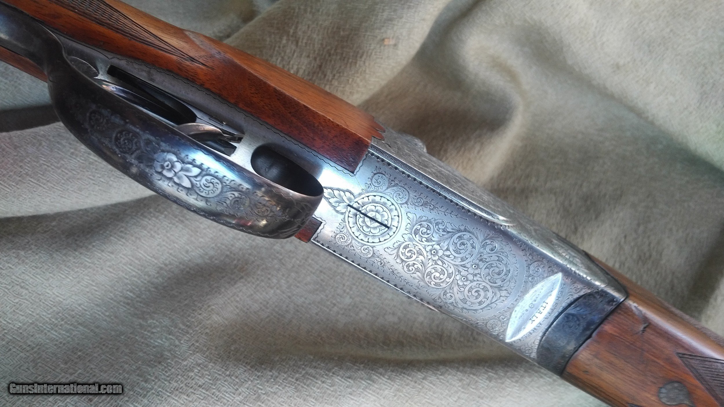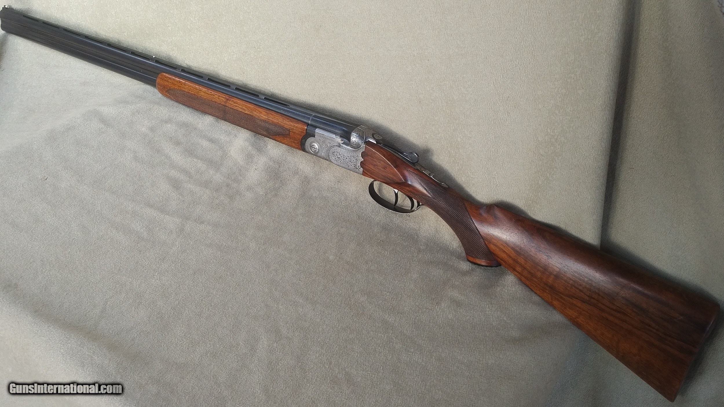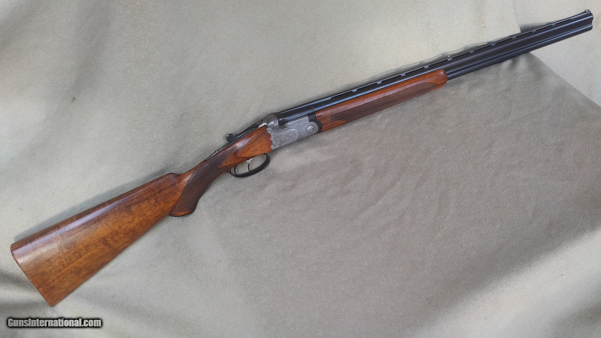 Description: Beretta ASEL 20 ga., O/U 26" hand filed vent rib barrels with double ivory beads are choked improved cylinder and full (.009/.024). This late 1950s Abercrombie & Fitch gun features hinged front double triggers, auto ejectors and auto safe. Fully engraved scallop-backed action, elegant special-order long forend, Prince of Wales grip. Nicely figured Tyrolean walnut stock measures 1-3/8" comb, 2-3/8" heel, 14-1/8" LOP over the original wood butt. Made in the same workrooms as the SO guns, certainly the finest boxlock O/Us ever produced by Beretta. The diminutive frame, scaled to the gauge allows this little 20 to weigh a mere 5 lbs, 10 ozs. Honest example. SOLD |