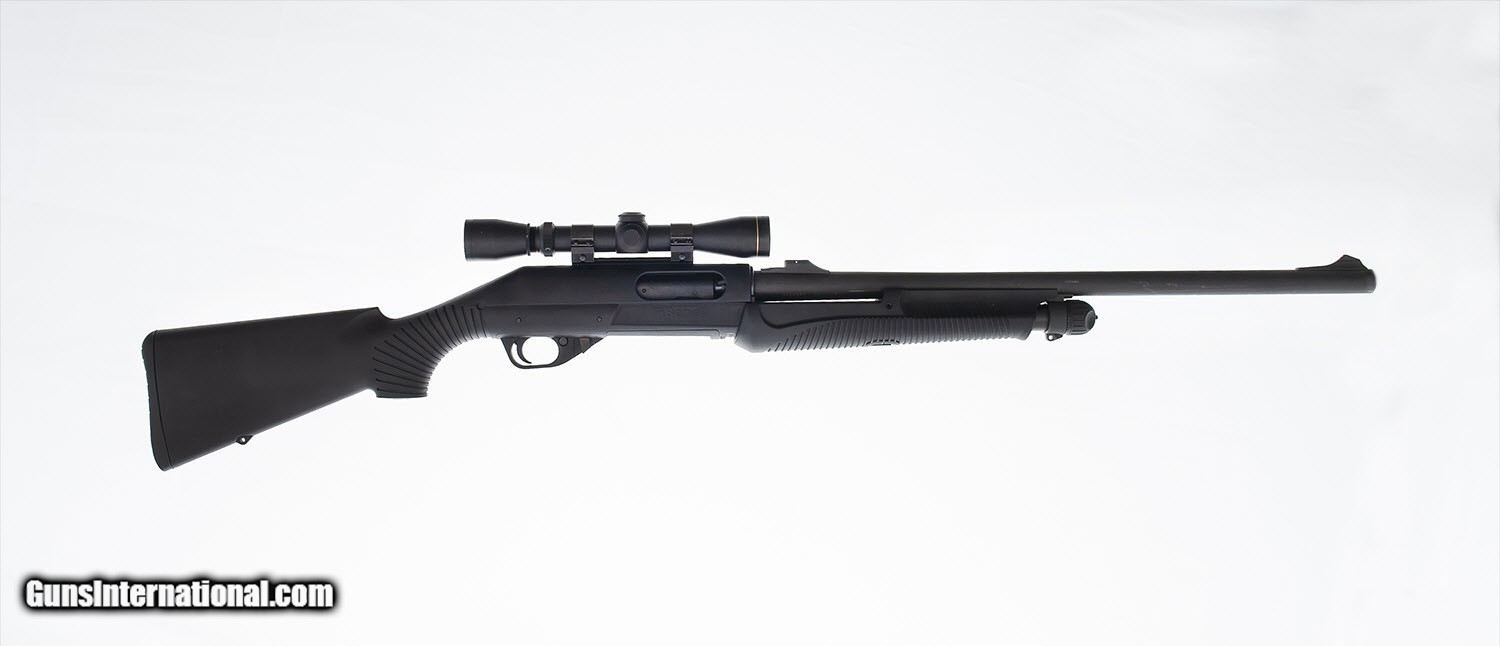 Description: Benelli - Nova - 12 ga - Item Number: BENZ080411 Shotgun type: Pump Action Action: Pump Ejectors: Yes Trigger: Single Grip: Pistol Grip Forend: Ribbed Lop: 13 3/4 " Pad thickness: 0.5 " Type of butt: Factory Drop comb: 1 1/2 " Drop heel: 2 " Cast amount: 0 " Weight: 8 lbs, 14 oz Manufactured in: Italy Finish: Black Overall condition: Very Good Stock condition: Very Good Metal condition: Very Good Stock: Original finish Metal: Original finish Type of Case: none Extra barrels: 0 Barrel info: Gauge: 12 ga Chamber: 3 " Length: 24 " Chokes: Cyl Comments : Gun is in very good condition with some light handling marks. Leupold 2x7 scope. SG-150 SOLD |