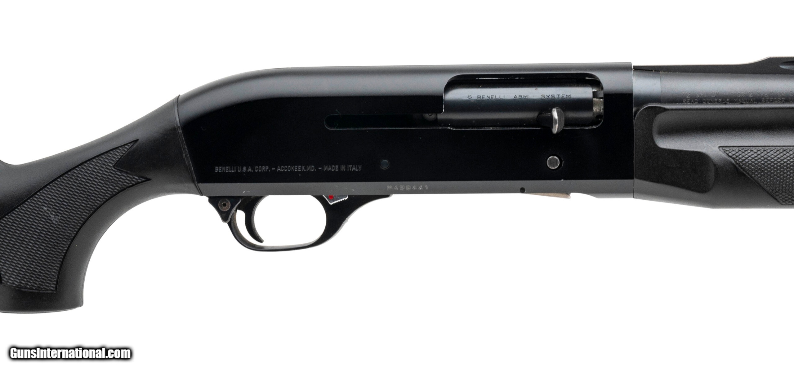 Description: "SN: M498441. Modern production. 12 Gauge with an 26"" vent rib barrel with screw in chokes. Bore is in excellent condition. Benelli semi-automatic shotgun. Finish is in excellent condition. Synthetic stock is in excellent condition. Overall condition is excellent. LOP is 14"". Shotgun comes with case and extra chokes. SOLD |