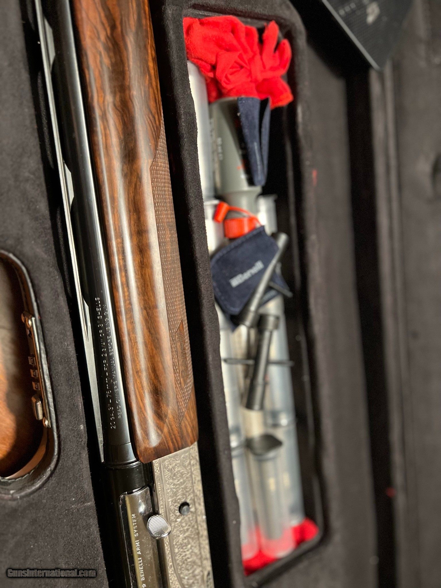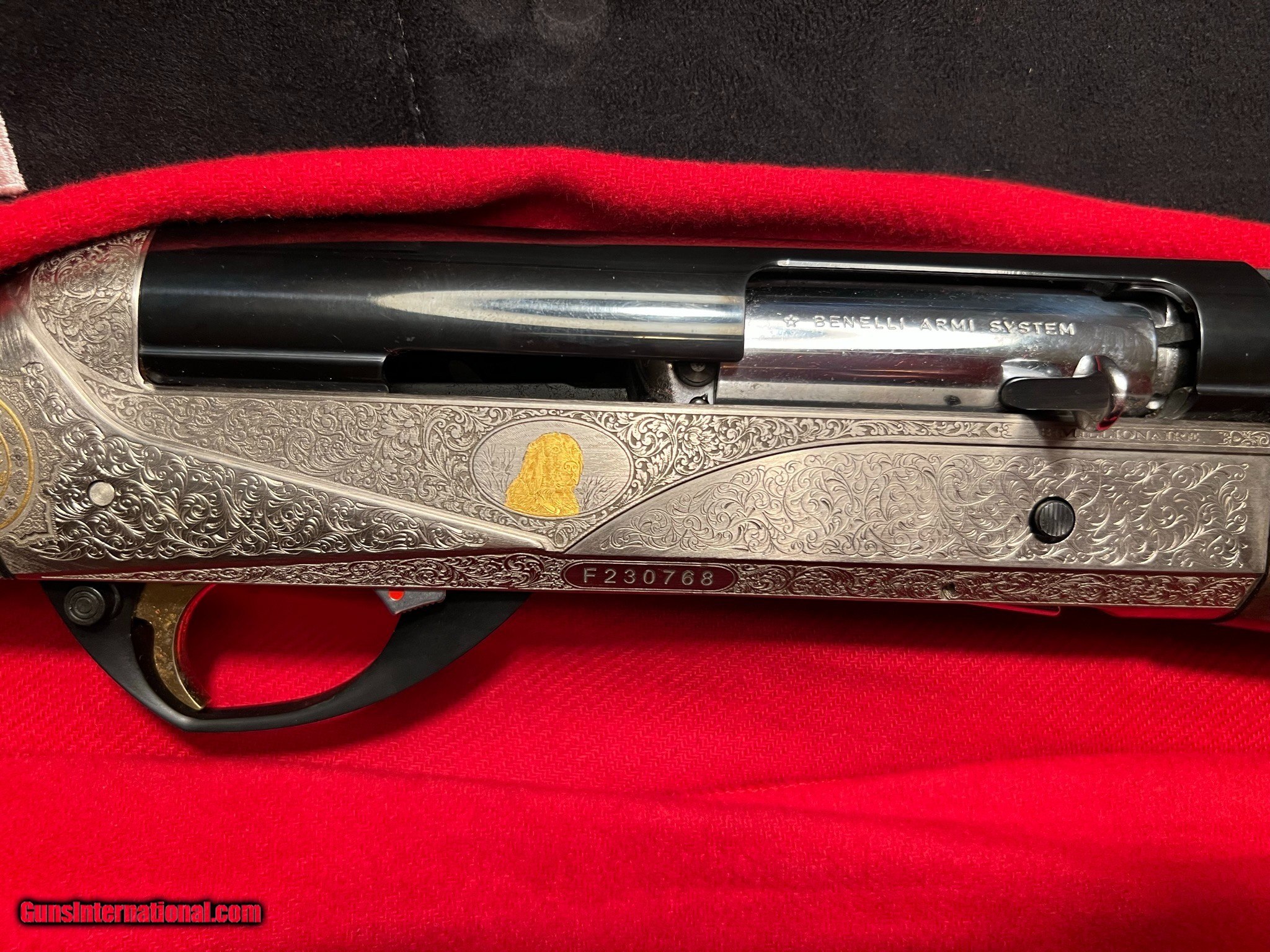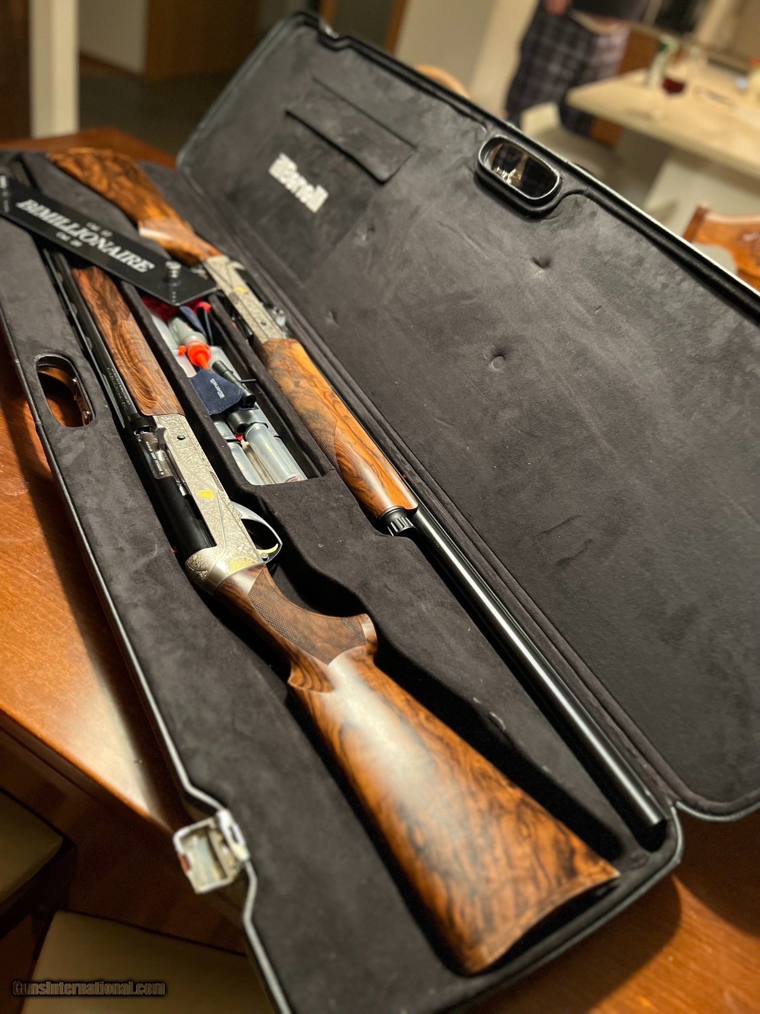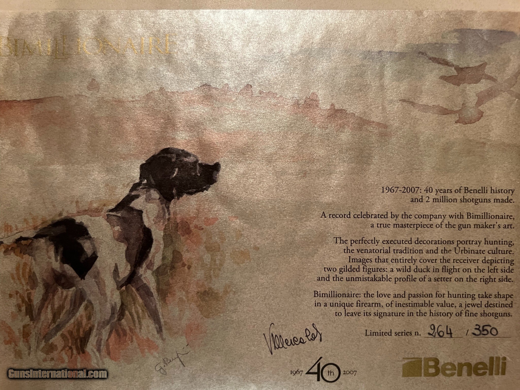 Description: A set of two Benelli Bimillioner sem auto shotguns, 12 and 20 gauge. ONLY 350 SETS MADE. This is set number 264. It has only been used twice, both guns in pristine condition. SOLD Shotgun Gauge: 12 Gauge, 20 Gauge Manufacturer: Benelli Model: Bimillioner Condition: Pristine Metal Condition: Excellent Wood Condition: Excellent Bore Condition: Excellent |
