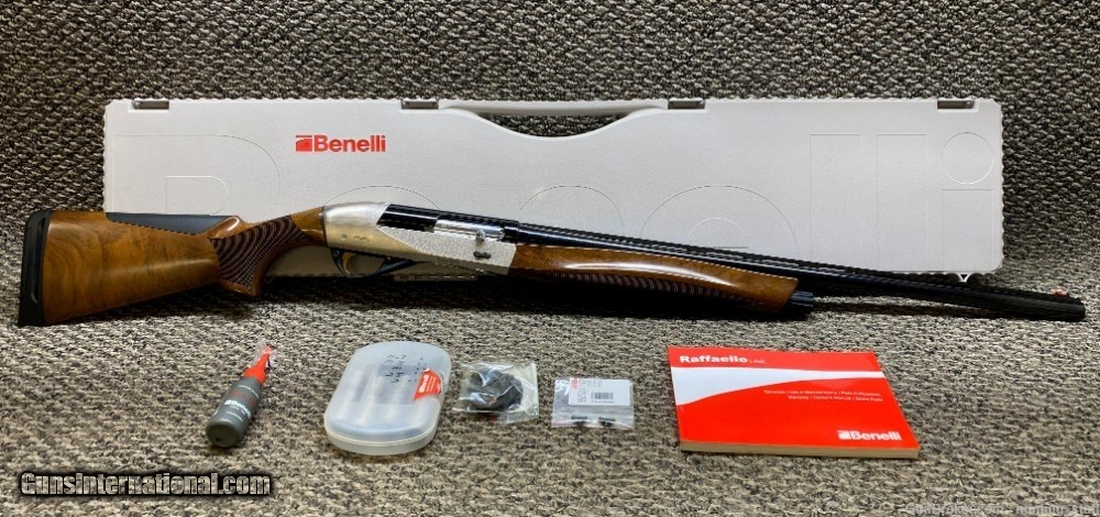 Description: Guns Listing ID: 1321962 This listing is for a USED Benelli Ethos Field 12 GA 3” Blued Finish Engraved Nickel Wood 26\" BBL 4+1. This is a used gun, it has been fired and will have residue present. This Benelli Ethos is chambered in 12 gauge, it will hold 4 rounds in the magazine tube, and it will chamber up to 3 inch shells. This shotgun comes with a 26 inch barrel, and it comes installed with a modified choke. It comes equipped with a red fiber optic front sight, and a mid-bead. There are a few scratches on the cheek piece, and there are a few marks around the pistol grip. The action appears to be in good condition, the finish appears to be in good condition, and the bore appears to be in good condition. This shotgun comes with a bottle of oil, four extra choke tubes, extra stock shims, two extra front sights, an owner’s manual, and a Benelli hard case. This would be a great hunting shotgun. ** DISCLAIMER** THIS FIREARM HAS NOT BEEN TEST FIRED*** SOLD Manufacturer: BENELLI Model: ETHOS Condition: Used - Non-Certified Barrels: 26 BARREL Gauge Info: 12 GA Finish: BLUED AND SILVER |