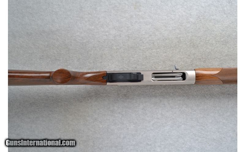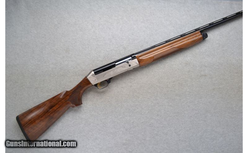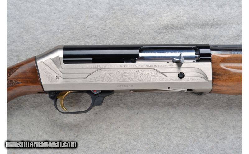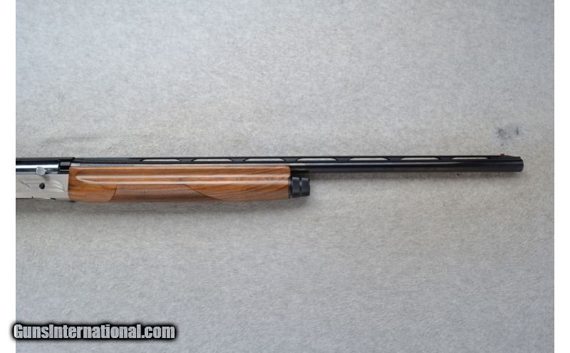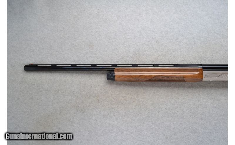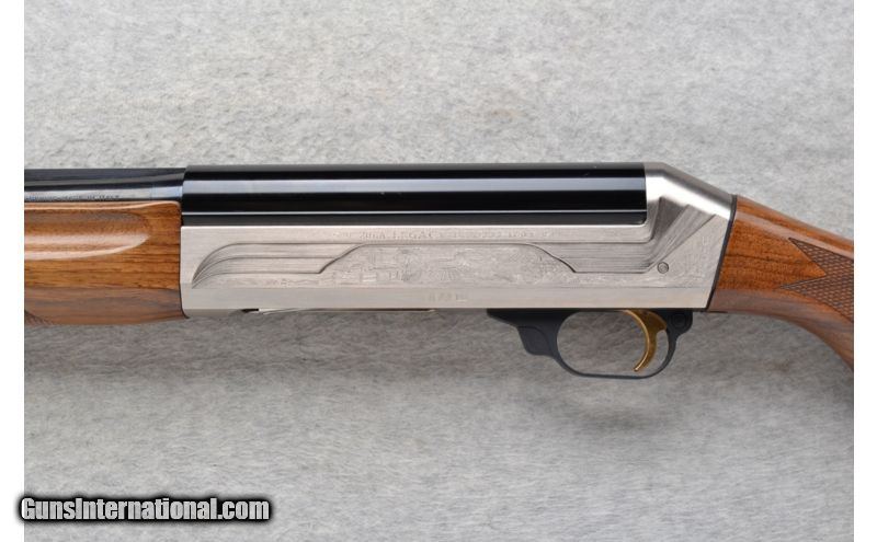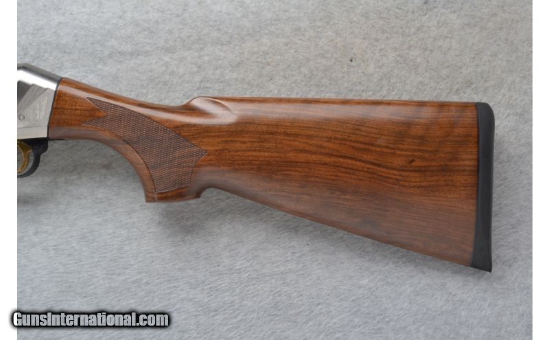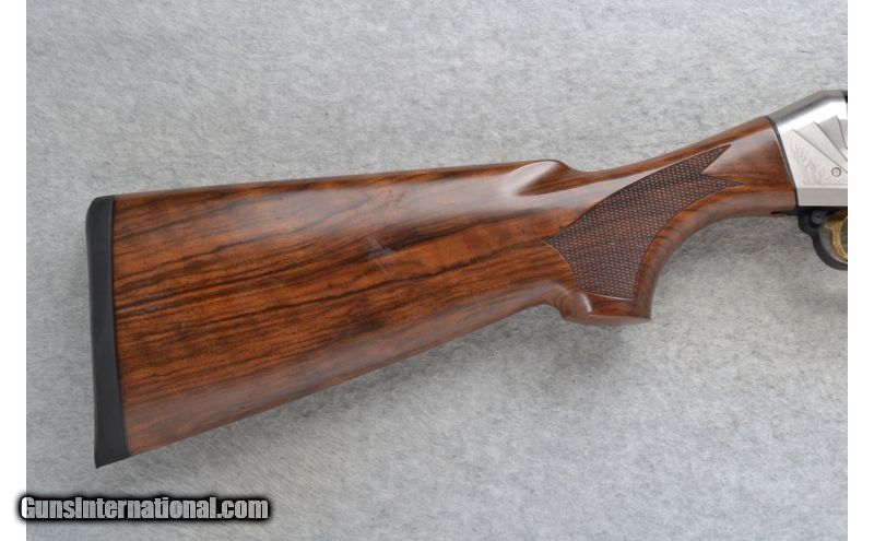 Description: This Benelli Model Legacy is a right hand semi-auto 20 Ga. shotgun. It has a 26 inch barrel with a ventilated rib. In 3 inch chamber it takes choke tubes and comes with 5 tubes. A red bar front sight and metal middle bead sight. The stock is a checkered select AA walnut pistol grip. It has a cartridge drop lever. It comes with a stock shim kit. The receiver is an engraved nickel finished alloy lower with grouse and dove flying in outdoor scenes. It was manufactured to commemorate the 30th Anniversary of Benelli shotgun manufacturing. SOLD Caliber Info: 20 Ga. Chambers: 2 3/4 inch or 3 inch Semi-Auto. Metal Condition: Excellent. Wood Condition: Excellent. Bore Condition: Very clean, bright and shiny. Barrels: 26 inch blued with a ventilated rib. Triggers: Golden. Stock: Checkered walnut pistol grip. Stock Dimensions: LOP 14 1/4 inches. Fore End: Checkered grip walnut with finger grooves. Butt Pad: Benelli black rubber recoil pad. Weight: 5 lbs. 14 oz. Sights: Red bar high visibility front. Metal middle bead. Chokes: Tubes. Comes with 5 - F, IM, M, IC & Skeet. Extras: Comes in a Benelli hard case with 5 choke tubes, choke tube wrench and a stock shim kit. Item Location: Richfield, WI |