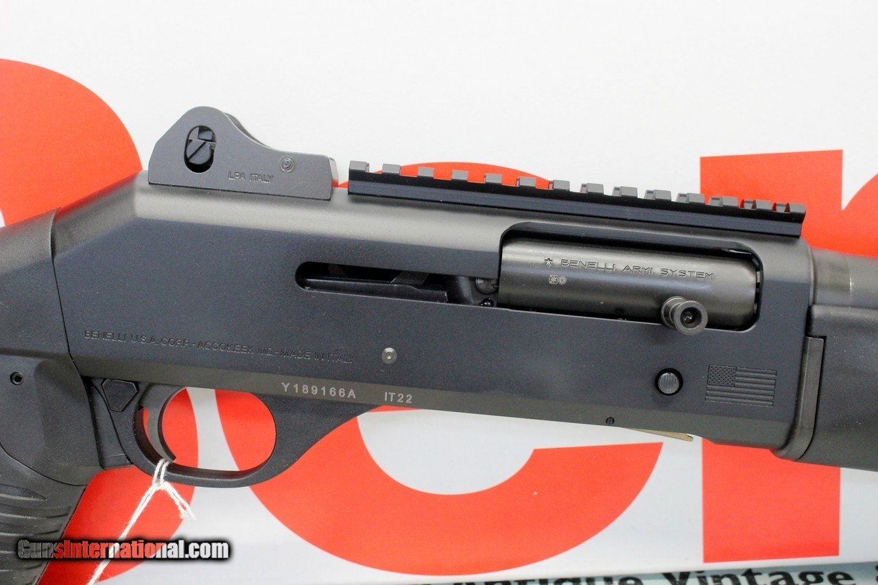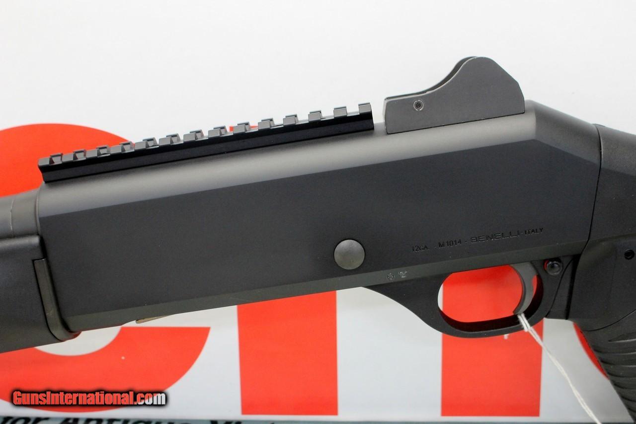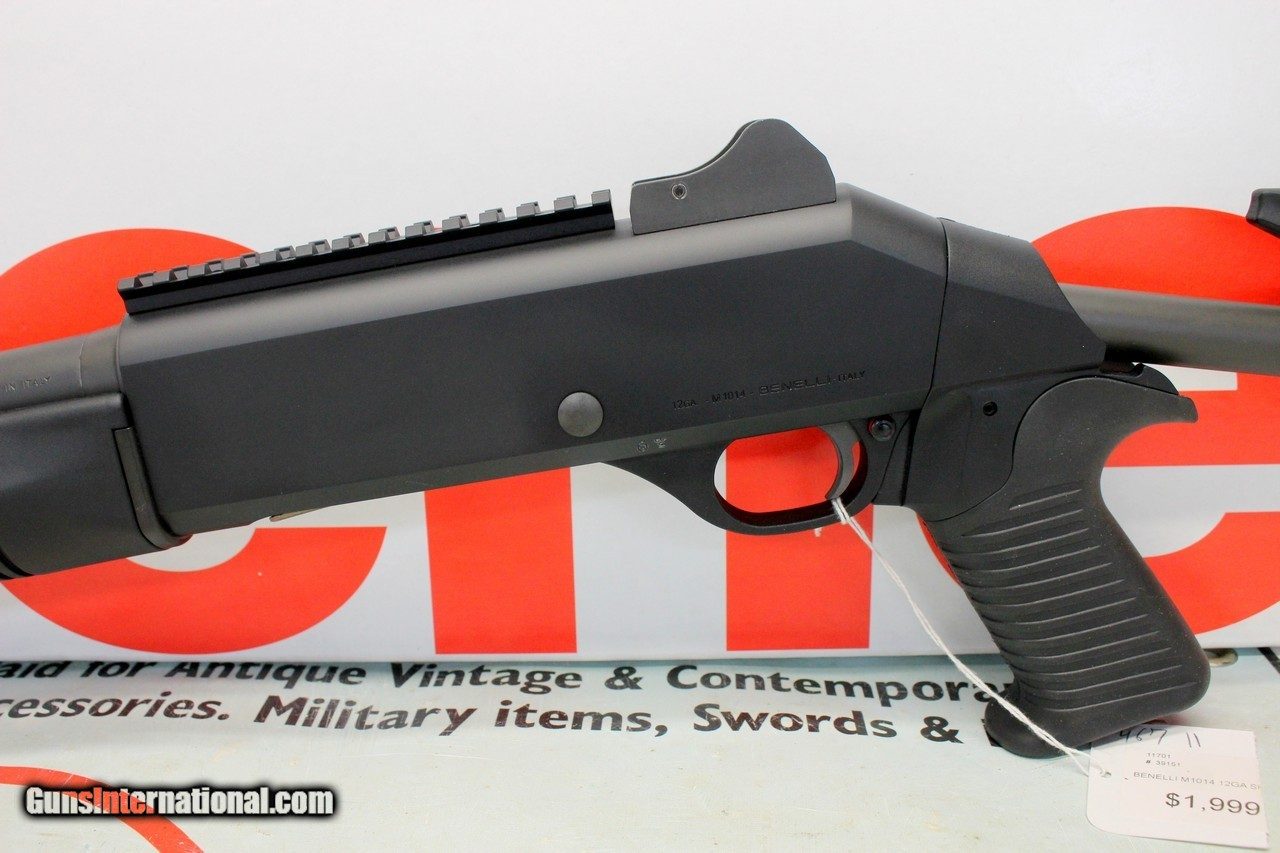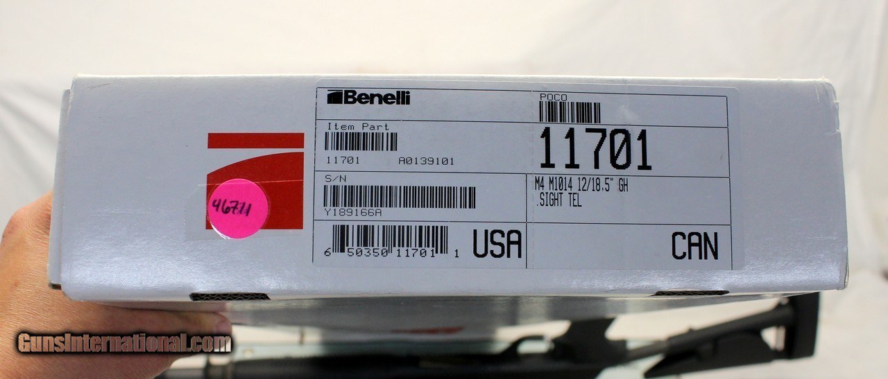 Description: Description: For sale is a NEW IN BOX Benelli M4 M1014 12 Gauge 18". Benelli M1014 Fixed-Position 12 Gauge 18.5" Black Synthetic, Pistol Grip Currently deployed by the U.S. Marine Corps in combat theaters around the world, the Benelli M1014 sets the standard for military shotgun performance and reliability. The Benelli M1014 comes standard with a fixed-position skeletonized stock with a pistol grip and separate cheek piece. All the external surfaces are protected with an anti-reflective MILSPEC finish. FEATURES A.R.G.O. - Benelli’s patented Auto-Regulating Gas-Operated (A.R.G.O.) system is a simple, self-cleaning, piston-driven action. SPECIFICATIONS Item Number: 11701 Barrel Length: 18.5" Overall Length: 40" Weight: 8 lbs Length of Pull: 14-3/8" Magazine Capacity: 5+1 Choke: M Sights: Ghost Ring Stock: Black Synthetic, Pistol Grip Drop at Heel: 2-1/4" Drop at Comb: 1-1/2 SHIPPING IS $59.95 USPS PRIORITY WITH INSURANCE SOLD |