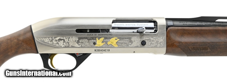 Description: Benelli Montefeltro Featherweight 20 Gauge shotgun. NEW Montefeltro Silver Featherweight. 24” barrel, 5-chokes, nickleblue receiver, game scenes, and case.