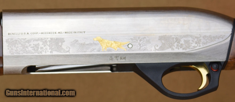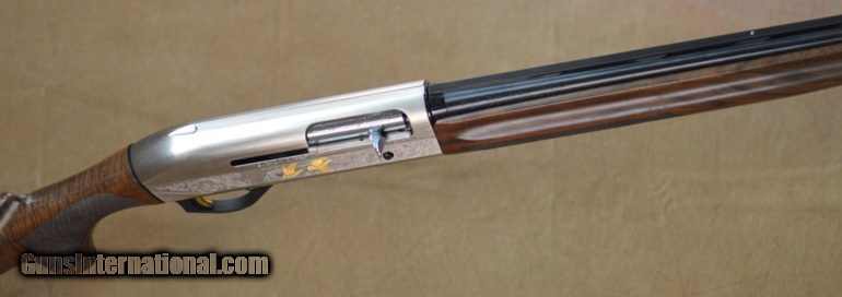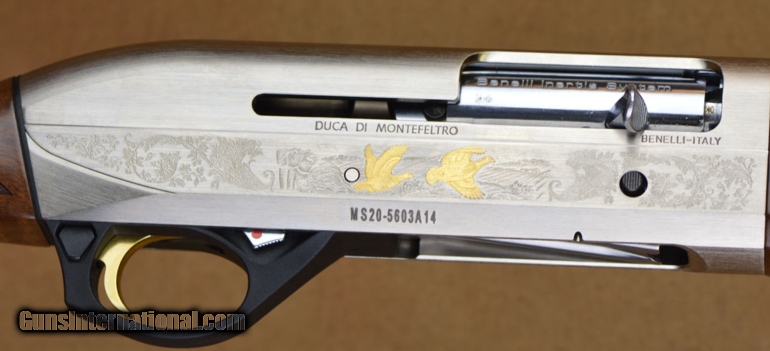 Description: New Benelli Montefeltro Silver 20GA with 26" factory choke tubed barrels. Features nickel receiver with gold birds and scrolls. Upgraded walnut stock and forearm. Includes factory case and chokes. SOLD |