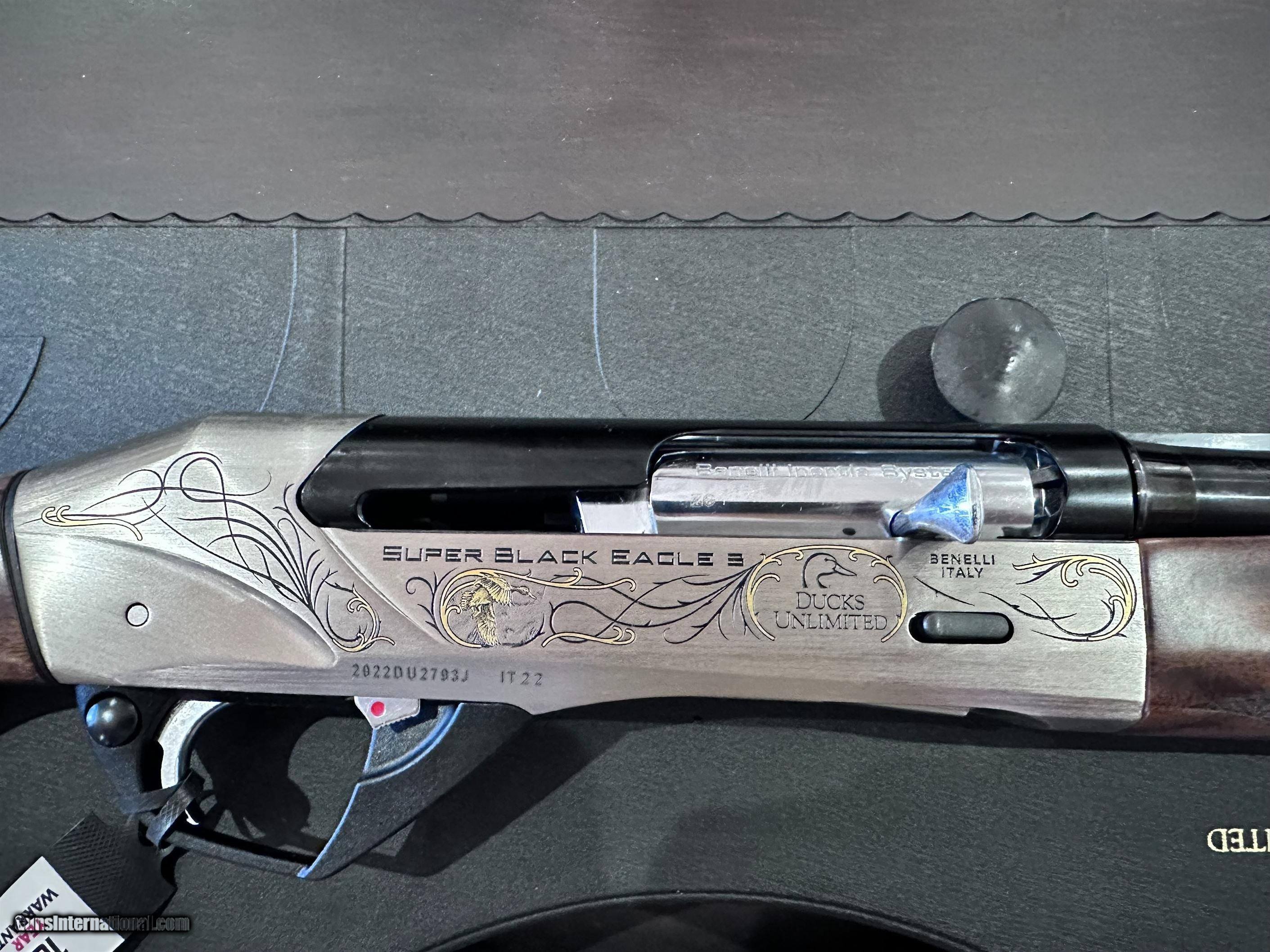 Description: For sale is a brand new Benelli SBE 3 20 ga Ducks Unlimited Gun of the year 2022. Gun is never fired and only put together for pictures. From Benelli/DU about the gun....."Ducks Unlimited worked with Benelli to secure exclusive access to the only Super Black Eagle twenty bore with a wood stock and fore end in 2022. A beautiful coin finished receiver with DU embellishments and gold-inlaid with waterfowl scene engraving mate up with the 28” polished blue barrel with extended choke tubes. Each gun will have its own special DU serial number and comes with a hard polymer plastic case with DU logo to complete this highly sought-after shotgun. SOLD Shotgun Gauge: 20 Gauge Manufacturer: Benelli Model: Super Black Eagle 3 Condition: Mint |