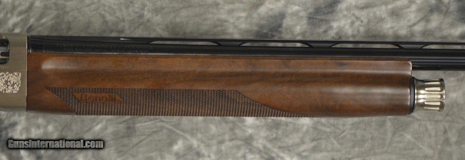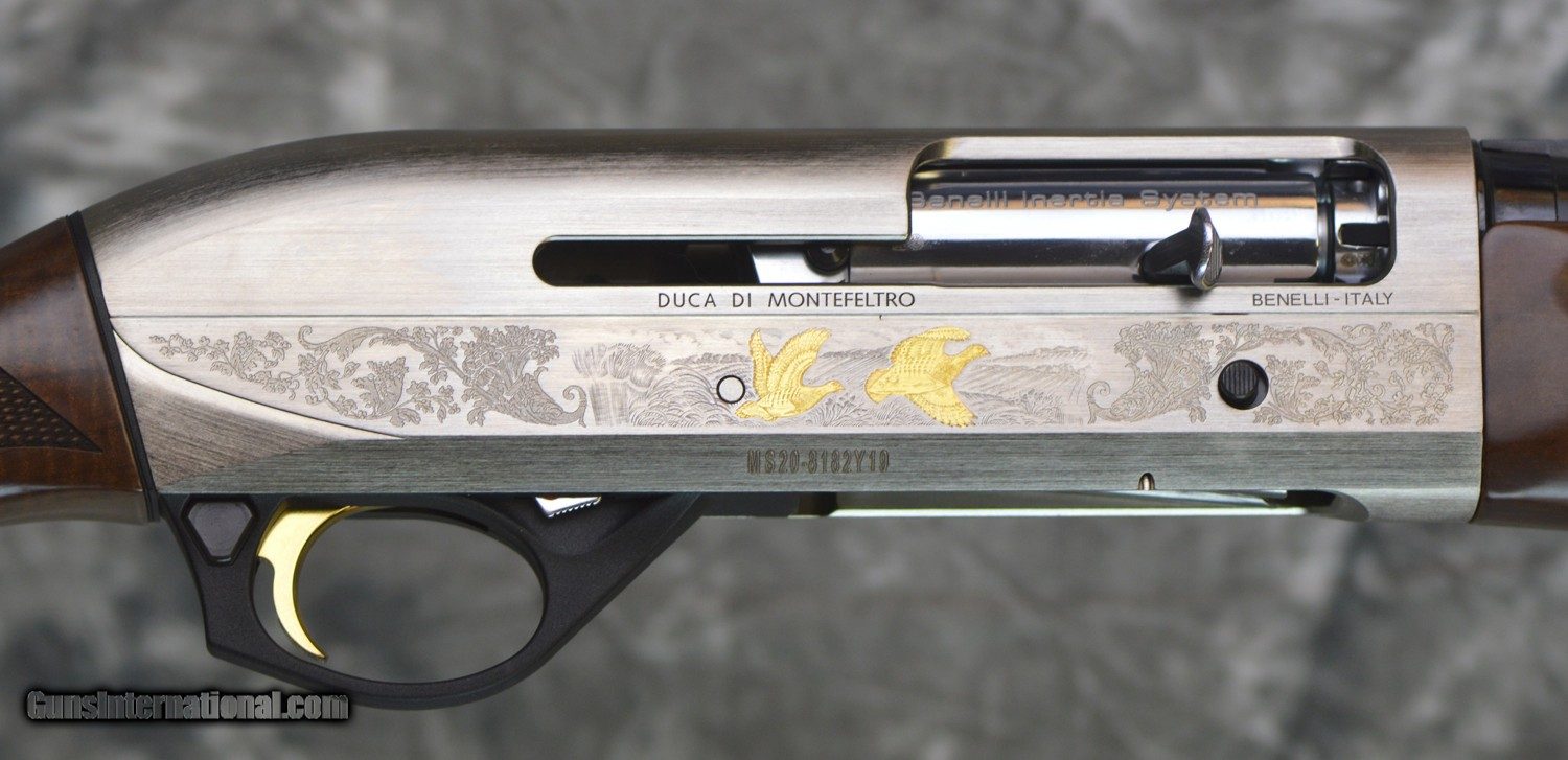 Description: New Benelli Montefeltro Silver Field 20GA with 26" factory choke tubed barrel, flat steel rib. Nickel finished alloy receiver featuring scroll engraving and game scenes with gold highlights. Upgraded factory pistol grip stock and game forearm. Includes factory case, chokes and tools. SOLD |