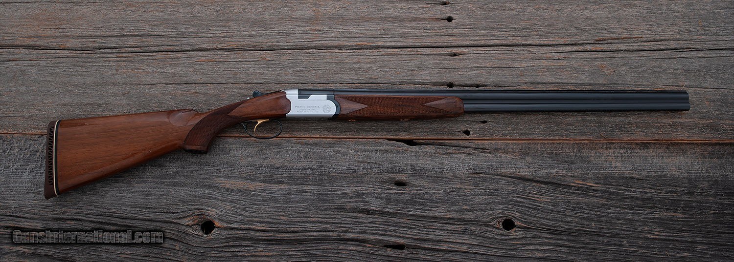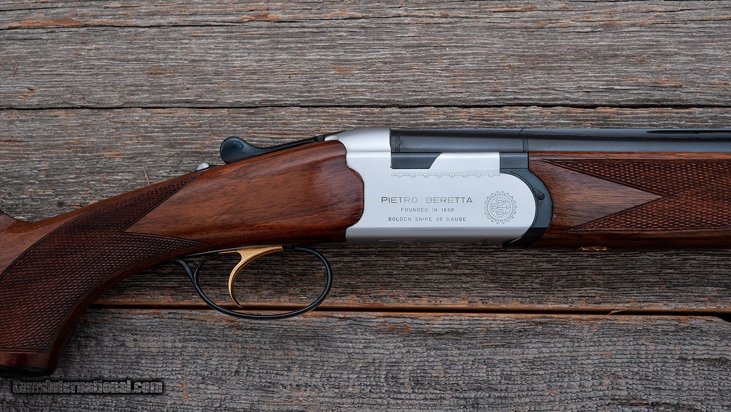 Description: Beretta - Gold Snipe - 20 ga - Item Number: BER06595 Shotgun type: O&U Action: Boxlock Ejectors: Yes Trigger: Single Grip: Pistol Grip Forend: Checkered Lop: 14 1/8 " Pad thickness: 0.75 " Type of butt: White Line Pad Drop comb: 1 1/2 " Drop heel: 2 1/2 " Cast amount: 1/8 " Cast: OFF Weight: 6 lbs, 4 oz Manufactured in: Italy Finish: Coin Overall condition: Very Good Stock condition: Very Good Metal condition: Very Good Stock: Original finish Metal: Original finish Type of Case: none Extra barrels: 0 Barrel info: Gauge: 20 ga Chamber: 2 3/4 " Length: 28 " Chokes: IM/M Rib type: Ventilated Comments : Gun is in very good condition with some light dings and scratches. SG-133 SOLD |