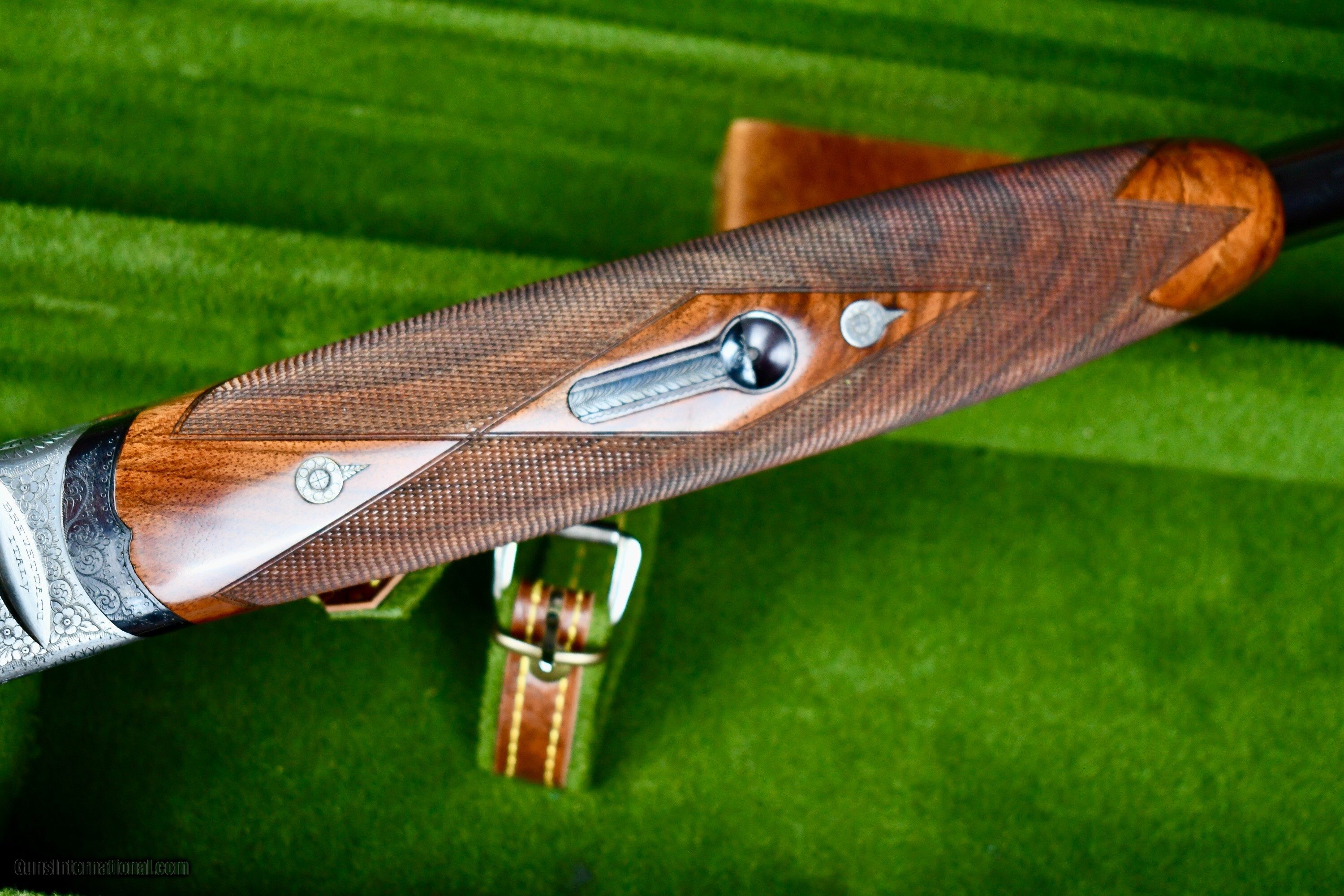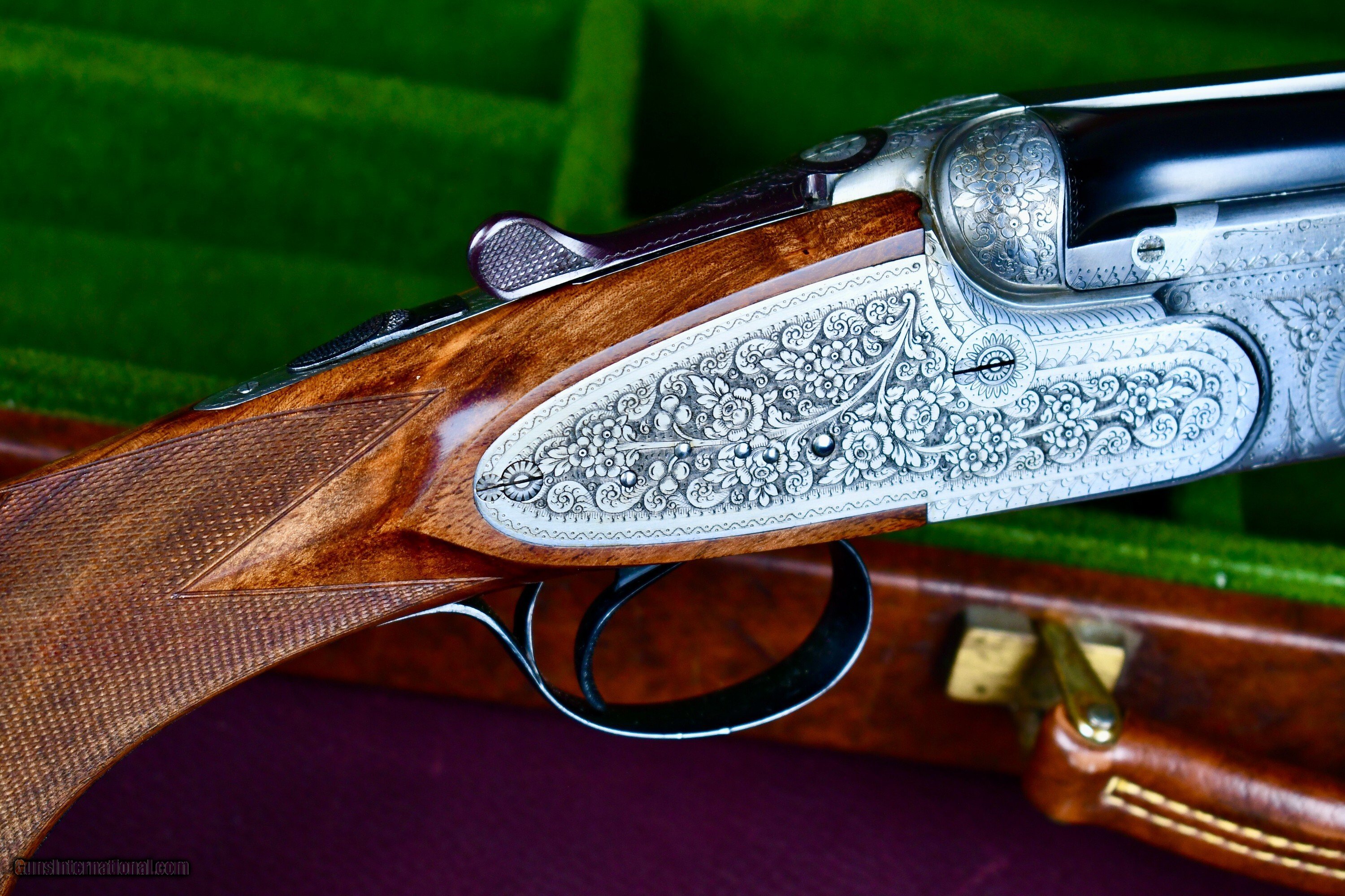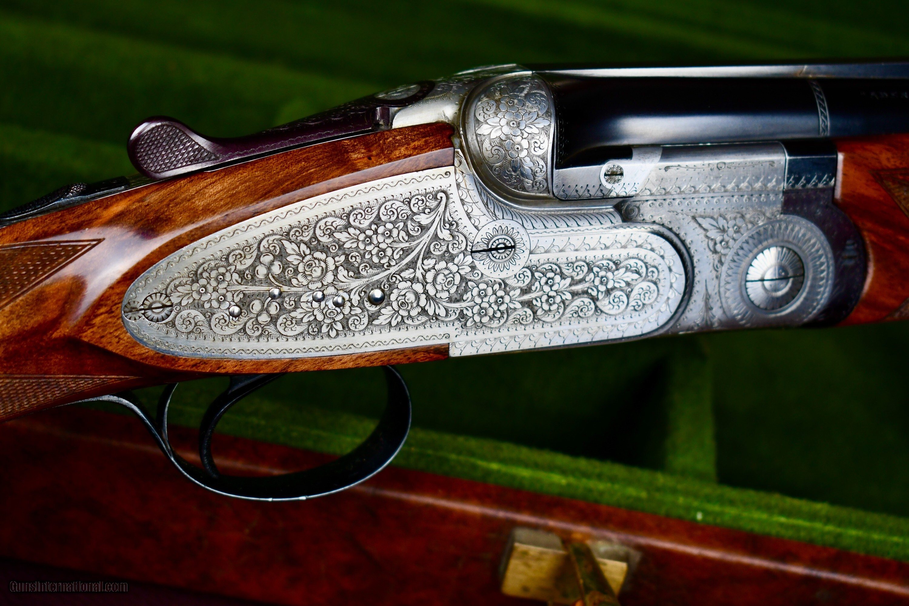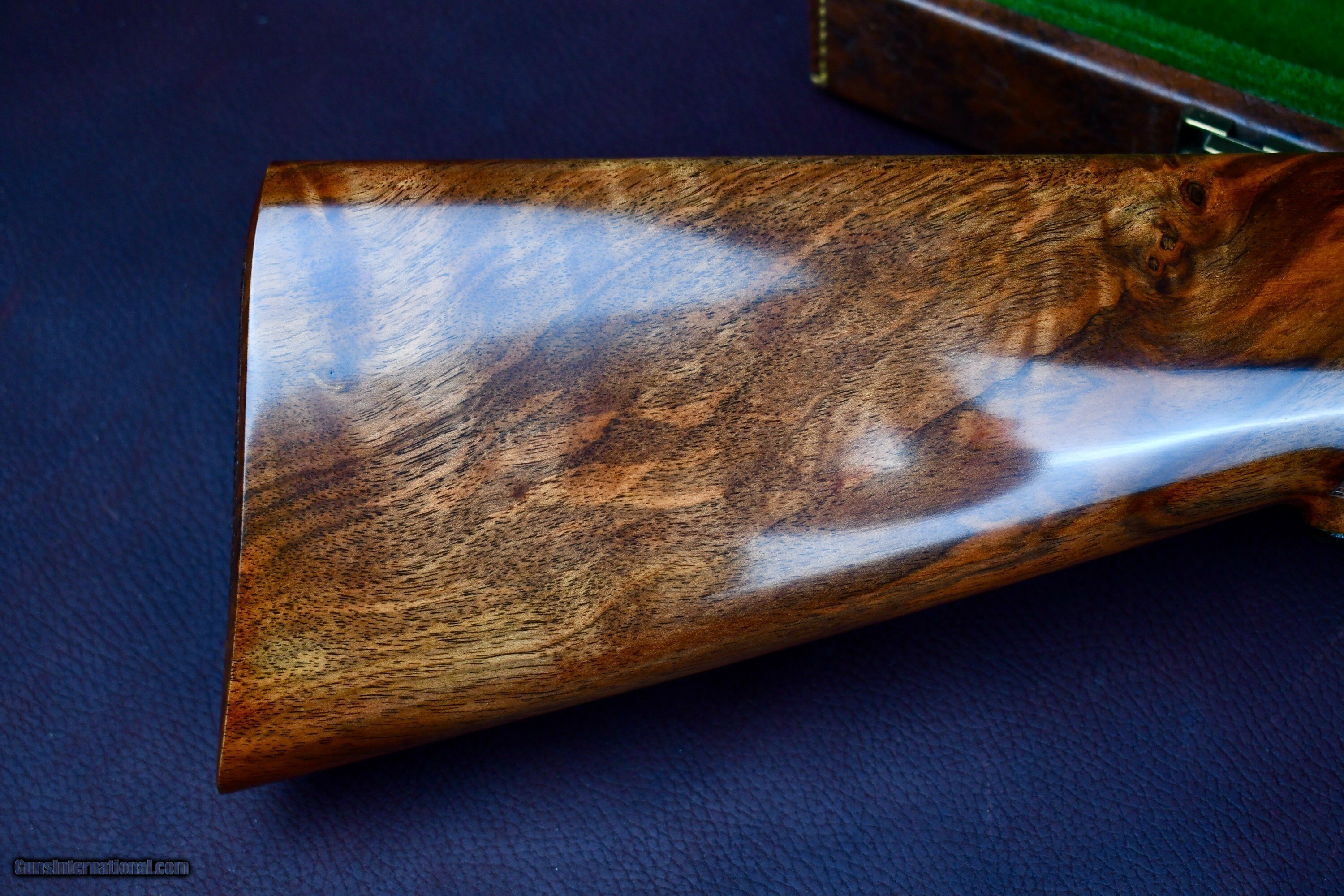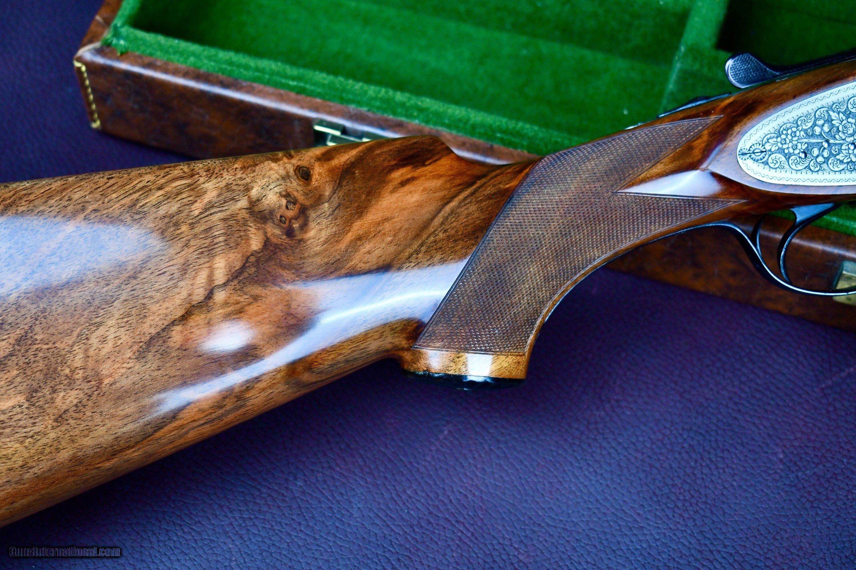 Description: INCREDIBLE AS NEW CASED BERETTA S3 SIDELOCK PIGEON GUN ORDERED BY ABERCROMBIE AND FITCH IN 1966 -- THIS GUN REMAINS IN 99++++% NEW -- FACTORY ORDERED 30" WITH FULL/XFULL CHOKES -- PISTOL GRIP -- HORN GRIP CAP -- SLENDER FULL PIGEON FOREND -- EJECTORS -- SINGLE BRASS BEAD -- LOW PROFILE VENT RIB -- CHECKERED BUTT -- NICE HIGH PIGEON DIMENSIONS WITH SLIGHT CAST OFF FOR THE RIGHT HANDED SHOOTER -- A FANTASTIC ORIGINAL EXAMPLE OF A BERETTA BEST QUALITY SIDELOCK -- GUN COMES IN A EARLY FELT LINED CASE WITH DOUBLE CLASP LOCKS (NO KEYS) A PERFECT GUN TO SHOOT AT SPROTING CLAYS, HELIZE OR BOX BIRDS -- JUST FANTASTIC. Manufacturer: BERETTA Model: S3 SIDELOCK Barrel Length: 30 Chambers: 2 3/4 Ejectors: YES Condition: EXCELLENT AS NEW Metal Condition: EXCELLENT AS NEW Wood Condition: EXCELLENT AS NEW Bore Condition: EXCELLENT Action: SIDELOCK Triggers: SINGLE SELECTIVE Stock Comb: 1 1/4 Stock Heel: 1 7/8 Fore End: PETITE BEAVERTAIL Butt Pad: FACTORY CHECKERED LOP: 14 3/8 Rib: VENT Weight: 7lbs 11oz Sights: single bead Choke Left: .038 BOTTOM Choke Right: .044 TOP Case: YES Price: $8,995.00 Contact Seller |