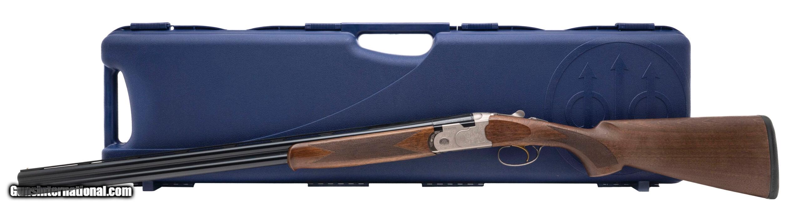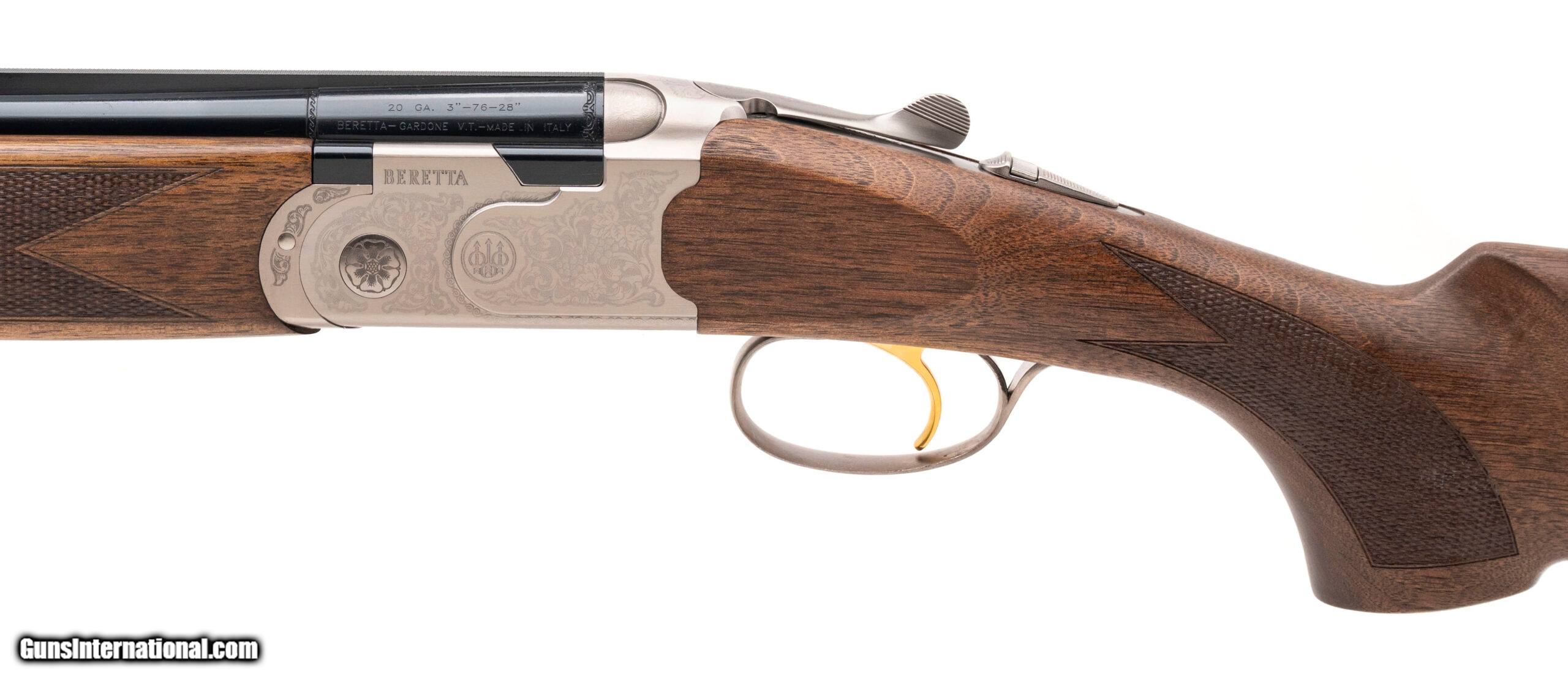 Description: "SN: F88647X. Modern production, 20 gauge with 28"" vent rib barrels chambered for 3"" shells. Bores are excellent. Over/under field shotgun with engraved stainless receiver, blue finished barrels, and checkered wood stock with a 14.75 LOP. Includes additional 28"" 28 gauge vent rib barrel set with excellent bores, 6 additional chokes, and original carry case. Overall condition is excellent. SOLD |