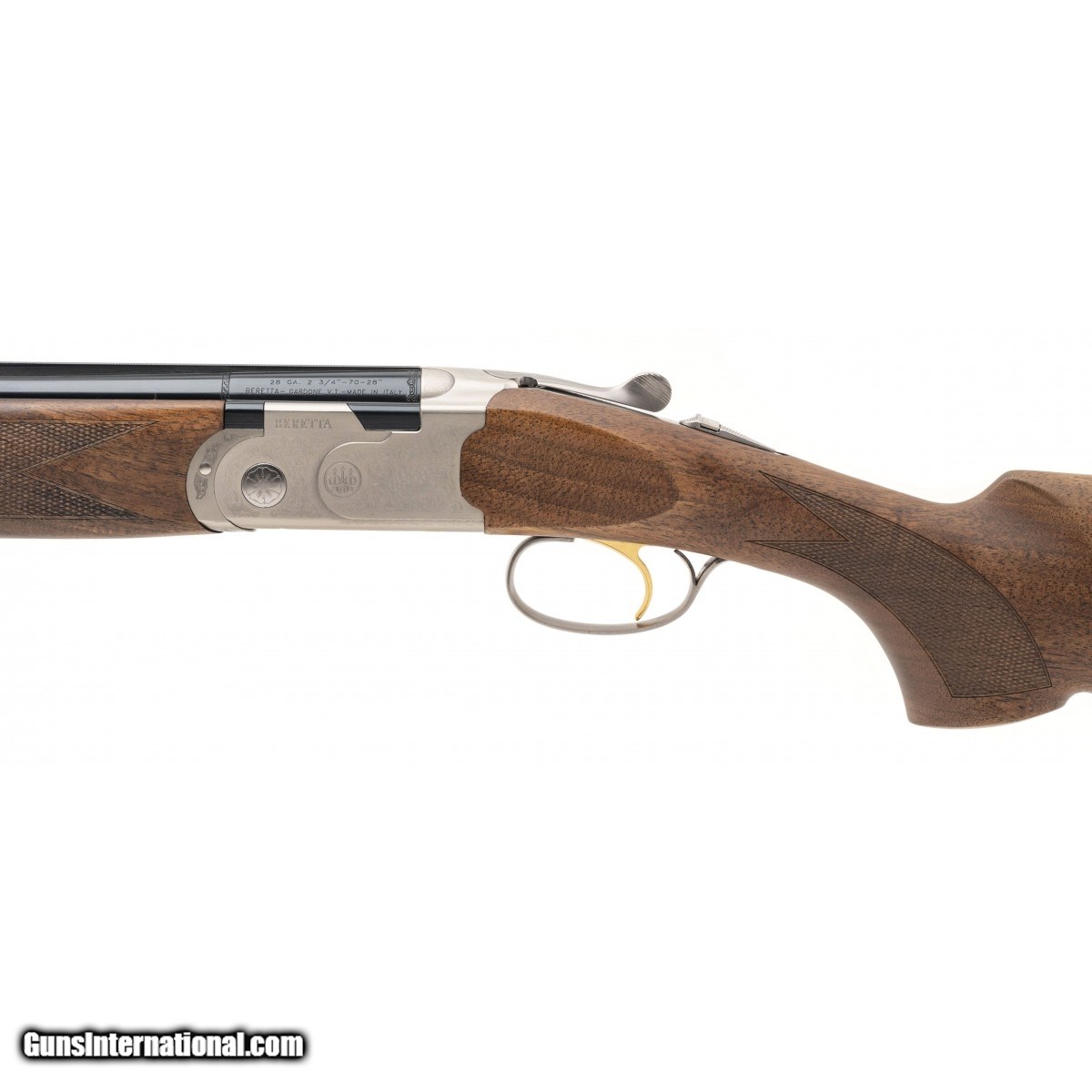 Description: "SN: N91403S. Modern production. 28 gauge with 28"" vented rib barrels. Bores are in near excellent condition. Beretta O/U hunting shotgun with engraved receiver. Blued finish is in near excellent condition. Wood stock is in near excellent condition. LOP is 13.50"". Overall condition is near excellent. SOLD |
