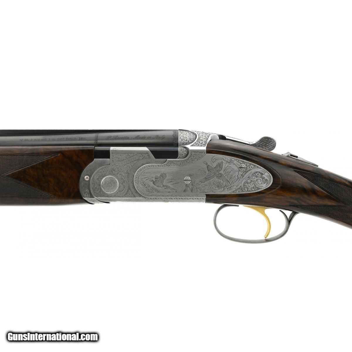 Beretta 687 Extra 12 gauge shotgun. Premiun grade over/under field gun. Has 28" barrels, elaborately engraved side plates and a straight stock of higly figured Walnut. LOP is 13 5/8". The gun is in near excellent condition with a few light marks. Has a set of Briley 20 gauge ultra-light tubes. With case.
