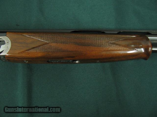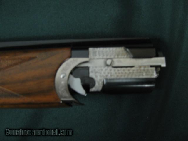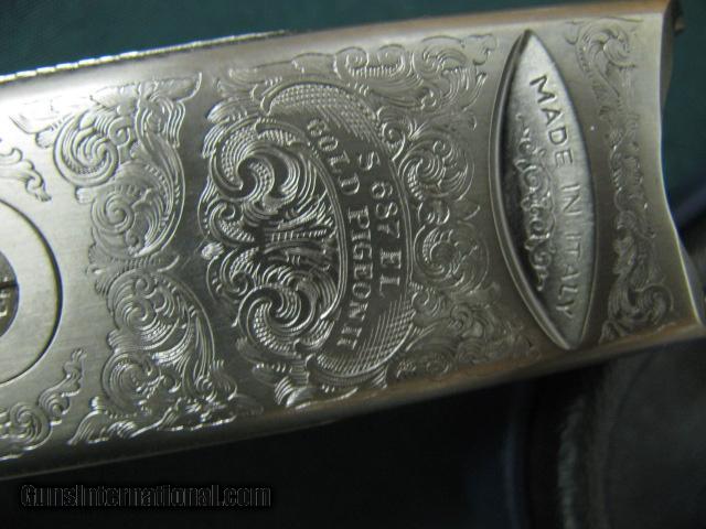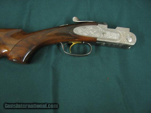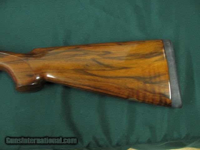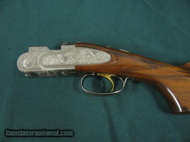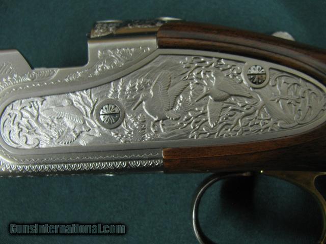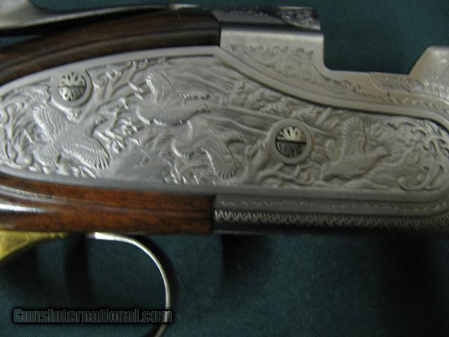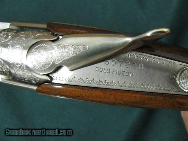 Description: 5954 Beretta El Gold Pigeon II Sporting, 410 gauge 28 inch barrels,CYL/IC/IM,wrench, papers,AA Fancy Walnut,deep relief game scene engraved coin silver receiver sideplates on boxlock,gold trigger, 2 butt pads, papers,wrench,oiler, AS NEW IN CASE. SOLD |