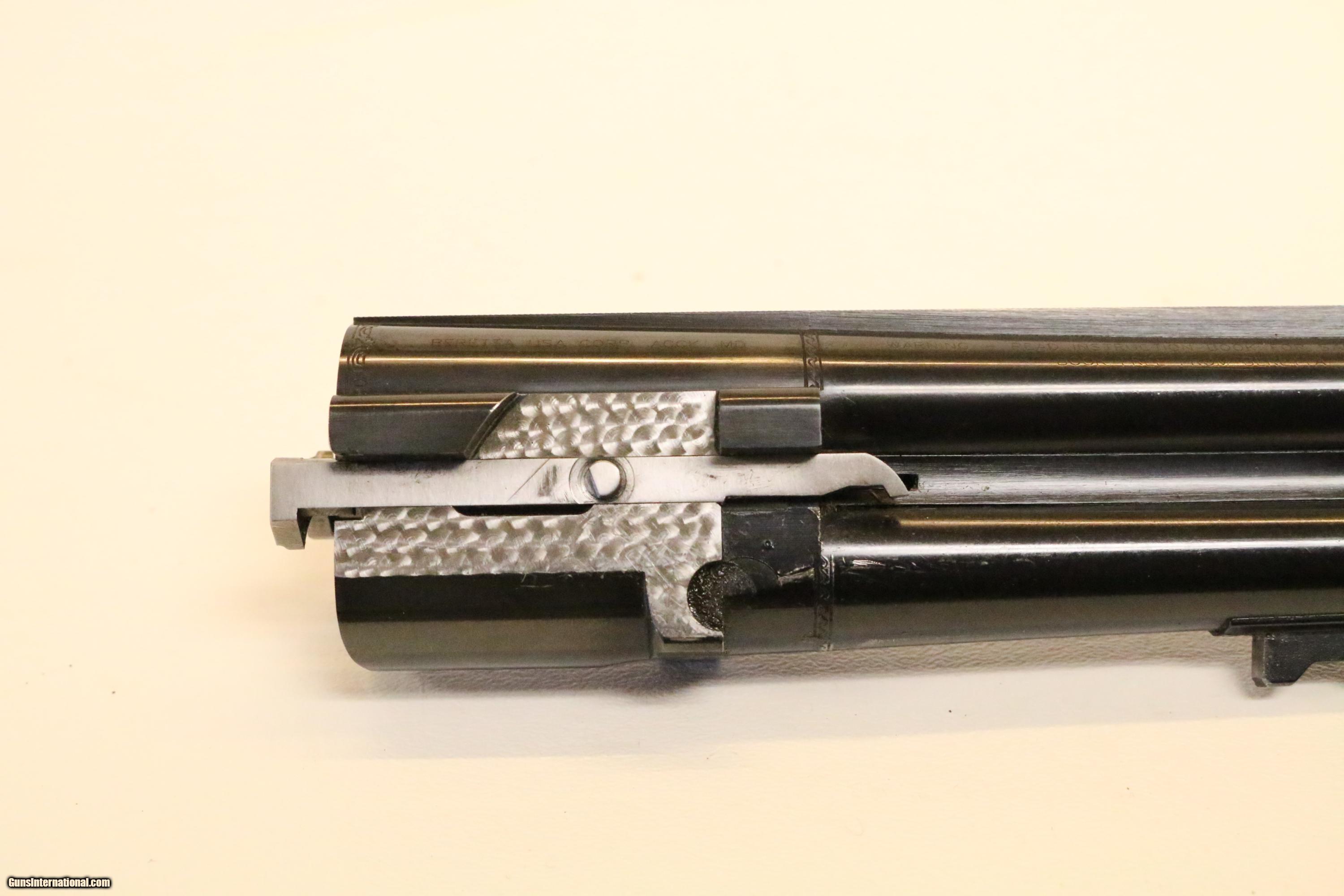 Description: This very well cared for Beretta 686 20 bore Onyx Pro appears to be in as new condition. It is in its original case with paper work, choke tubes and wrench, additional recoil pad to adjust length of pull, owner manual & receiver and barrel covers. The original sling swivels were never installed and are present in their sealed plastic bag. The barrels are 28" with 2 3/4" and 3" chambers it also has the extended choke tubes. The standard front tru glow sight with green filament is in place the red filament insert insert is in the case. Lock up is as new and on face. Single selective trigger. LOP with the thicker pad is 14 5/8". Stock condition is near new as is the original blue. Very nice lightweight fast handling gun. SOLD |