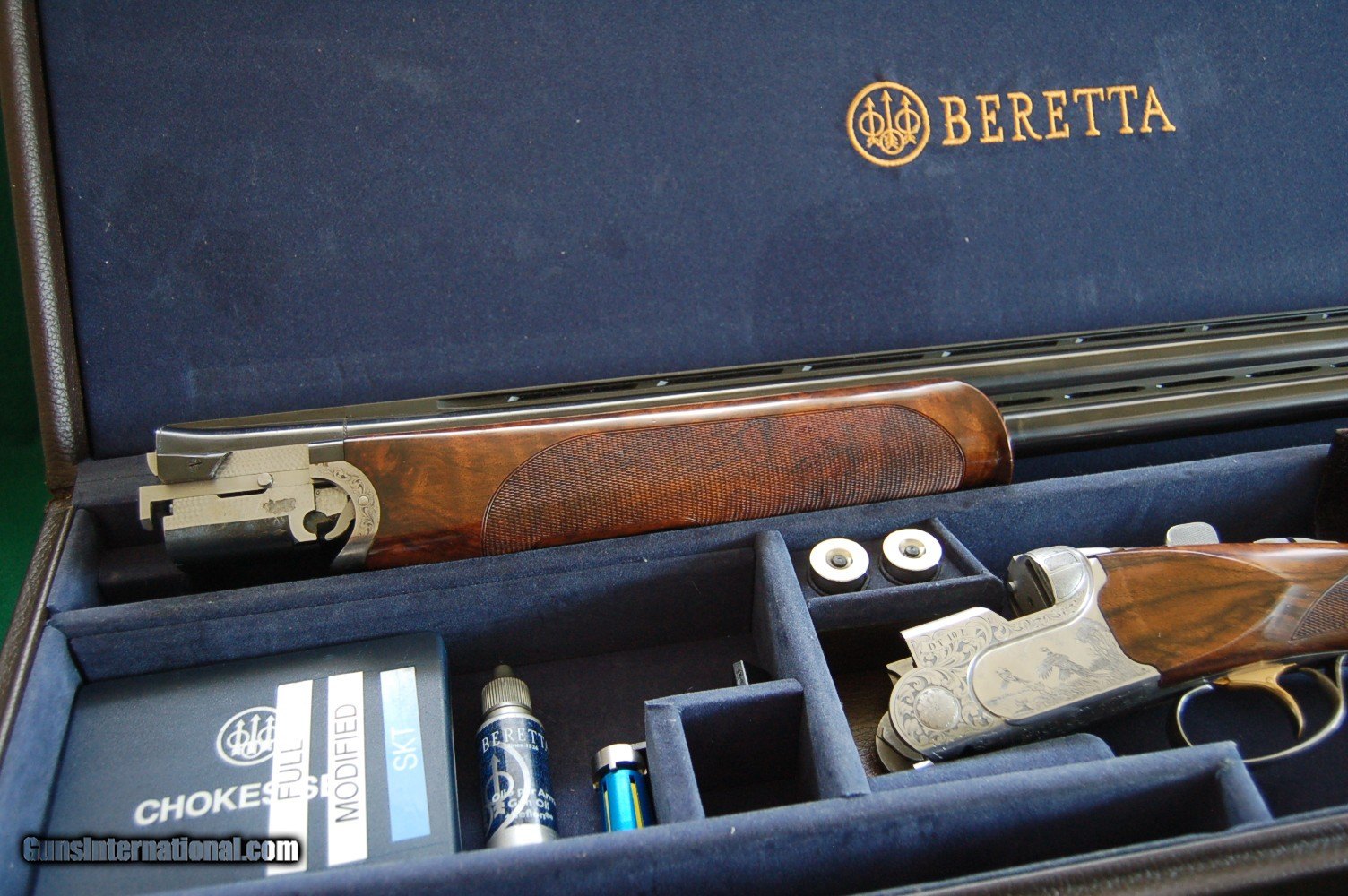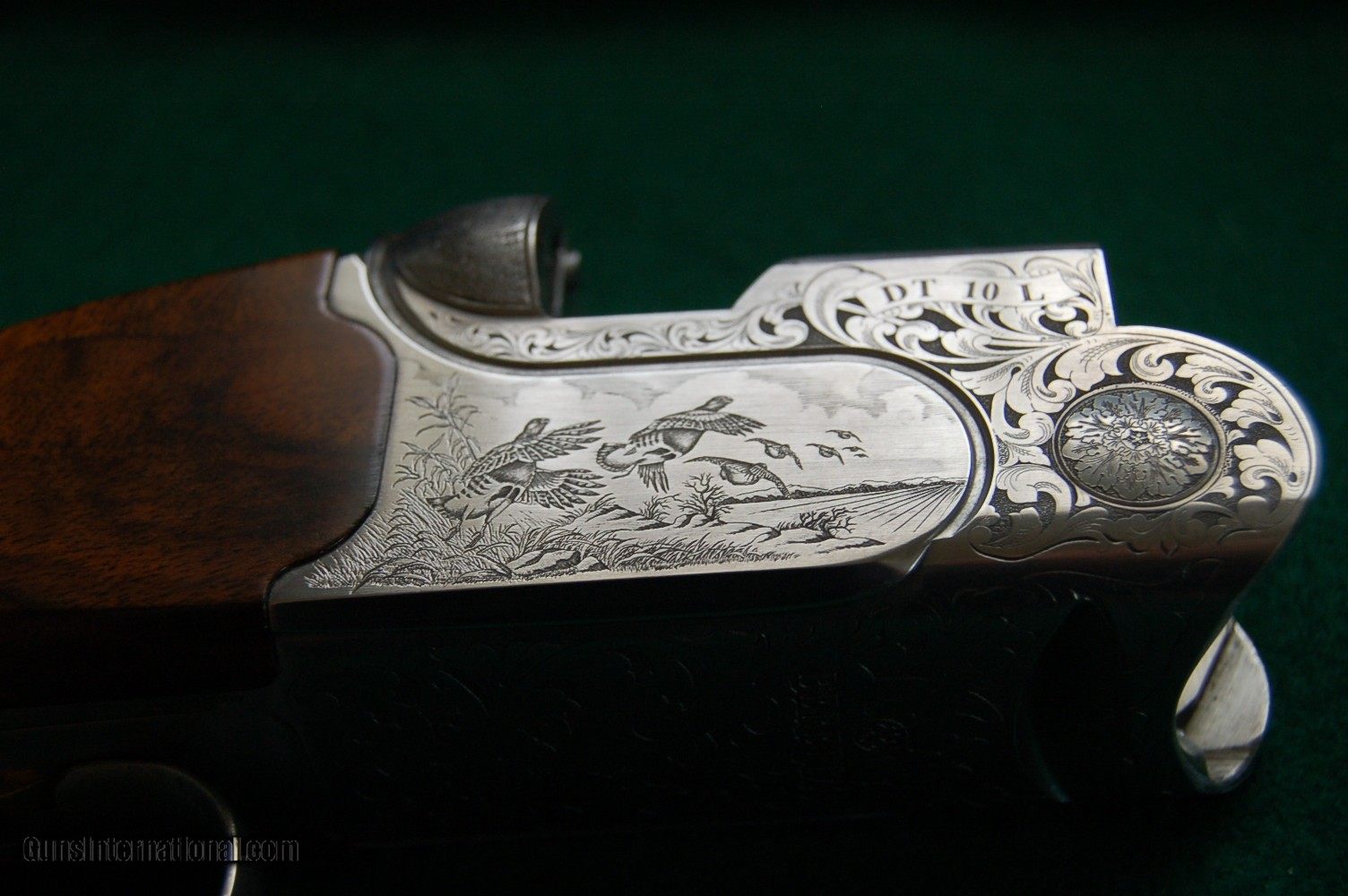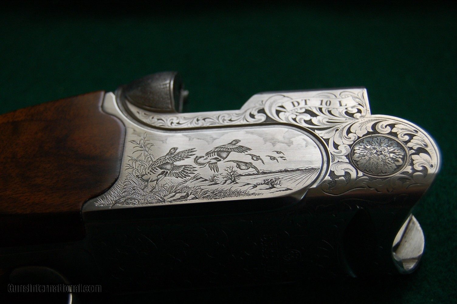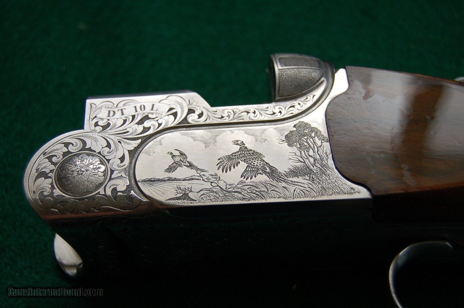 Description: A single owner DT-10 L Sporter with all the original chokes, stock tool, books and carry case. The stock has a few handling dings, but barrels and engraving are in perfect condition. $7800.00 + S&H SOLD Thank you SOLD Shotgun Gauge: 12 Gauge Manufacturer: Beretta Model: DT-10 L Serial Number: AG1857B DT10 Barrel Length: 28 Ejectors: yes Condition: 90% Metal Condition: 95% Wood Condition: 90% Triggers: single with selector in safety Stock: European walnut Butt Pad: leather face declarator LOP: 14.5 over pad with adj. trigger Chokes: a full set Case: factory |
