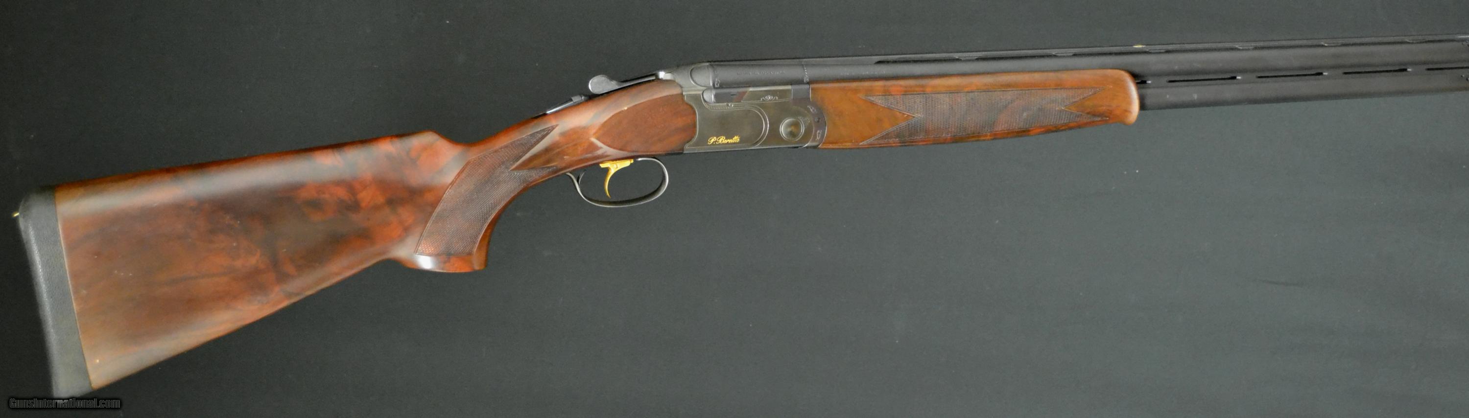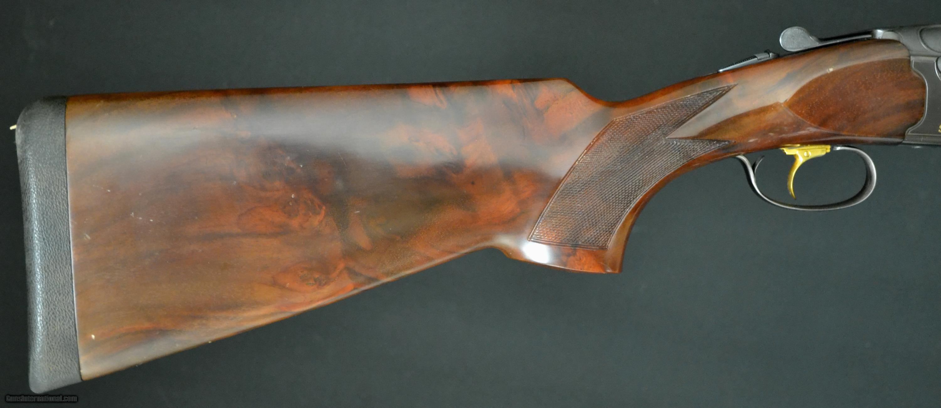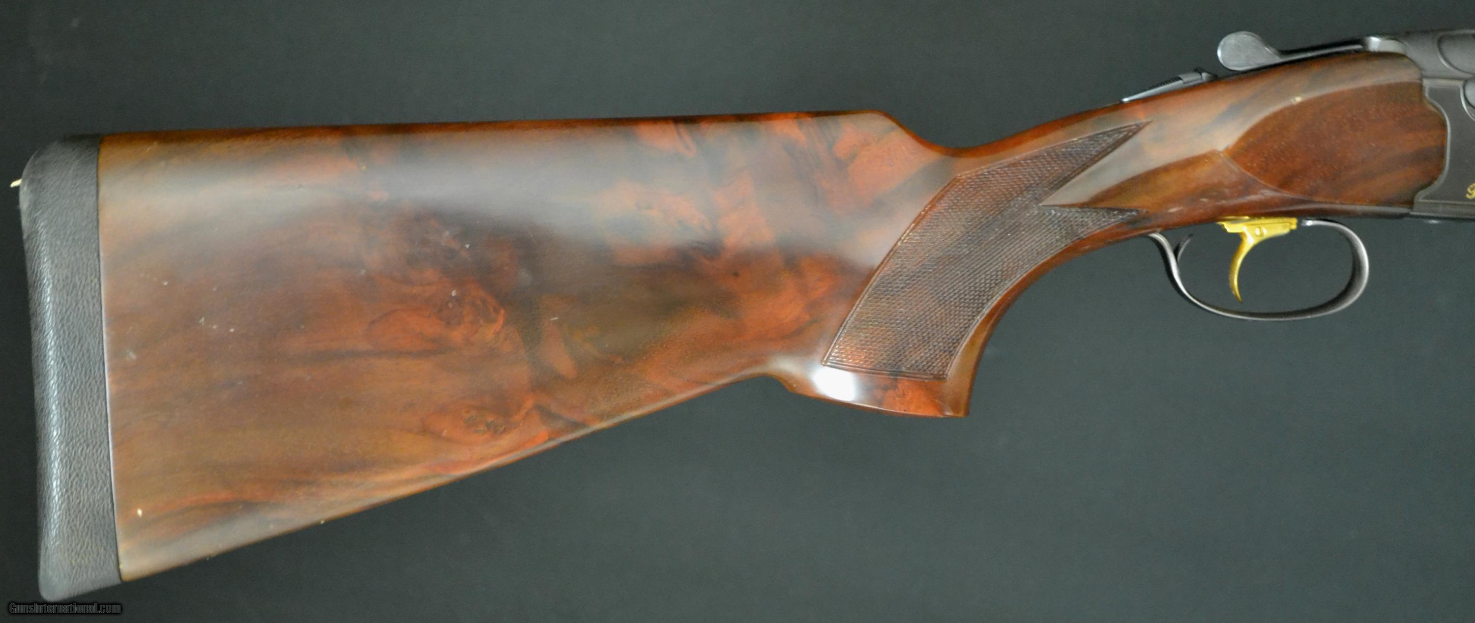 Description: Beretta 682 Gold E - Super Sporting O/U, 12ga.,30", 3" chambers and screw-in chokes. Features the very durable "Greystone" titanium nitrate finished receiver, ported matte finish barrels, automatic ejectors, adjustable Single Selective Trigger, low-gloss checkered walnut stock with satin finish. The shotgun is in 99% condition and appears to be unfired. Inv.# 34090 14 3/4" x 1 1/2" x 2 3/8" 7lbs., 6oz. $3,250.00 SOLD |