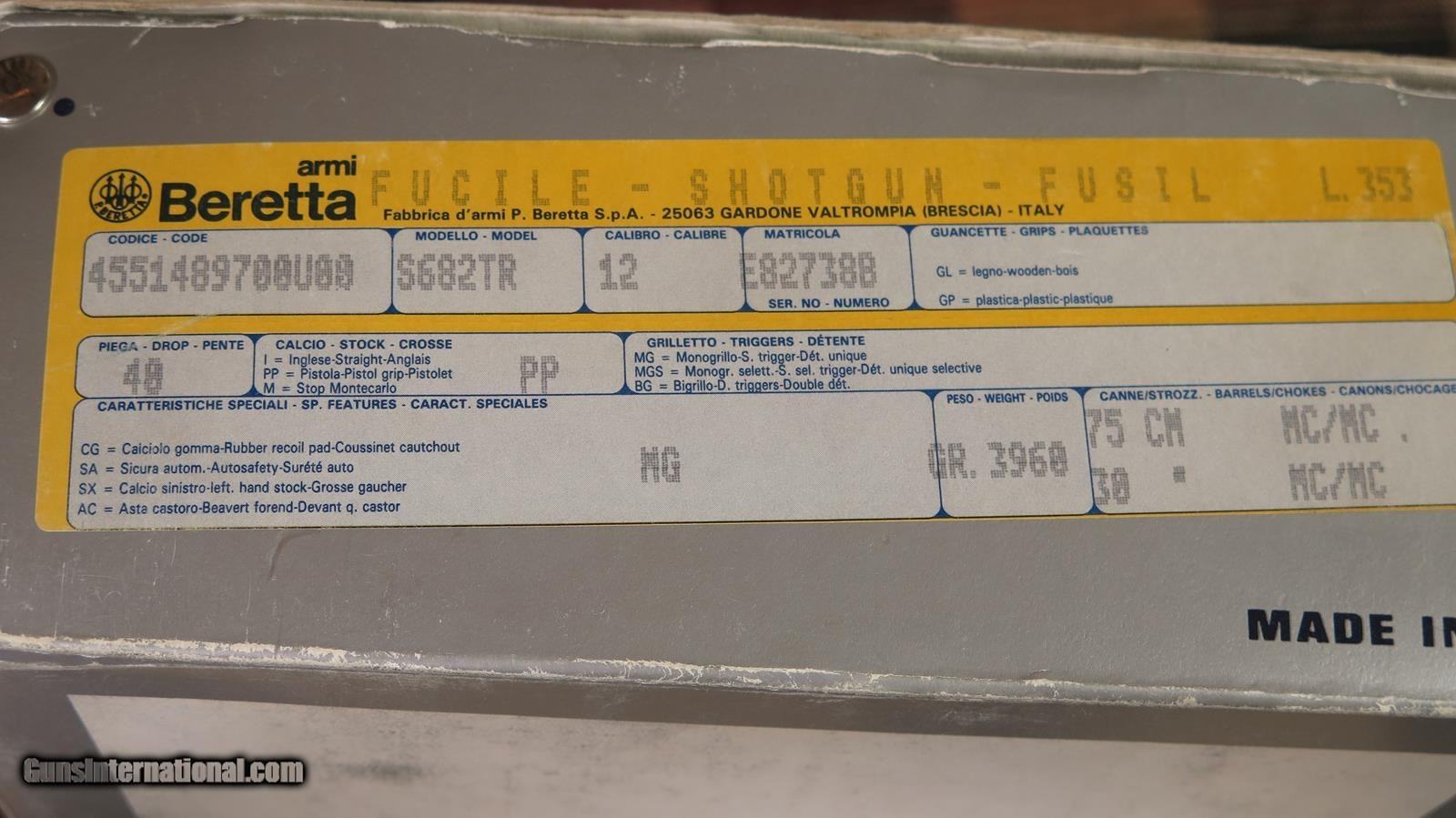 Description: Beretta 682 Trap 12ga. 30 inch barrels. 4 Beretta choke tubes with wrench. 14 1/2 LOP but is adjustable by trigger. 98-99% excellent condition. Lever to the right. Action is tight. Nice wood. Excellent bores. With box and papers. SOLD Shotgun Gauge: 12 Gauge |