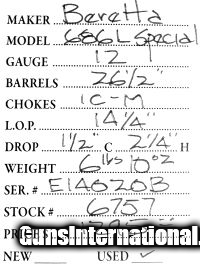 Description: Beretta 686 L Special 12 gauge SOLD Serial Number: E14020B Barrels: 26 1/2 Stock Comb: 1 1/2 Stock Heel: 2 1/4 LOP: 14 1/4 Weight: 6lbs 10oz Chokes: IC-M |