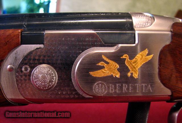 Description: Beretta 686 White Onyx 20 Gauge one of 3300 for Ducks Unlimited in 2008. 28" vent rib ejector Excelsior Steel barrels with silver front bead. Barrels with three removable chokes .011 [IC] .015[M] .030[F]. French silver reciever with two duck gold inlays on each side. Gold plated single selective trigger. Pistol grip buttstock with 14 3/8" LOP to factory removeable 3/8" pad with included extra 5/8" pad. Field forend with schnable tip. Point pattern checkering. Cased in its factory plastic hard case with all paper work, oil bottle, choke wrench, and sling swivels. This gun remains in new condition and appears to be unfired. SOLD |