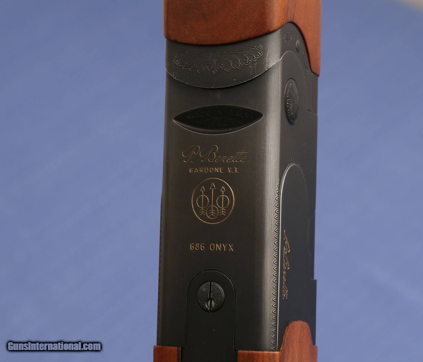 Description: 1997 - Beretta - 686 Onyx Sporting - 12ga, 3", 28" Mobilchoke Bbls w/ Strada Rib - LOP 14-7/8", Drop 1-3/8" to 2-3/8", Cast Off, Weight - 8 lbs. 0 oz. Excellent Condition with Very Nice Wood. Metal is about 96+% with just slight thinning at some high edges. Wood is about 98+% with just a few minor handling marks. Includes: Original Box, Four Chokes, Choke Wrench.