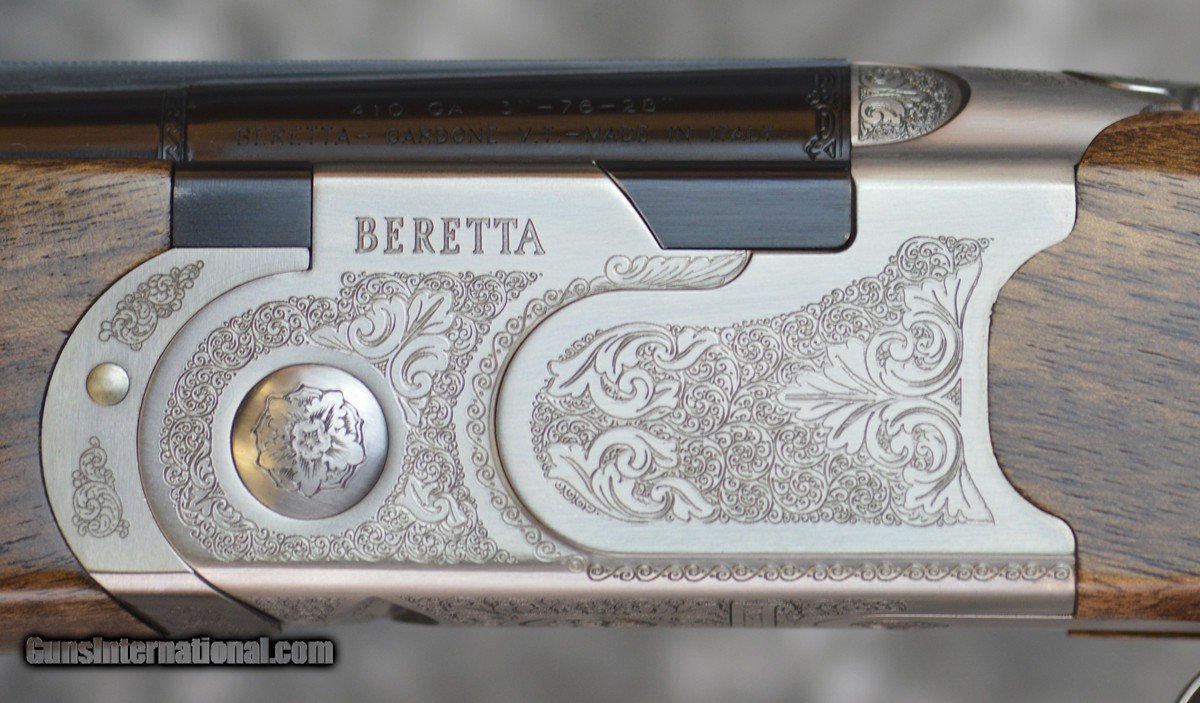 Description: New Beretta 686 Silver Pigeon I Field .410 Bore with 28" Mobil choked barrels, 6x6 parallel field rib. Nickel finished receiver with roll engraving, automatic safety and selective trigger. Factory pistol grip stock, schnabel forearm. Built on scaled 28GA frame. Includes factory case, chokes and tools. SOLD |