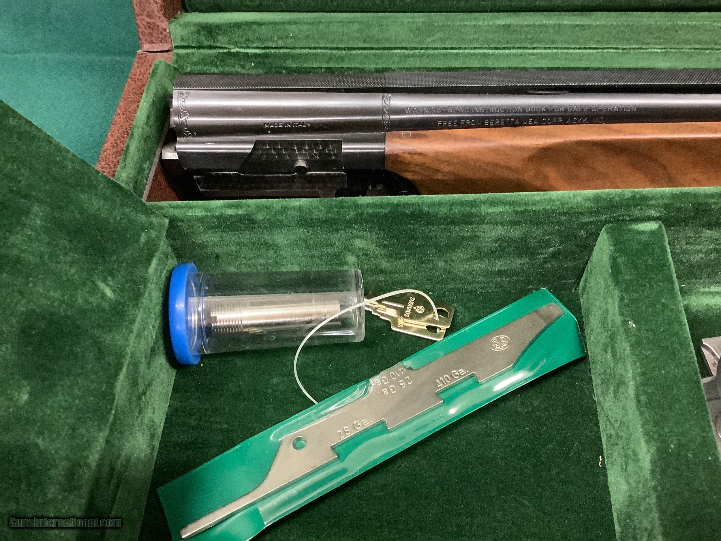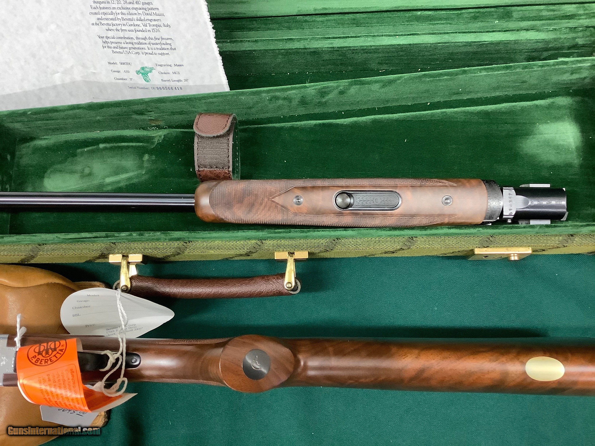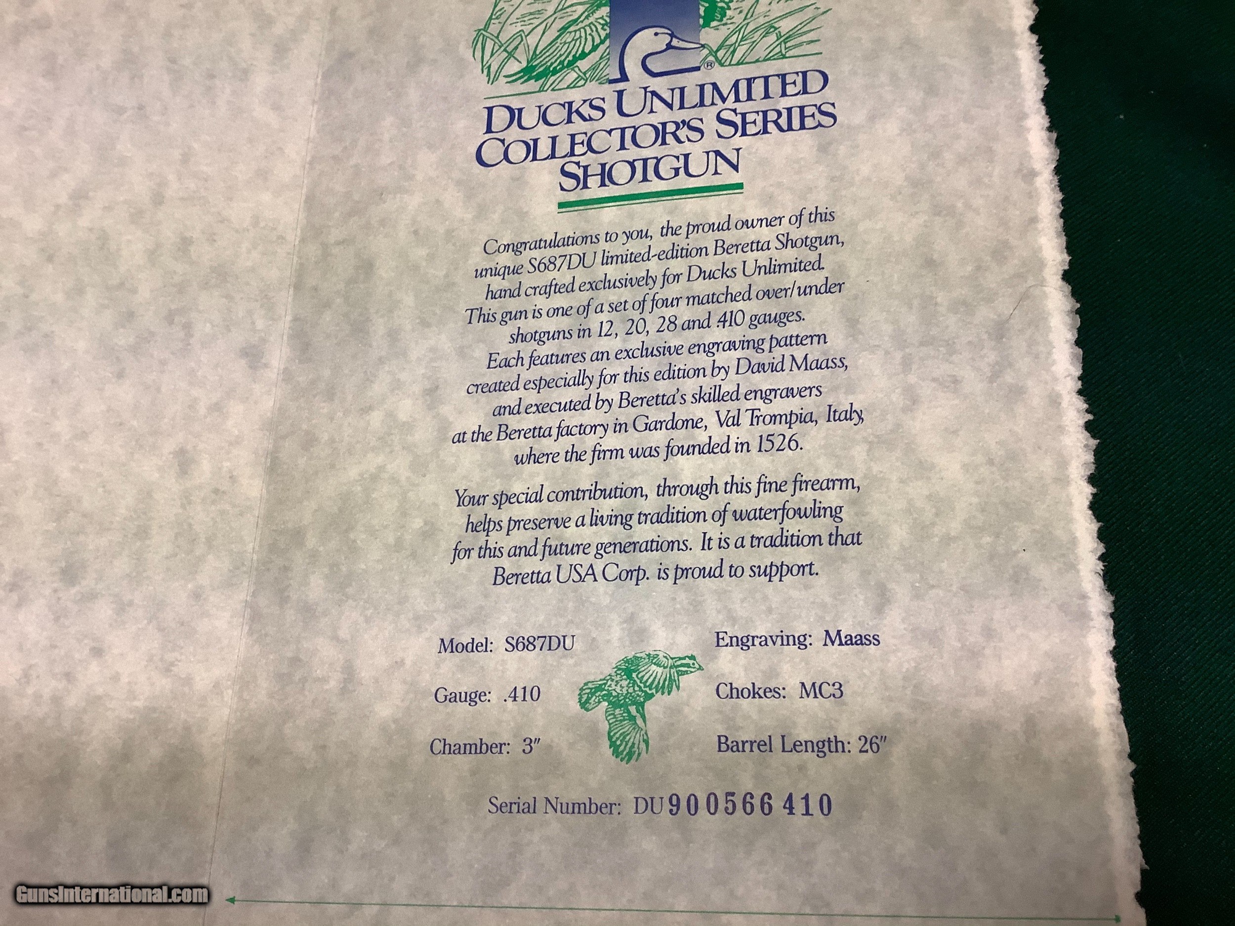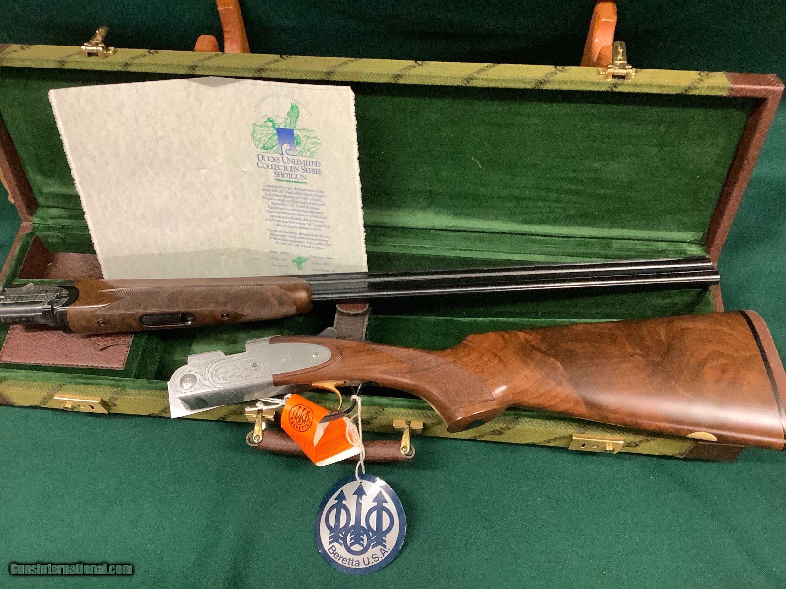 Description: Beretta 687 DU, .410 ga. With 3 tubes total,this gun was made in 92 or 93 and remains new in case,it is basically the same as a 687 eell that was made for ducks unlimited to sell at their s , The picture of the certificate give all the specs. Please email or call with questions,thanks, Jim SOLD |