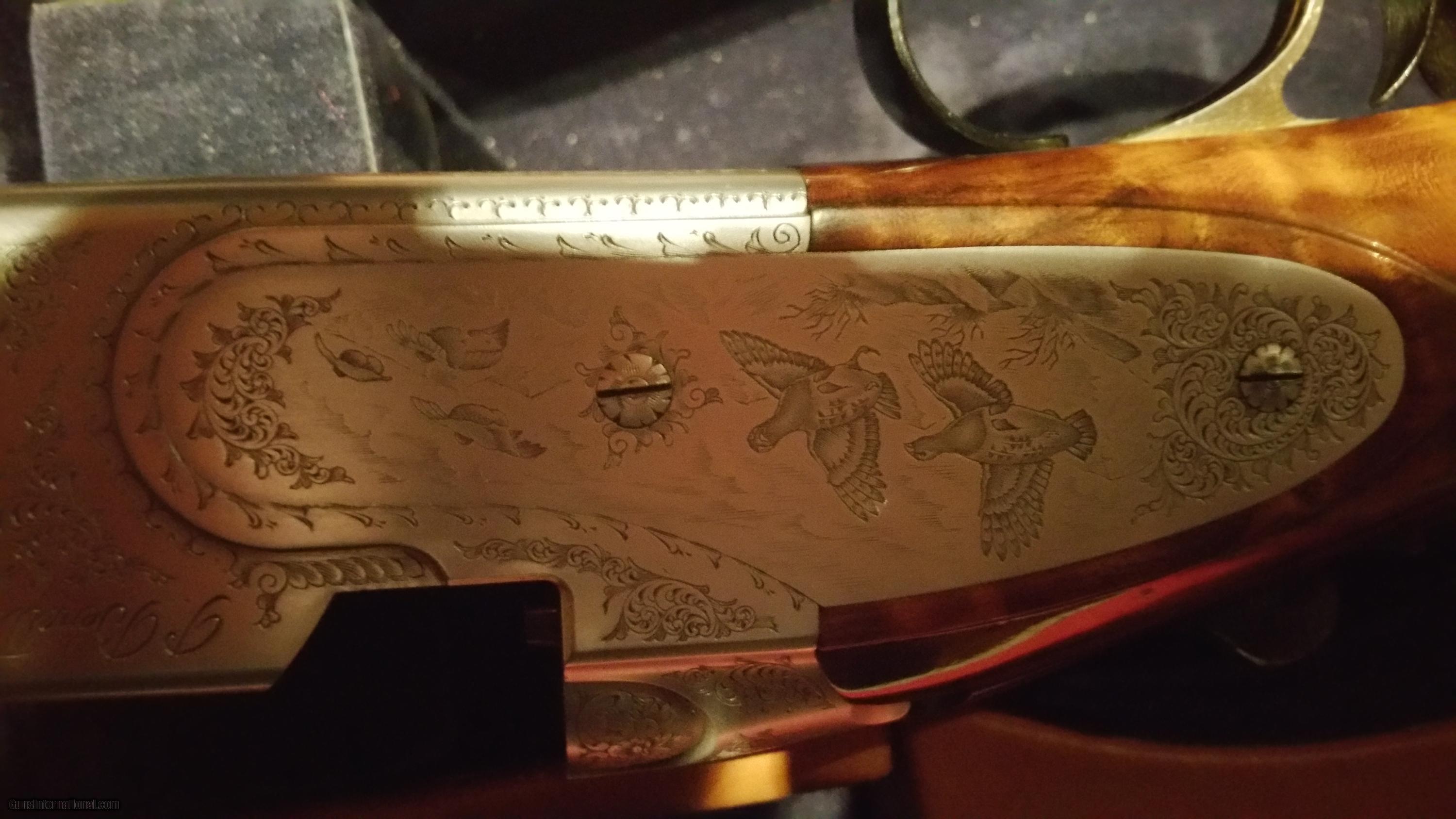 Description: Up for sale is a beautiful 687 EELL Beretta. This sweet little 5lb 15 oz. O/U, with the stock measuring 1 1/2 DAC 2 3/8 DAH and 14 3/8 LOP. 28" barrels, 5 choke tubes, SST, ejectors with a beautifuly hand engraved sideplated receiver illustrating mallards in flight on one side, grouse on the other and a woodcock game scene on the belly. This art work is beautifully surrounded with absolutely gorgeous furniture all displayed in its Beretta hard case. This gun is in excellent plus condition with only the slightest of handling marks. It hurts me to lower the price this low, but due to unforseen curcumstances, I need to sell a few things quickly. Feel free to call 937-418-2179 with any questions. SOLD Manufacturer: Beretta Model: 687 EELL Chambers: 2 3/4 & 3 Ejectors: yes Condition: EXCELLENT Metal Condition: EXCELLENT Wood Condition: EXCELLENT Bore Condition: EXCELLENT Barrels: 28 Barrel Type: O/U Triggers: SST Gauge Info: 20 Stock: PG Weight: 5lb 15 oz Chokes: Multi Engraving: Giovanelli Extras: Makers Case |