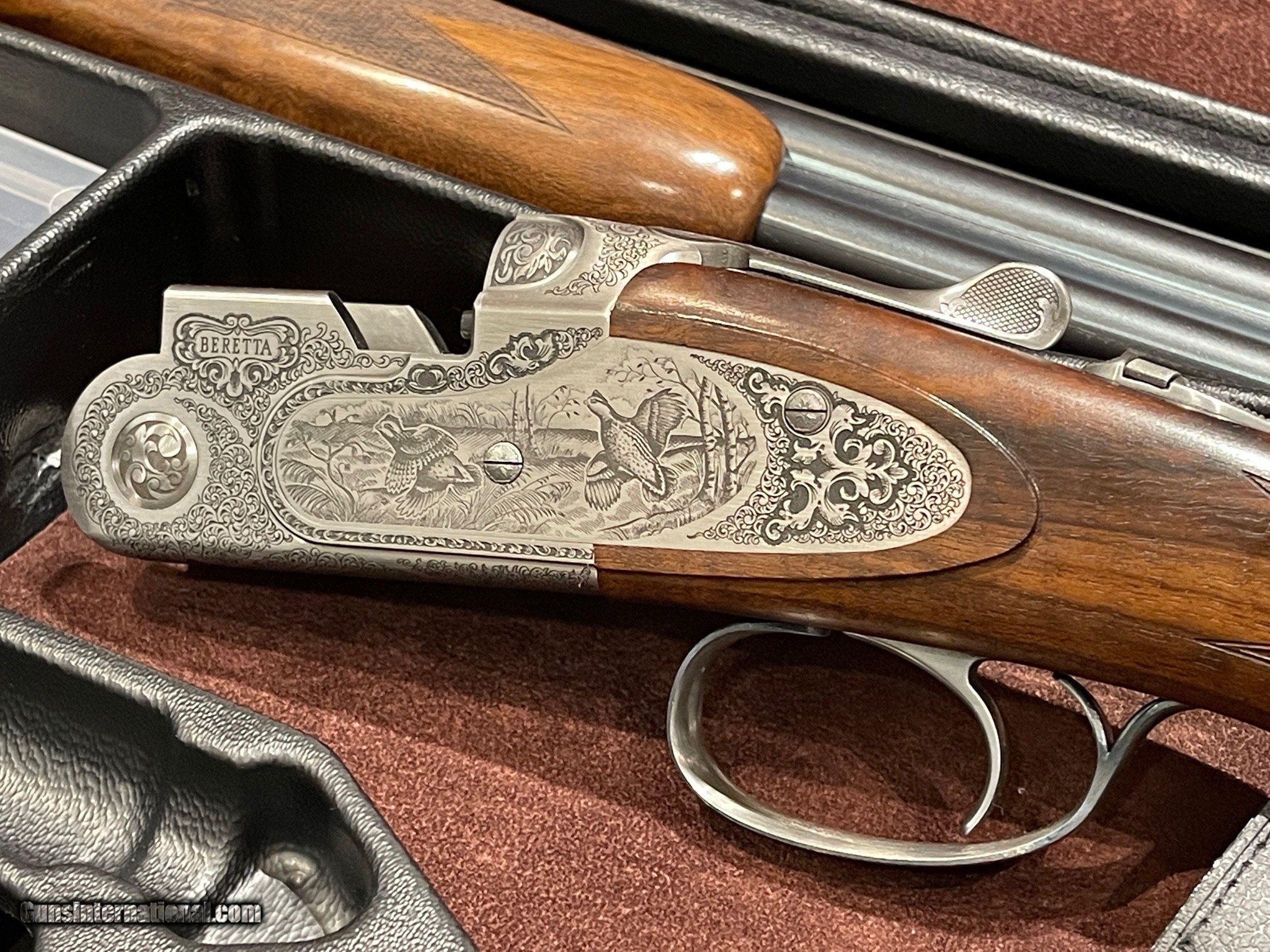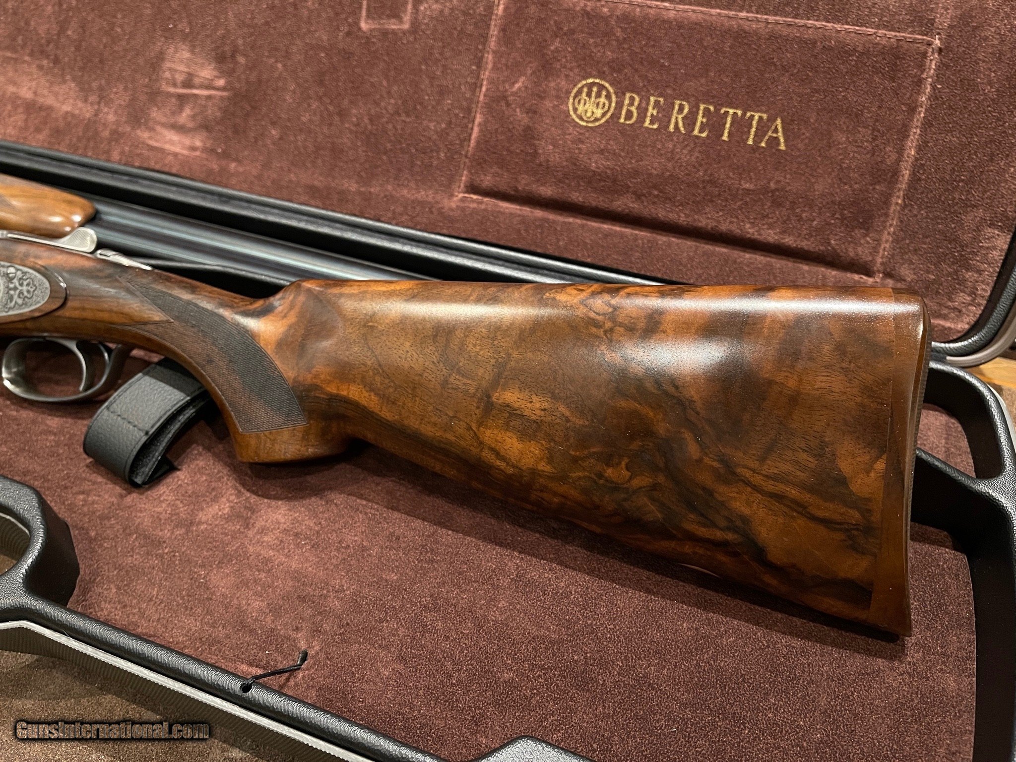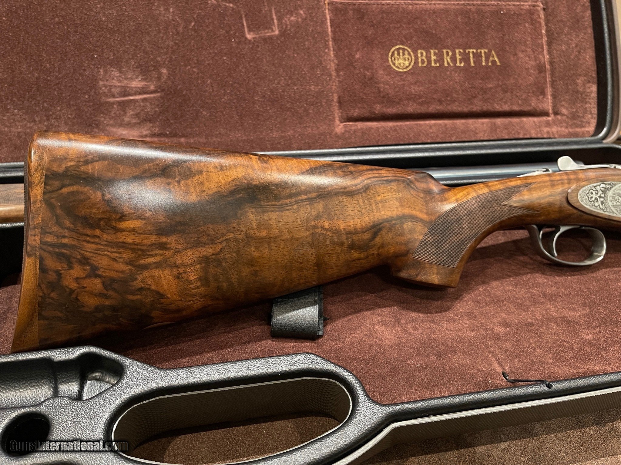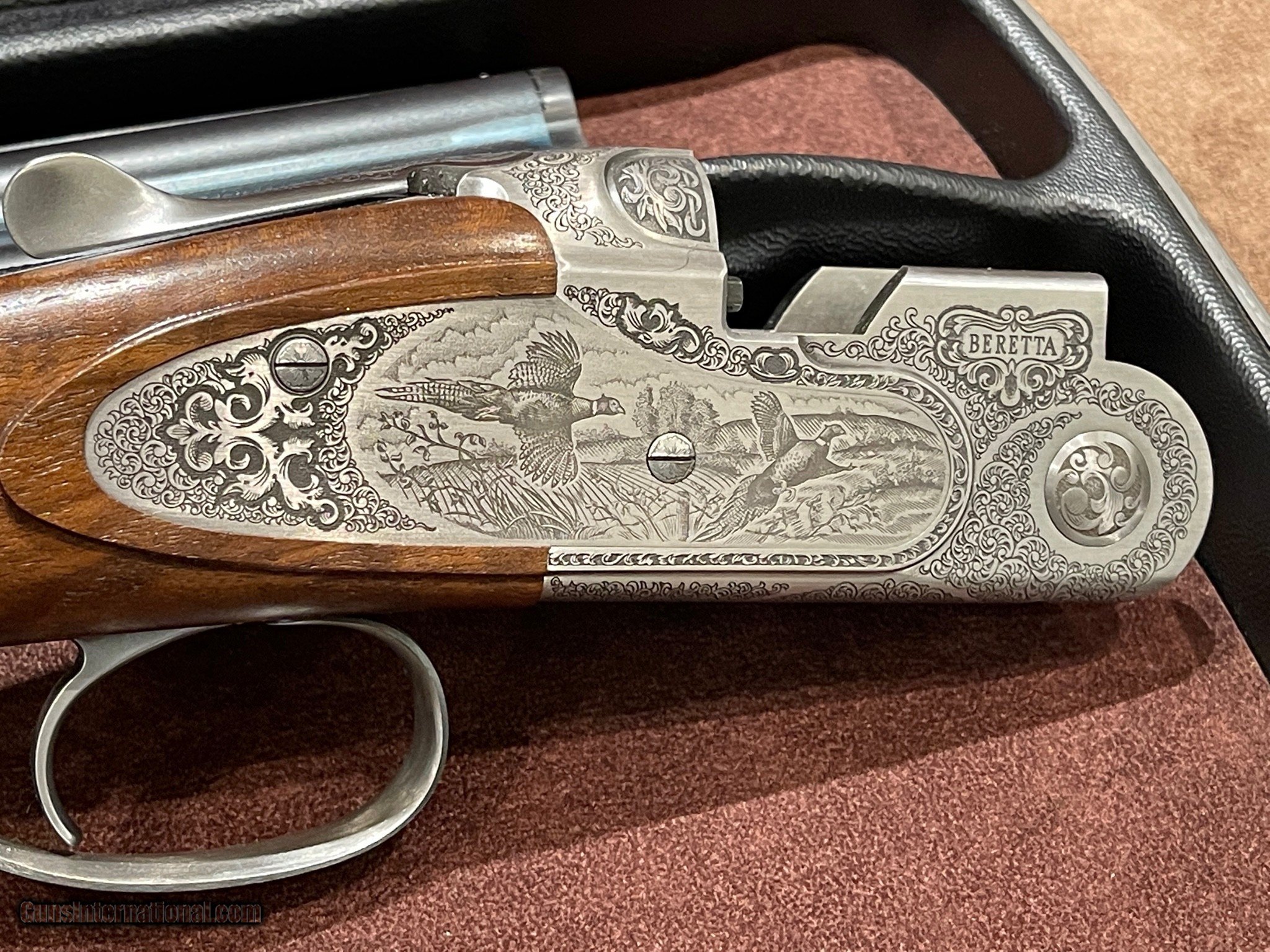 Description: Berett 687 EELL Diamond Pigeon 20ga 28" barrels The exceptionally strong, low-profile receiver is elegantly adorned with exquisite game scene and intricate scroll engravings, made with the best in class premium laser engraving technology. The stock and fore-end are superior quality walnutembellished with hand cut checkering, demonstrating how improved performance and refined beauty can be perfectly matched. SOLD Shotgun Gauge: 20 Gauge |
