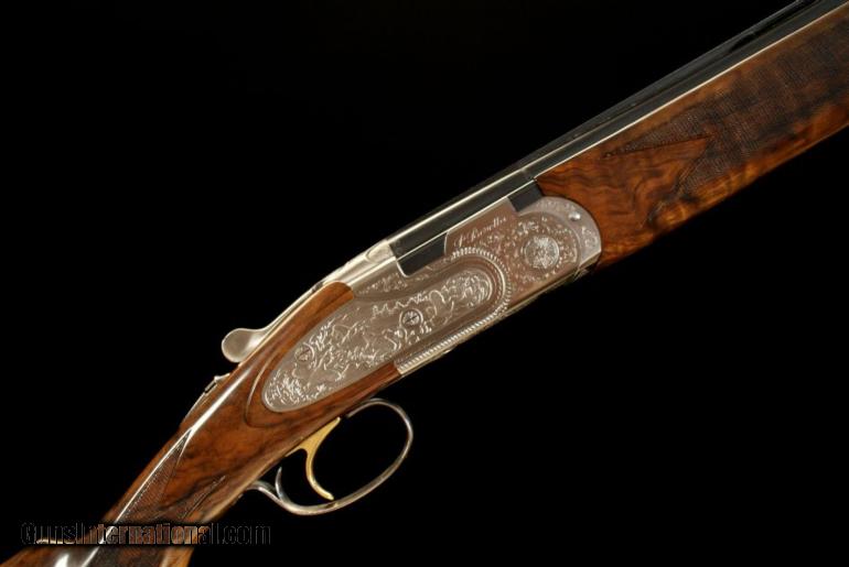 Description: Beretta 687 EL Gold Pigeon II, 28 bore, 2 3/4" chambers, 28" barrels with screw-in chokes, 6 lbs. 4 oz., 14 3/8" LOP over a thin 1/2" pad, 1 1/2" DAC, 2 3/16" DAH, 1/8" cast off, pistol grip, single selective gold trigger, ejectors, vent rib, highly figured walnut, full sideplates with deep relief games scenes, cased in a Beretta case with accessories. An upgraded and less common version of the 687. This gun remains in as new condition. SOLD |
