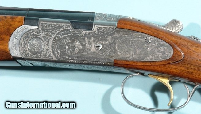 Description: BERETTA 687 EXTRA GRADE 28GA / 410GA TWO BARREL 28" SHOTGUN IN CASE, CIRCA 2002. Both barrels match receiver and are also relief inlaid with "1" & "2" on top of rib in gold. Both 28" and both threaded for chokes tubes which are absent from both barrels(mobil choke system). Barrels are near mint with no signs of use. Forends same almost unused condition with extra fine wood(lil better on gun "1". Receiver with crisp game scene false sideplates by Giovanelli (factory engraver) like new condition. Buttstock excellent as well with right and cast and 14 1/2" LOP over factory rubber pad and very little signs of carry. Gun weighs just under 6lbs. Two barrel set factory case for larger frame trap 2 bbl set(up to 34") but better than no case. SOLD |