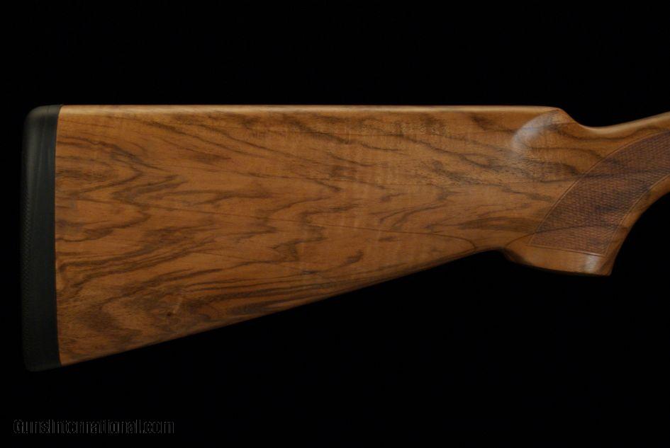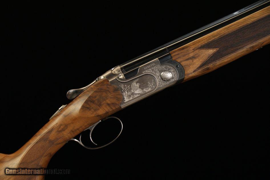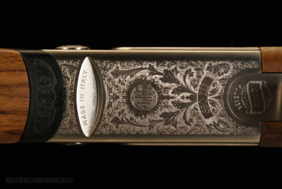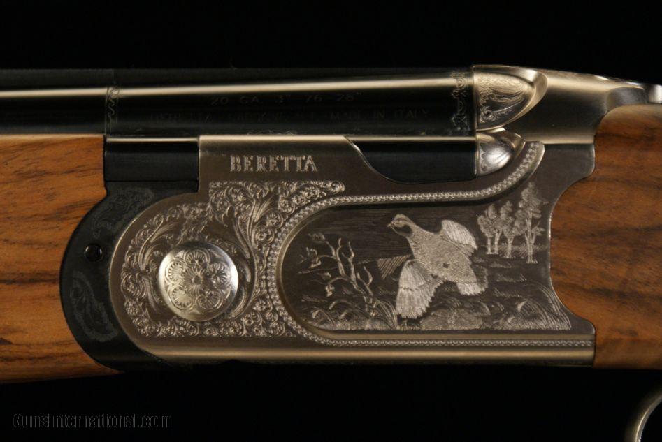 Description: Beretta 690 Field Grade III, newest over/under model from Beretta that will eventually replace all 686 and 687 Silver Pigeons, this first version is a grade III, 20 bore, 3" chambers, 28" barrels with new Optima HP screw-in chokes, selectable ejection or extraction, 6 lbs. 3 oz., 14 3/4" LOP over a pad, 1 1/2 DAC, 2 1/4" DAH, neutral cast, pistol grip, vent rib, single selective trigger, silver action engraved with acanthus scroll work and game scenes featuring a woodcock in flight on right and quail on left, nicely figured European walnut with oil finish. Comes with hard case and extra choke tubes. New and in stock. Gun number N64044S. SOLD |