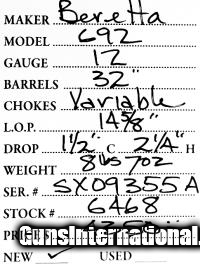 Description: Beretta 692 12 gauge SOLD Serial Number: SX09355A Barrels: 32 Stock Comb: 1 1/2 Stock Heel: 2 1/4 LOP: 14 5/8 Weight: 8lbs 7oz Chokes: Variable |