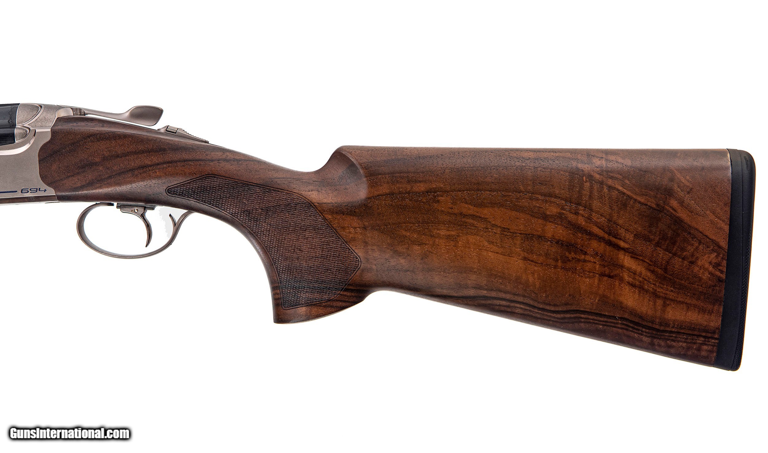 Description: Beretta 694 12ga 30" Sporting Shotgun SN: #ST03778R The winning edge Designed and tested in collaboration with the Beretta Shooting Team, 694 is the new over-and-under platform designed specifically for competition shooting, with a precise objective in mind: to help shooters increase their success rate. Thanks to a meticulous mechanical and ergonomic design process, the 694 represents a perfectly balanced over-and-under competition shotgun. Natural and immediate when shouldering, it features a precise swing and it’s easy to control. Technical Features The new shape of the action and the stock provide increased field of vision, while the new forend iron system allows the user to maintain the opening load constant over time, and the Steelium Plus barrels guarantee a dense, uniform pattern every time. The slim, modern design lends the 694 a "racing" feel, for a bold, winning look. The ergonomics of the stock has been completely redesigned to provide the ideal configuration for every discipline. The first new feature is the way the action is bedded into the stock, where the profile of the action is accompanied by two progressive grooves, thus reducing the presence of obstacles in the field of view when shouldering the gun: this important development helps the shooter to avoid having to raise his/her head from the line of sight, a movement that often results in a "zero". The 1.5 pitch checkering and increased surface area guarantee the best possible grip. The 2,5+ grade wooden components are treated with natural oil, for increased water resistance. The new steel forend iron system improves the sensation when opening the gun, thanks to the redesigned geometry and the barrel hook, which is fitted with a replaceable latch that may be substituted by any Beretta Certified Dealer in order to maintain the owner's preferred loading configuration. The forend coupling system has also been redesigned and now consists of a piston-operated stud in an advanced position, separate from the forend iron, and a self-regulating auget button. The metallic surfaces, which are subject to overheating in continuous usage, have been drastically reduced, benefitting the shooter's hands. The newly designed, steel action has a modern, sporting look, and features side panels with a mirrored profile and diagonal lines underlined by a blue graphic design. The bottom of the action is decorated with Beretta's three arrows and 694 logo, again in blue, while the Nistan finishing lends it the typical matte grey colour. The weight has been increased by approximately 25 g, again improving stability and balance. The gun features the classic Beretta closing system with trapezoidal shoulders and two rugged pins that protrude from the breech face and are inserted into their respective housings on the sides of the breech, while the front part of the action is fitted with two hinged studs that are inserted into the respective housings on the monoblock. The trigger group features a three-position adjustable trigger and a fixed lock served by two robust coil springs mounted on spring guides The firing selector, present on the sporting version only, is located inside the safety lever that features new checkering and ergonomics. The steel top lever features a new, low profile and an anti-glare finish and has been designed to be ergonomic and easy to operate for both right and left-handed shooters. The newly designed ejectors are fitted with powerful springs positioned behind the ejector slide and under the stop pads. Thanks to its unique manufacturing process, Steelium is the barrel production technology which enables Beretta tri-alloy steel to become a true ballistic gem. Deep drilling, cold hammer forging and vacuum distension provide the steel with mechanical characteristics that are ideal when superior ballistic performance has to be achieved. The Steelium Plus barrels boast an internal tube profile with a highly elongated progressive triple cone that varies with the length of the barrel, reaching as far as 300 mm from the muzzle. The advantages are: • more dense and uniform patterns with very high penetration and target hitting performance • quicker and more accurate second shot • reduction in perceived muzzle jump The barrels are assembled as a monoblock with internal chrome plating, the sporting version is equipped with a set of 5 Optima Choke High Performance chokes. The 694 is already perfectly balanced when it leaves the factory, but more demanding shooters may use the optional B-Fast Balancing System to customize the configuration to suit their needs. The 694 barrels are designed to accommodate a system of 15, 10 and 5 g weights that can be positioned in the five available slots in the muzzle and under the forend (the weights may be purchased separately). Thanks to the fitting system on the lateral rib openings, the weight is distributed along the whole length of the barrel, improving the weapon's swing and reducing muzzle jump but without causing any noise or vibrations during the shot. In addition, their design has been developed to perfectly fit the lateral ribs ensuring there is no risk of them being lost or visibility being impeded. The top rib is ventilated via a 10x8 profile on the sporting version and features a white front sight and ventilated side ribs. Condition New Manufacturer Beretta Model 694 Type Sport Gauge 12 Barrel Weight 1550 gms Barrel Length 30" Gun Weight 8lb 4oz Chamber 3" Bore Diameter 18.6 Chokes Extended OB HP IM,M,C,S,IC Rib Sport Stock Dimensions Pistol Drop Nose 1 1/2" Drop Heel 2" Comb Fixed Cast RH LOP 14 1/2" ADJ Forend English SOLD Shotgun Gauge: 12 Gauge |
