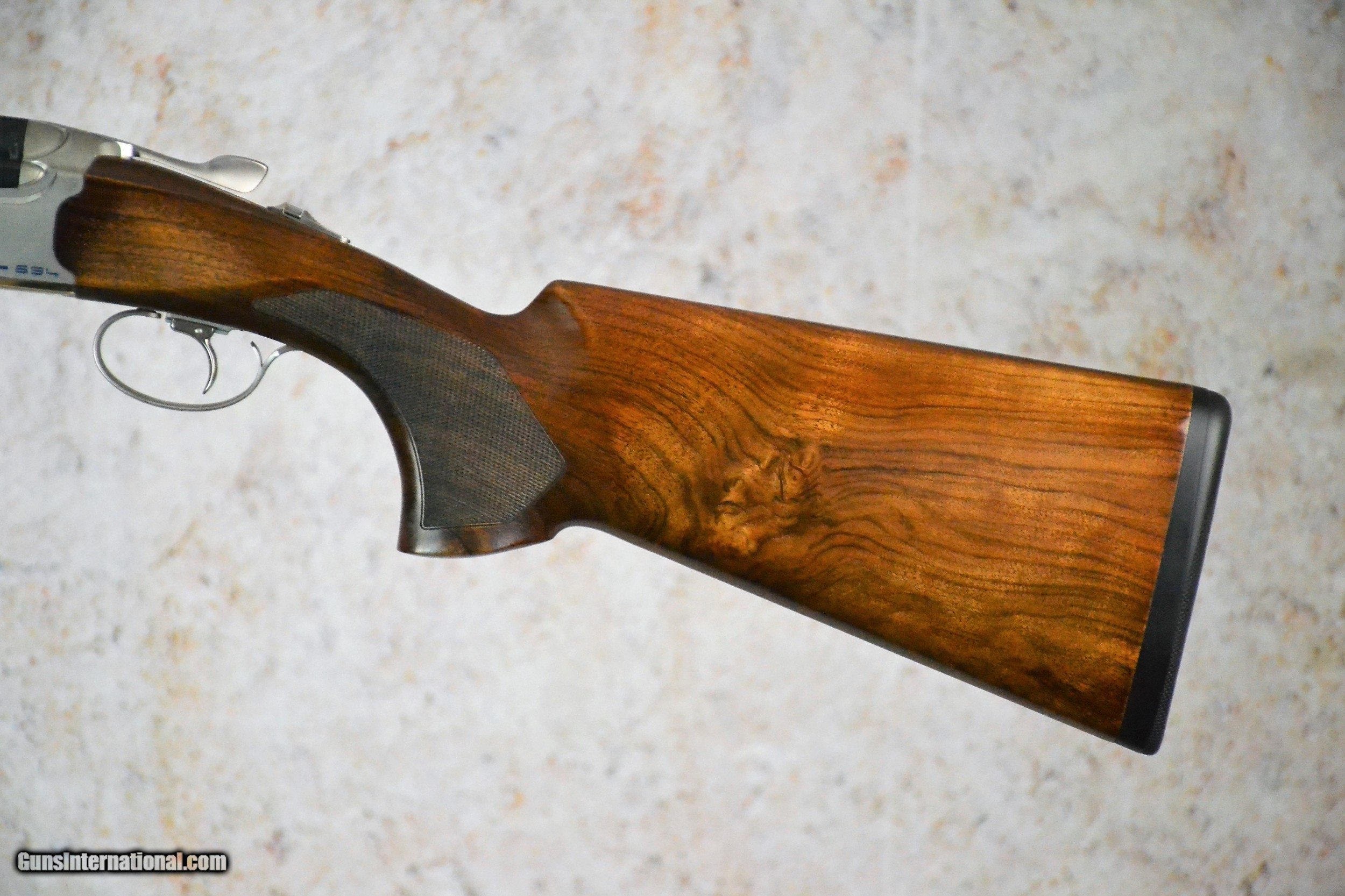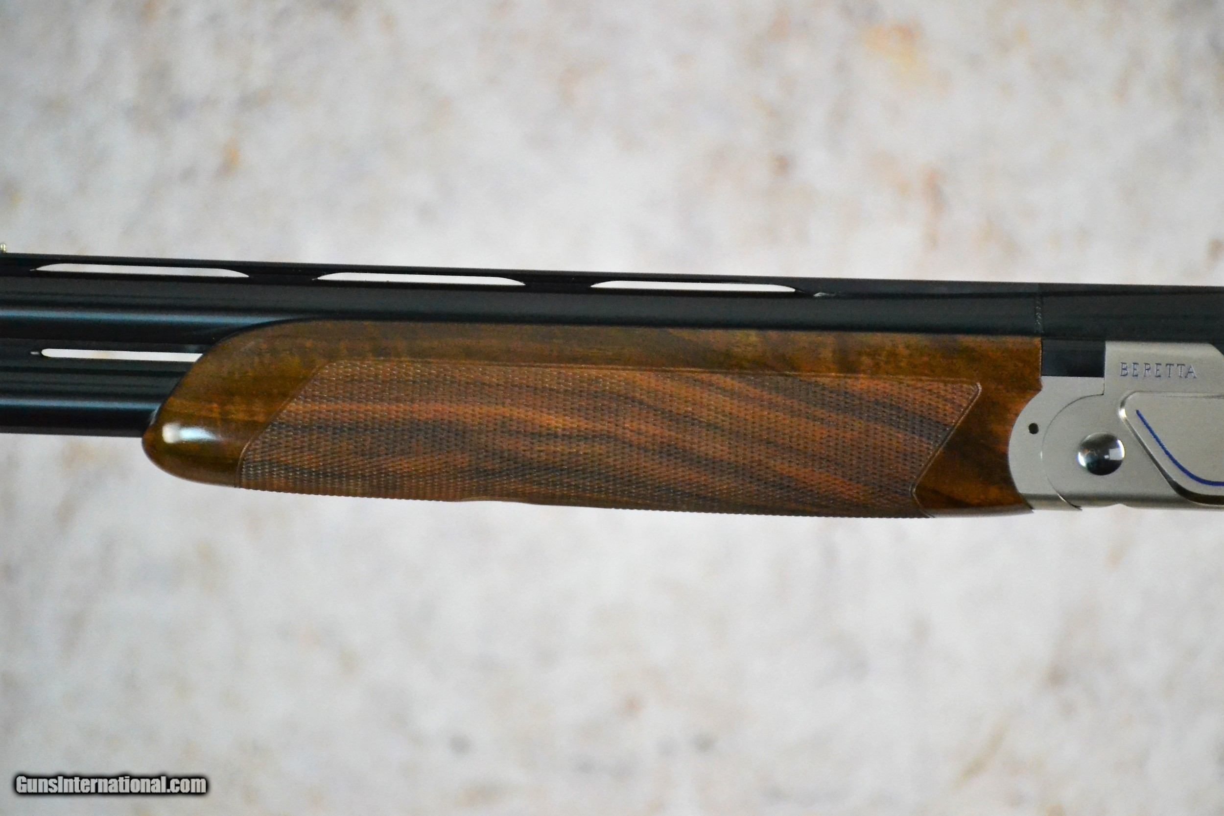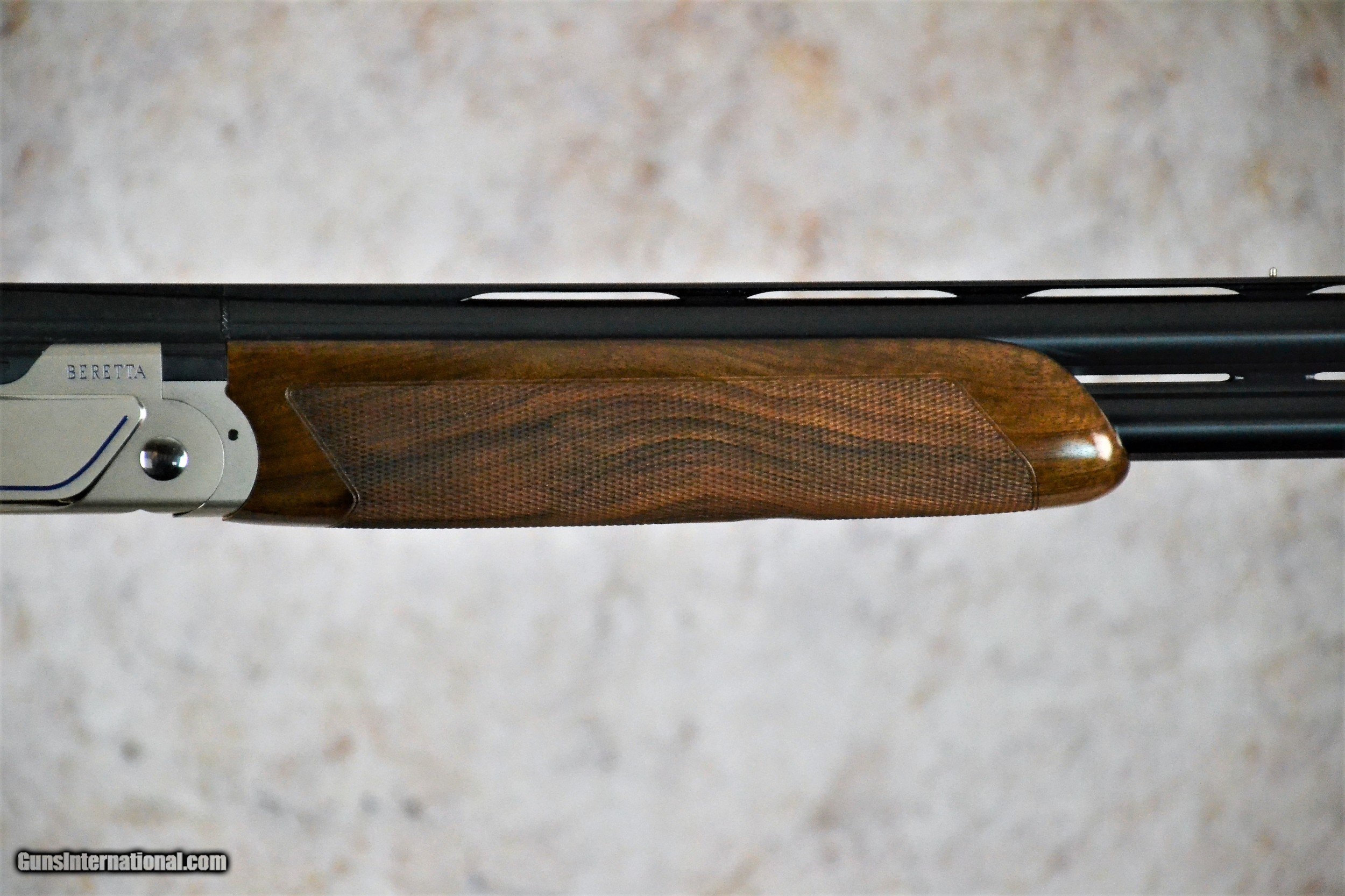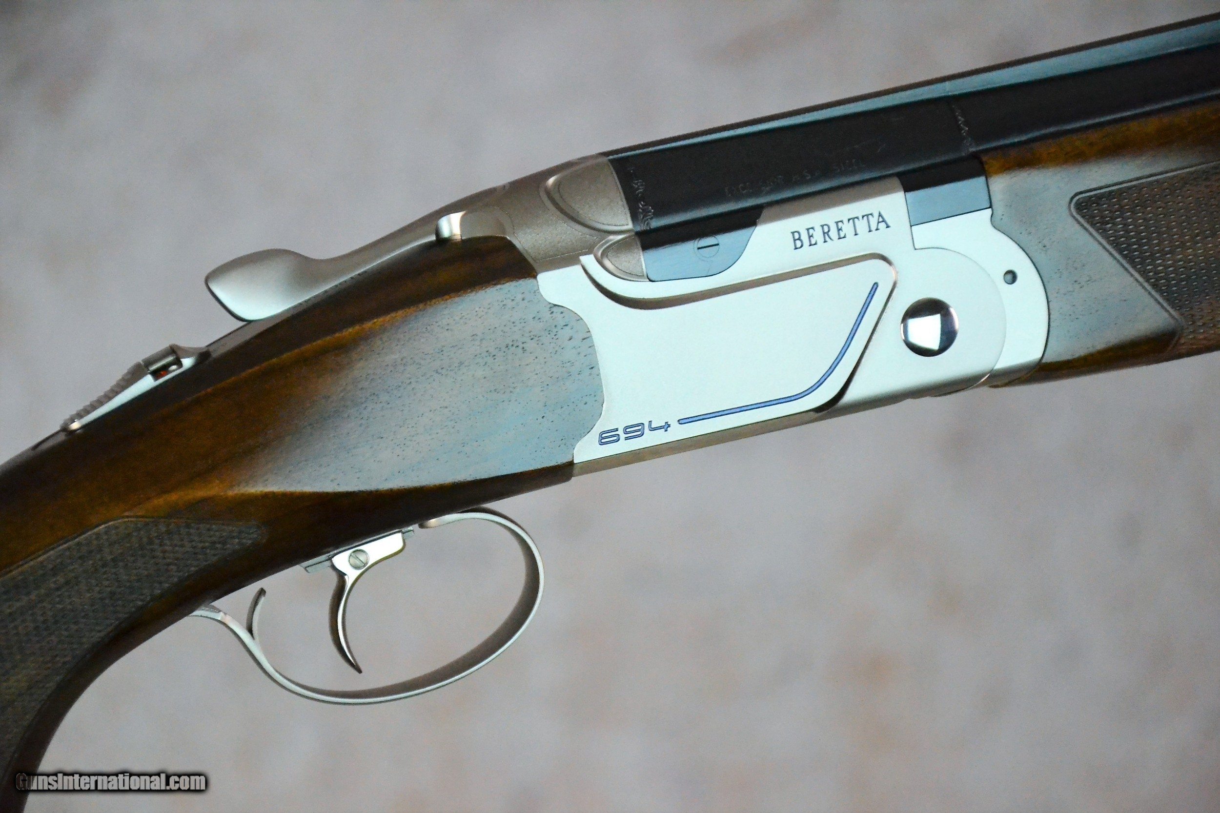 Description: Beretta 694 Sporting 12g 30" SN:#ST00734R The new shape of the action and the stock provide increased field of vision, while the new forend iron system allows the user to maintain the opening load constant over time, and the Steelium Plus barrels guarantee a dense, uniform pattern every time. The slim, modern design lends the 694 a "racing" feel, for a bold, winning look. The ergonomics of the stock has been completely redesigned to provide the ideal configuration for every discipline. The first new feature is the way the action is bedded into the stock, where the profile of the action is accompanied by two progressive grooves, thus reducing the presence of obstacles in the field of view when shouldering the gun: this important development helps the shooter to avoid having to raise his/her head from the line of sight, a movement that often results in a "zero". On the sporting version, the stock has been completely redesigned and features a widened blade and comb, and a lengthened pistol grip with palm swell in order to provide maximum comfort while ensuring the position of the hands is extremely natural and stable. The 1.5 pitch checkering and increased surface area guarantee the best possible grip. The 2.5 + grade wooden components are treated with natural oil, for increased water resistance. It is possible to add 20 g and 40 g weights inside the stock to personalize the weapon's balance (these may be purchased separately). The new steel forend iron system improves the sensation when opening the gun, thanks to the redesigned geometry and the journal, which is fitted with a replaceable latch that may be substituted by any Certified Beretta Dealer in order to maintain the owner's preferred loading configuration. The forend coupling system has also been redesigned and now consists of a piston-operated stud in an advanced position, separate from the forend iron, and a self-regulating auget button. The metallic surfaces, which are subject to overheating in continuous usage, have been drastically reduced, benefiting the shooter's hands. The newly designed, steel action has a modern, sporting look, and features side panels with a mirrored profile and diagonal lines underlined by a blue graphic design. The bottom of the action is decorated with Beretta's three arrows and 694 logo, again in blue, while the Nistan finishing lends it the typical matte grey color. The weight has been increased by approximately 25 g, again improving stability and balance. The gun features the classic Beretta closing system with trapezoidal shoulders and two rugged pins that protrude from the breech face and are inserted into their respective housings on the sides of the breech, while the front part of the action is fitted with two hinged studs that are inserted into the respective housings on the mono block.