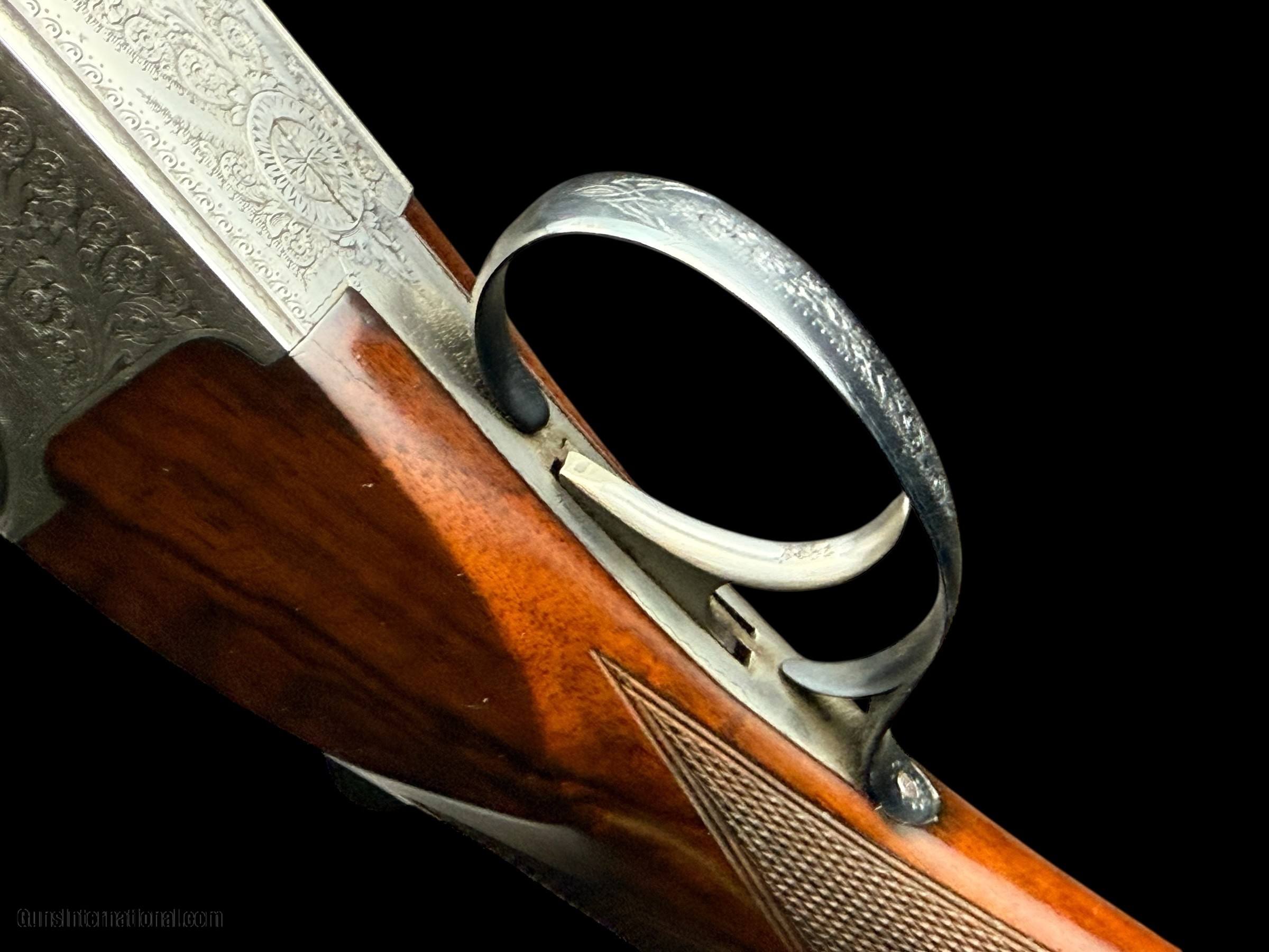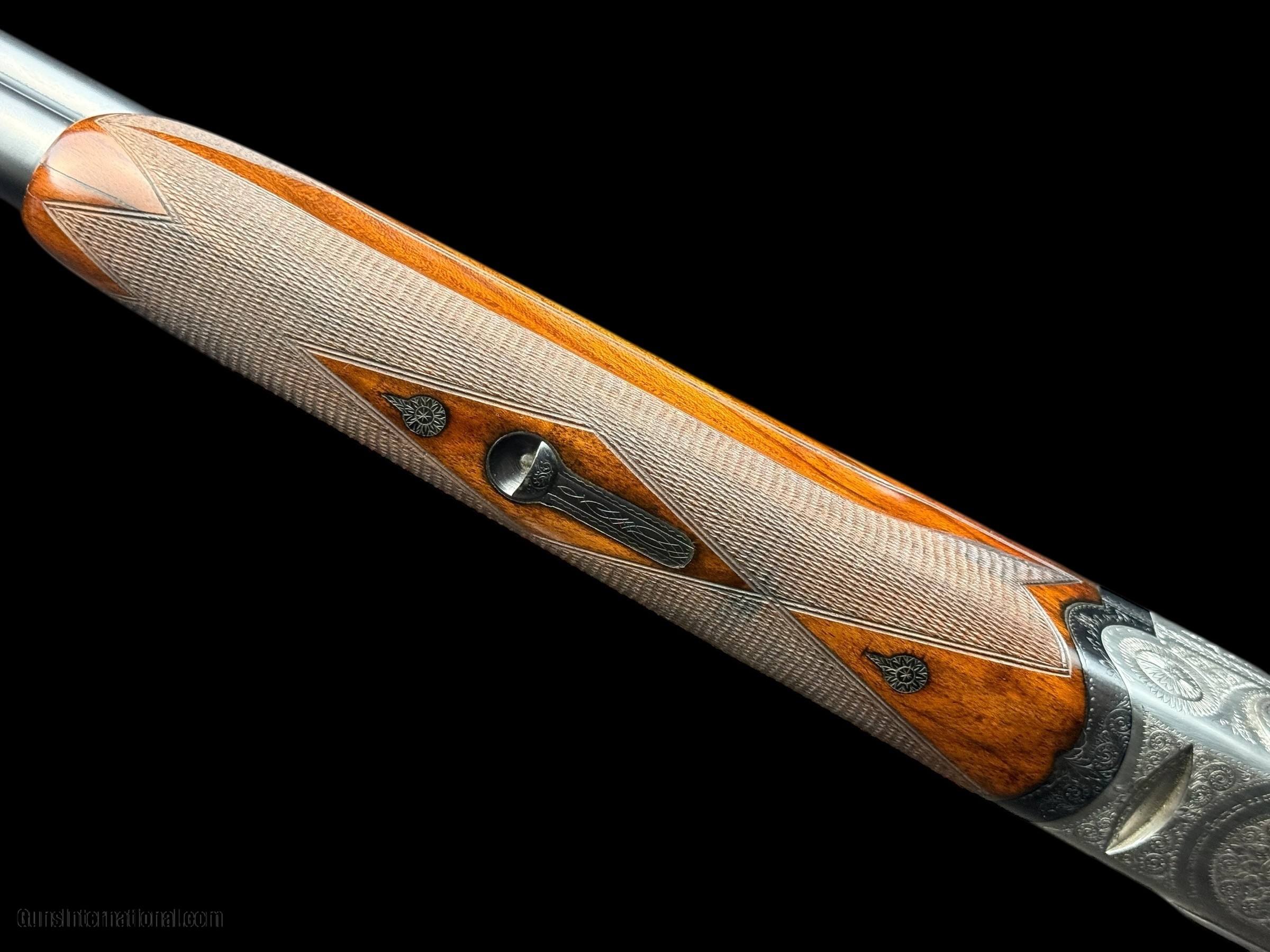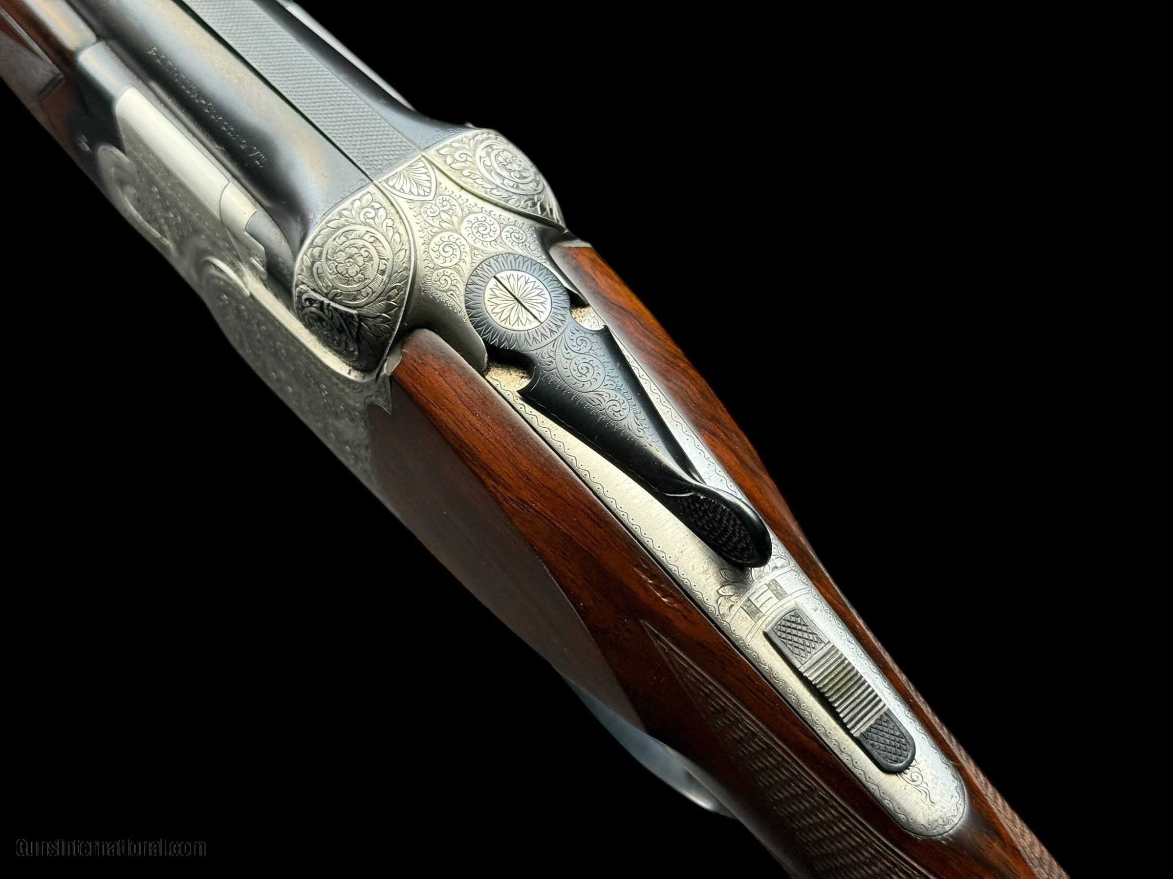 Description: BERETTA - ITALY - MODEL: AS-12-EL - SCROLL ENGRAVED BOXLOCK ACTION - GAS PORTED STRIKERS - 12G GA - 2 3/4" CHAMBERS - NITRO PROOF - 28" SOLID RIB BARRELS - CHOKES: IM / F SINGLE NON-SELECTIVE TRIGGER - NON-AUTO SAFETY - EJECTORS - NICELY FIGURED WALNUT STRAIGHT GRIP STOCK - BROWN RUBBER 1/2" BERETTA PAD - DIMS: LOP: 14 1/4" | DAC: 1 1/2" | DAH: 2 1/8" WEIGHT: 7LBS 1 OZ CONDITION: GUN IS IN EXCELLENT OVERALL CONDITION SHOWING LITTLE SIGNS OF USE. GENTLEMEN, THIS IS A BEAUTIFUL EARLY BERETTA AS-EL SHOTGUN. HARD TO FIND IN THIS CONDITION. PLEASE CALL NOW! FFL REQUIRED (C&R OKAY) FLAT $50 S/H/I CARD FEE APPLIES Curio/Relic: Yes Shotgun Gauge: 12 Gauge Manufacturer: BERETTA Model: AS-EL Serial Number: 20468 Barrel Length: 28 Chambers: 70MM / 2 3/4 Ejectors: YES Condition: EXC Metal Condition: EXC Wood Condition: EXC Bore Condition: EXC Action: BOXLOCK EJECTOR Triggers: SINGLE Proof:Nitro: YES Price: $3,850.00 Contact Seller |