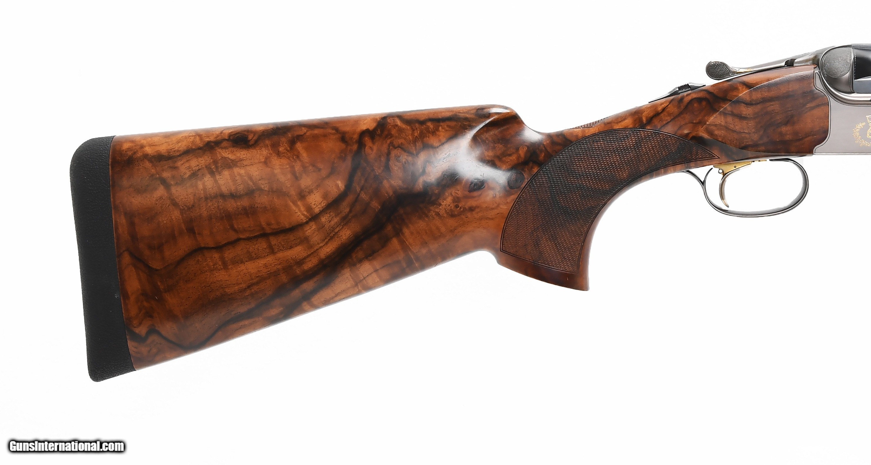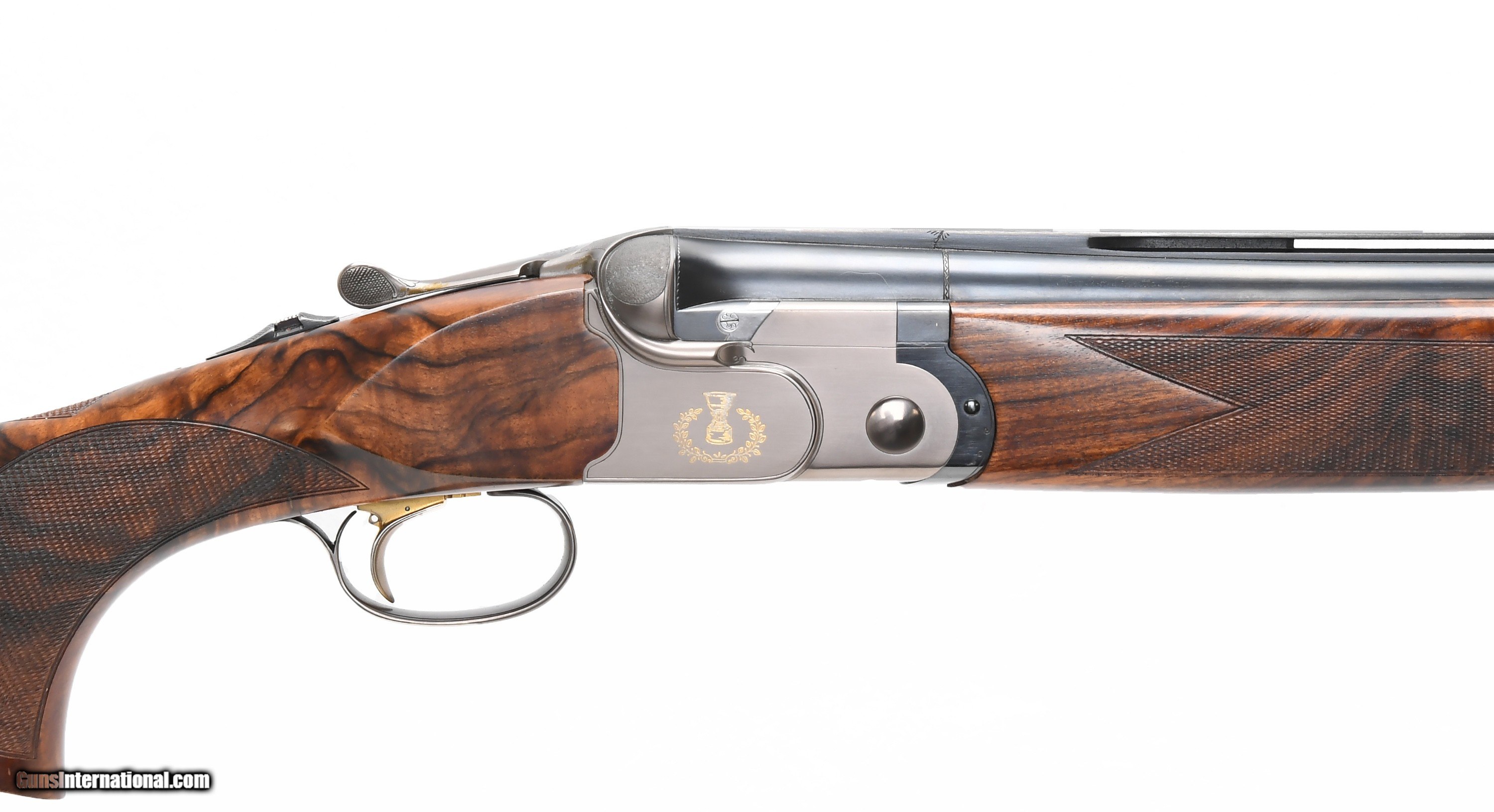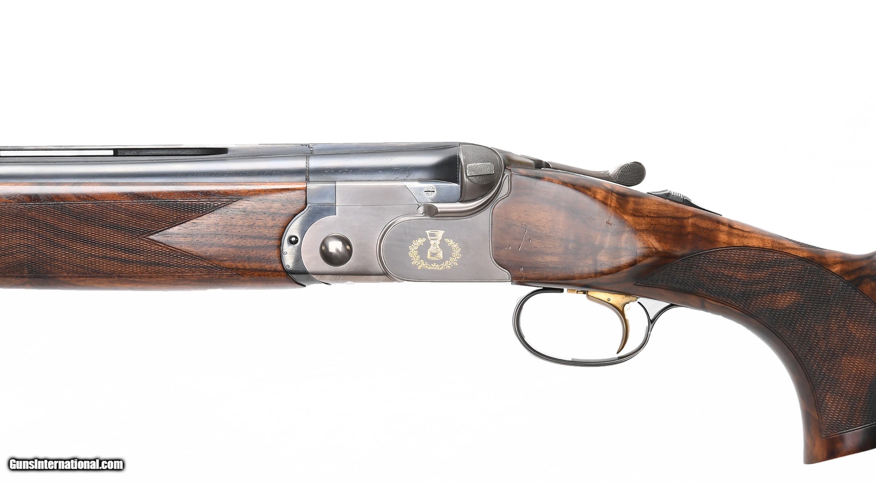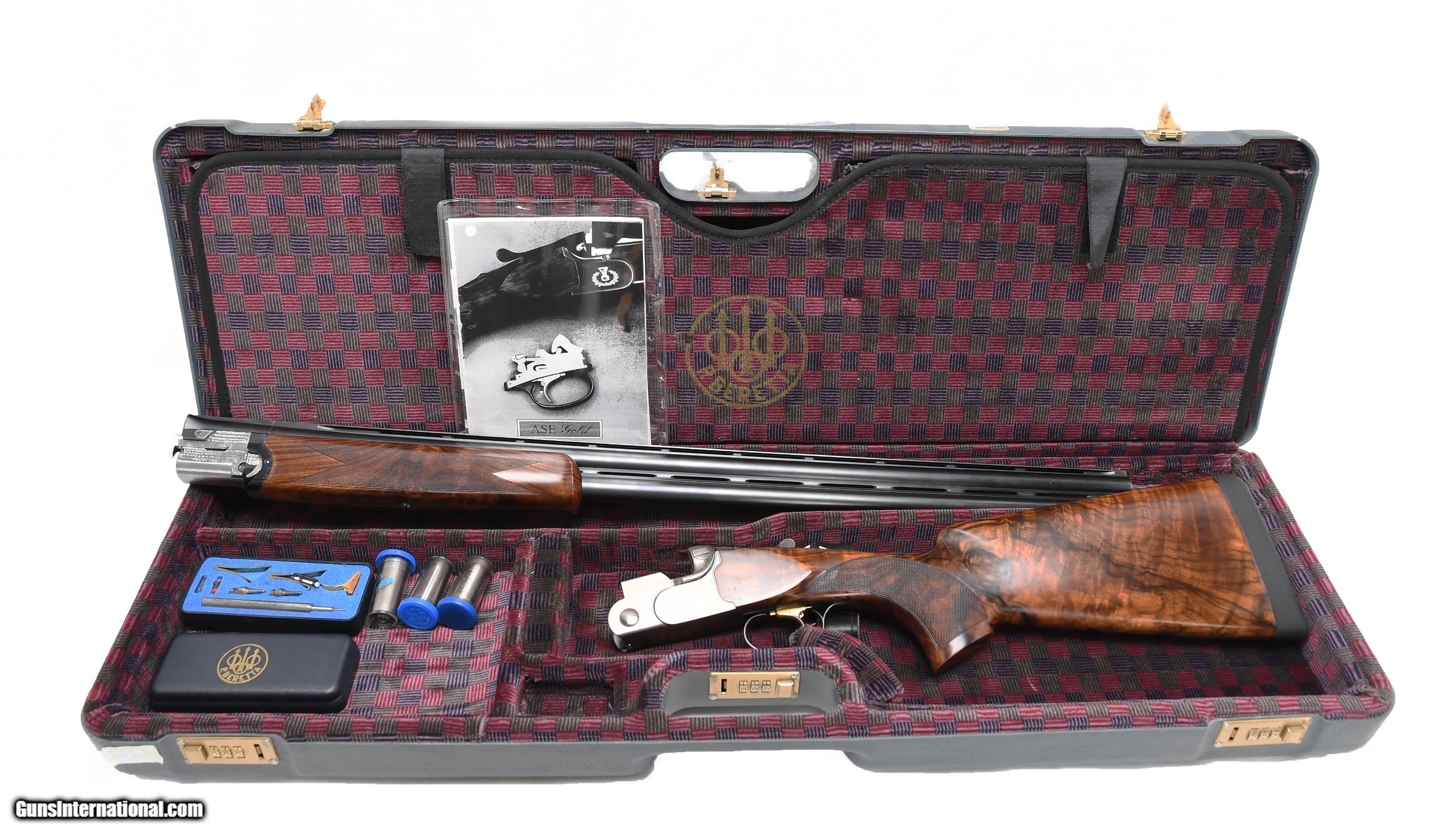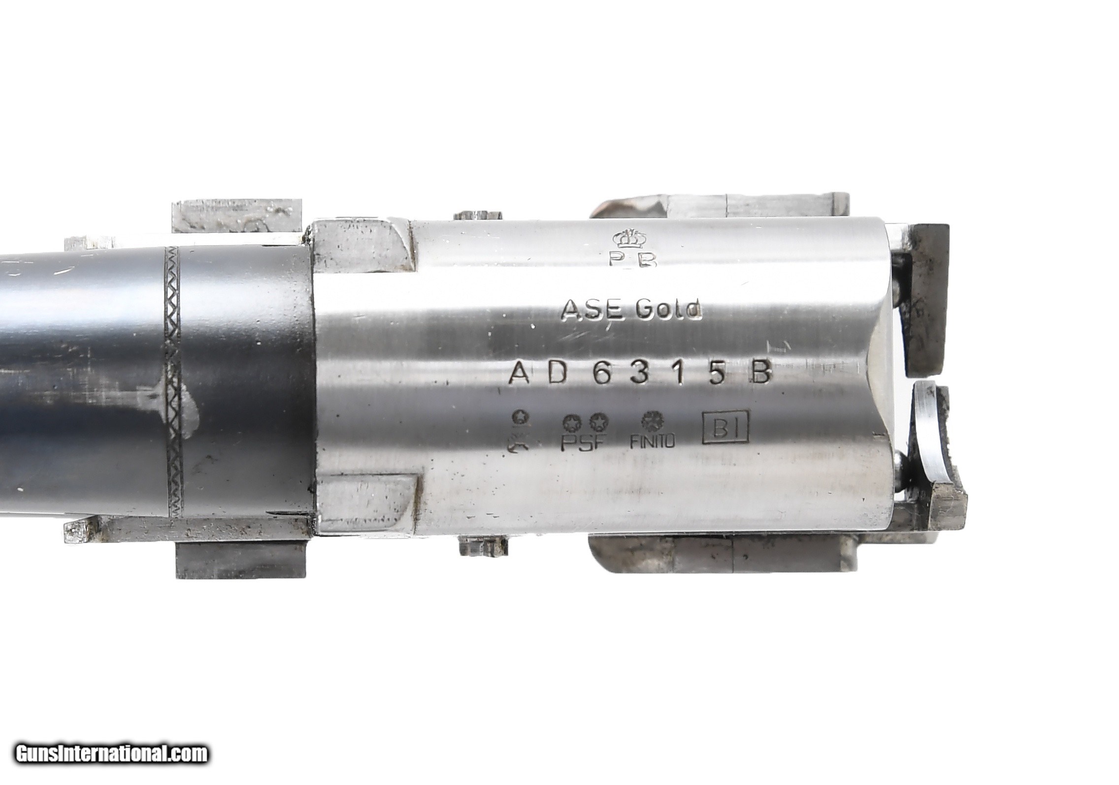 Description: Beretta ASE Gold 12 gauge O/U Sporting Clays shotgun. If you are unfamiliar with the ASE Gold then I will urge you not confuse an ASE Gold with an ASE 90! Made in 1997. The ASE Gold guns like this one came out of the Beretta Custom Shop or sometimes known as the SO shop where all of Beretta’s custom and hand fit-and-finished guns are fabricated. Everything about the ASE Gold is built to the very highest standards there are. The receiver is forged from a single block of steel. The barrels are made of the very finest steel available: Bohler Antinit Steel from Austria. The stock and forearm are exceptional. The removable, single selective trigger group is a work of art. The barrels are 30 ¾” barrels and fitted with Beretta Mobil Chokes with mirror bores of .725”. The vent rib tapers from 3/8” to 5/16” at the muzzle and is fitted with a red Bradley style from sight and no middle bead. Stock dimensions are 14 5/8” LOP over a 1” Beretta pad, 1 3/8” DAC, 2 3/16” DAH with RH palm swell and cast off 1/4” at the heel and 3/8” at the toe. The sporting forearm has a Schnabel front and a Deeley release. The really spectacular wood was upgraded by Cole Gunsmithing . The gun weighs 8 lbs. 7 oz. In the Beretta ASE Gold hard case is a parts box with 3 extra Beretta Mobil Choke Tubes and stock wrench with paperwork. Also included is a parts box with spare leaf springs, firing pins, a narrow trigger shoe (and tool), The condition of the gun is 98%+. It has been fired but not enough to really tell. There are a few fine scratches in the finish on the buttstock, left side near the receiver, see photos. These ASE Gold Sporting guns are very hard to find and when you do find one, they usually are not available for long. Oh, and once again, do not confuse and ASE Gold for an ASE 90!! $8,500.00 SN: AD6315B SOLD |