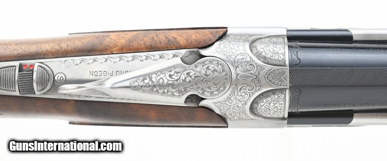 Description: Beretta Diamond Pigeon Texas Special 20 Gauge shotgun. Special order gallery gun with deluxe walnut stocks and Texas longhorn engraved side plate on the left side. Right side plate has a dog chasing quail scene. Barrels are 28”. L.O.P. with nicely checkered walnut pad is 14 5/16”. A handsome over/under Beretta gallery gun in excellent condition with case and chokes.